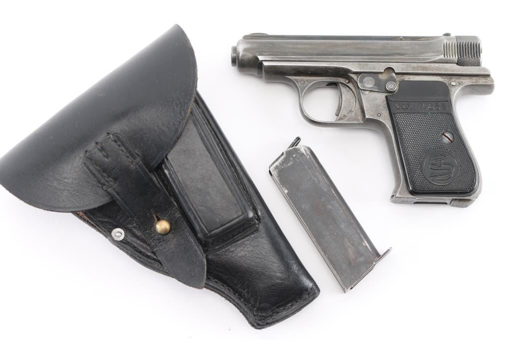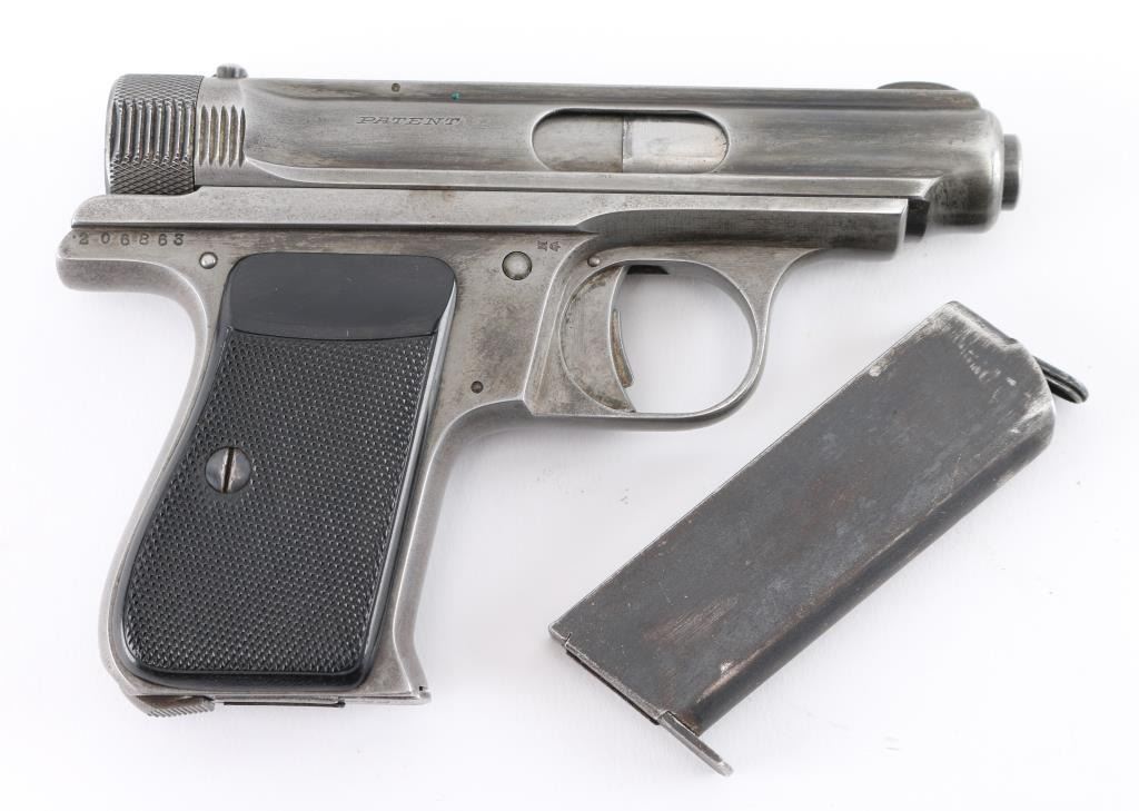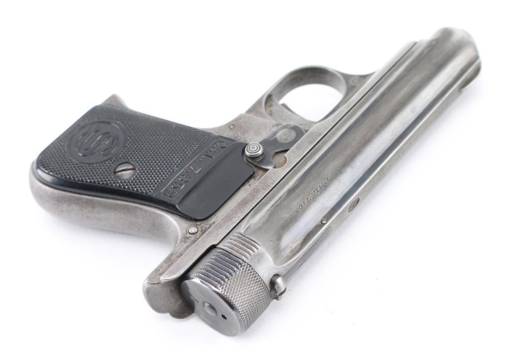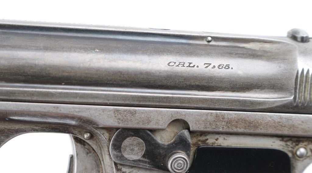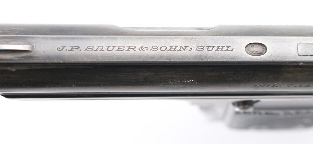 SN: 206863. Scarce Prussian Police "Behorden" (Authority) Model. "K in sunburst" Prussian Police proof on left triggerguard. Vintage German made striker fired compact pistol chambered in 7.65mm. Features a blued finish, 3" barrel, fixed sights, manual safety/slide stop on the left side of the frame, trigger safety, magazine disconnect safety, steel frame and two-piece checkered hard rubber grips. Left panel has Sauer monogram in circle, and "Cal. 7.65mm" across the top. Barrel rib stamped "J.P. Sauer & Sohn, Suhl. Right slide stamped "Patent". Right frame and cocking piece have Crown N proof and serial number. No import marks. Bore is very good, action is smooth, grips are excellent, pistol is in the white with tracers of blue in protected areas. Come with Sauer marked magazine, and repro German police/Military, maker marked, 1939 Berlin. NRA Condition- Fair to Good. C&R Forearm.