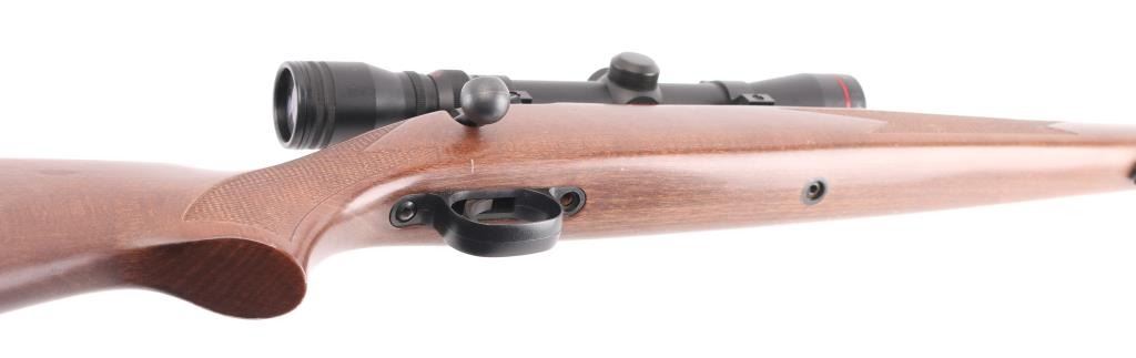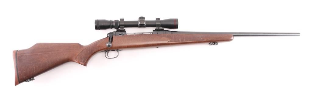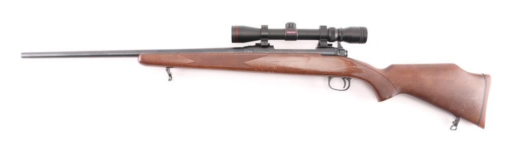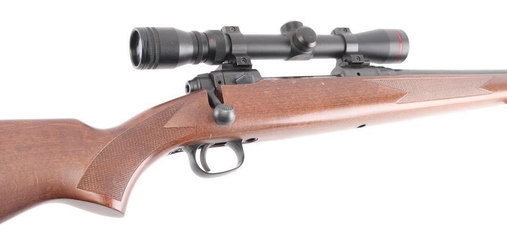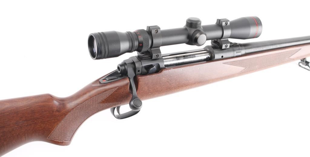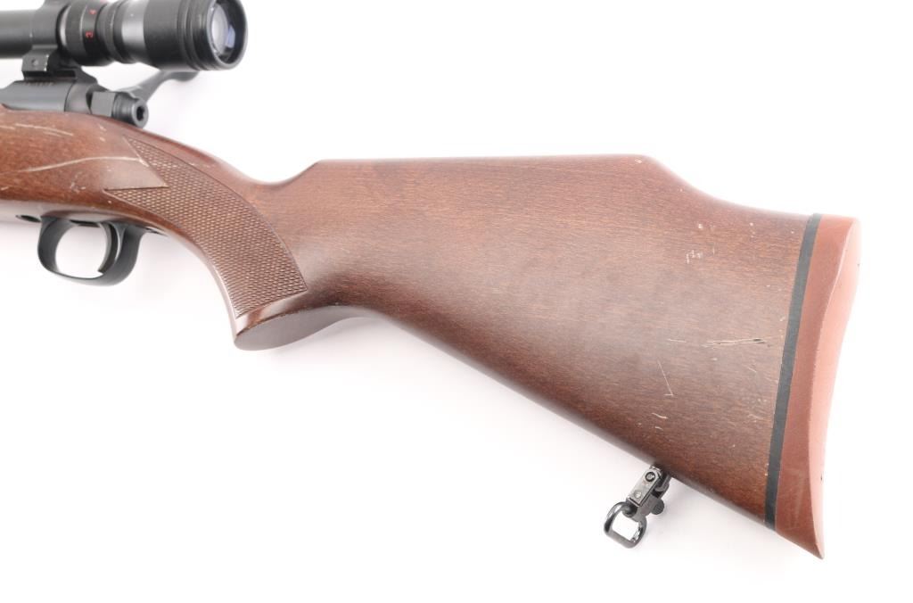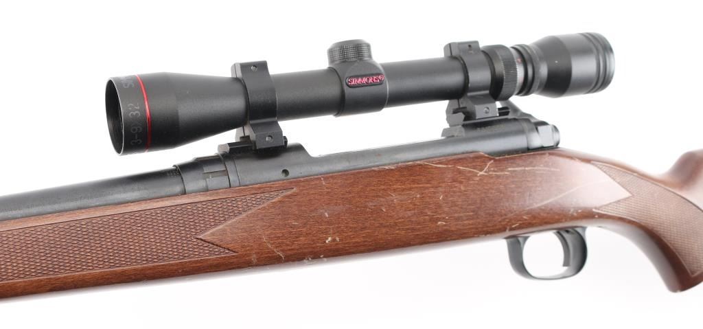 American made bolt action rifle, internal box magazine, blued with a black finish, approximately 22 1/2" barrel, bore is bright, no iron sights, Simmons 3-9x32 scope mounted on two rails, scope is bright and clear, smooth trigger, wood stock that is scratched and dinged, checkering on forend and pistol grip, two sling swivels, red rubber recoil pad, metal is pitted, LOP is approximately 13 1/2". Front trigger guard screw is missing. **NRA Poor** Modern Firearm