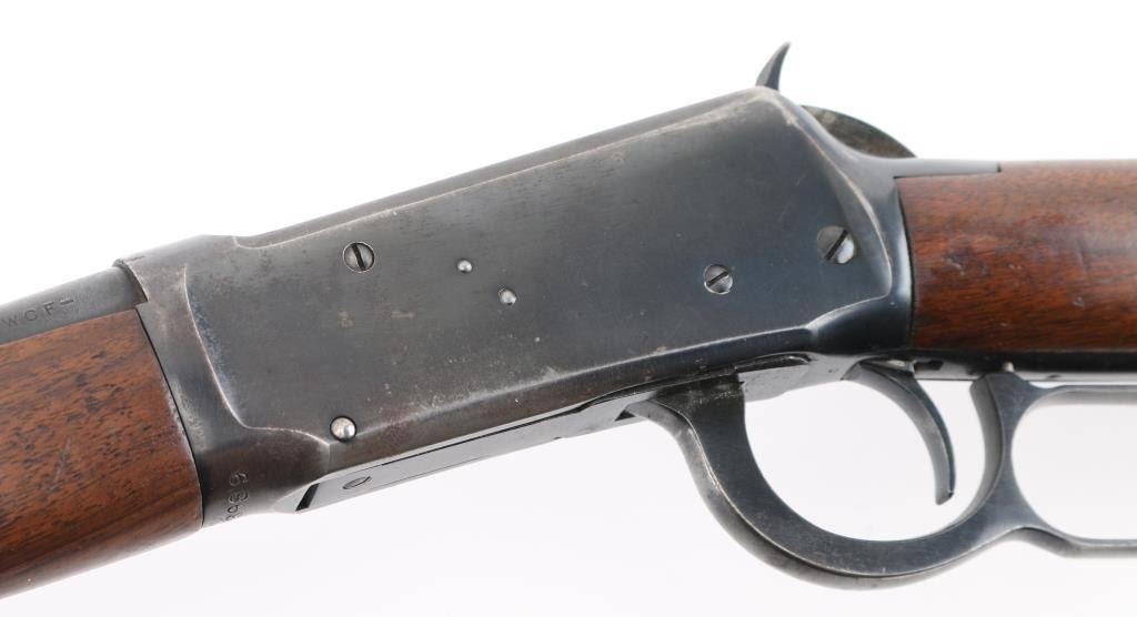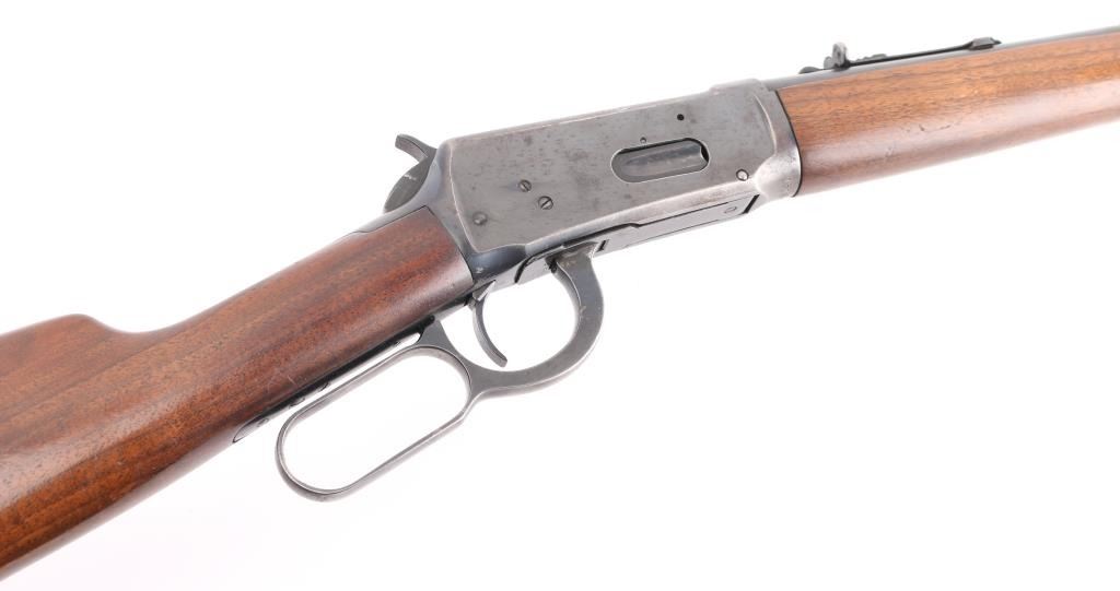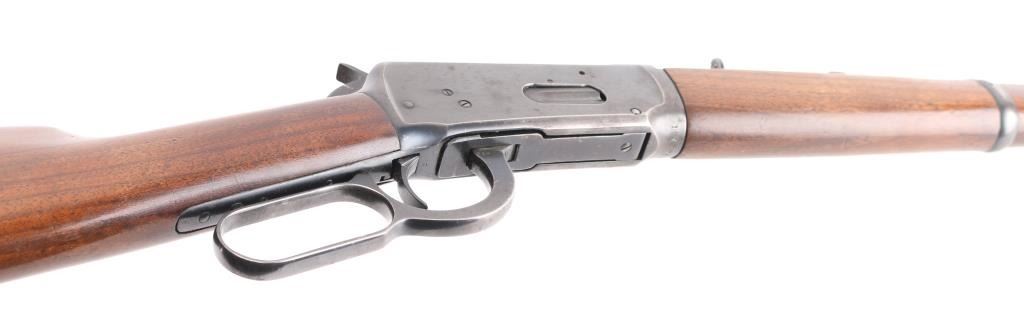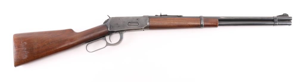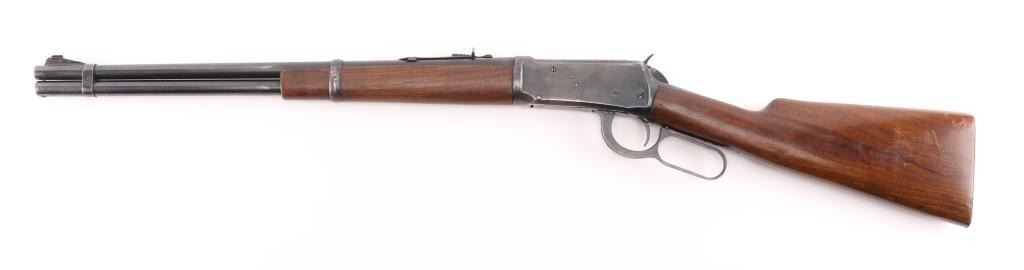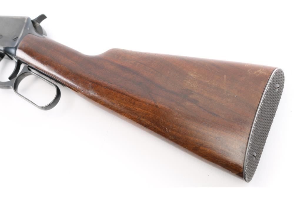 SN: 1513989. Eastern Carbine' Lever action rifle manufactured circa 1943-48. (No records). Features blued finish, smooth wood stock and forend, checkered steel buttplate, blade front sight with beaded top, sporting rear sight, 20" barrel with full length magazine tube underneath. Bore is very good condition. Retains 85% finish with scratches, edge losses, handling wear, a couple of areas of very light pitting on the receiver. Wood is very good condition with minor dents & scratches. Condition is NRA Good. C&R Firearm.