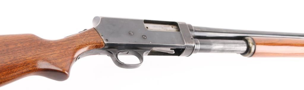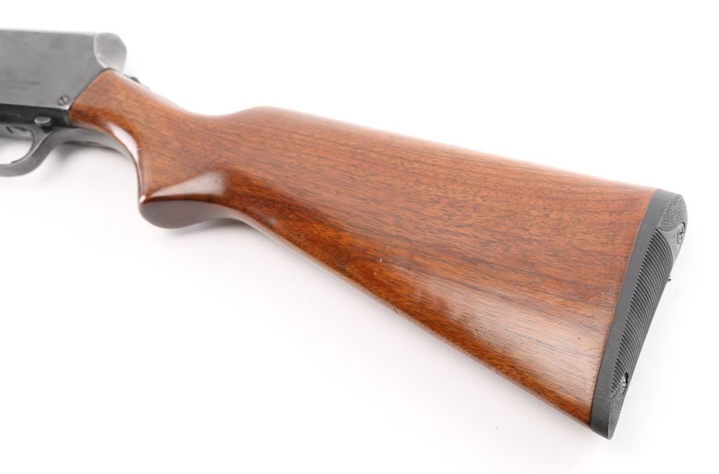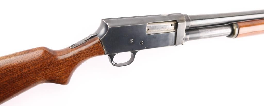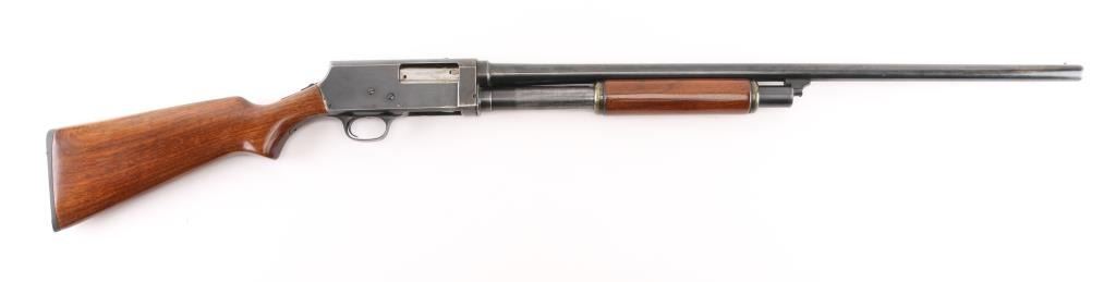 NVSN. Vintage slide-action repeating shotgun chambered for 16 gauge shells. Browning patent made by Stevens for Montgomery Ward. Features a blued finish, 28" barrel with a bead front sight, 2 3/4" chamber, IM Choke, half length tube magazine, steel hump-back receiver, smooth trigger, sliding tang safety, smooth walnut slide handle and pistol grip shoulder stock with Fajen buttplate 14" LOP. Bore is very good. Metal finish looks good with some scuffs on the receiver, blue has dulled but is mostly all there, with friction wear on the tube. Action is smooth/tight. Wood is very good. NRA Condition-Very Good. C&R Firearm/