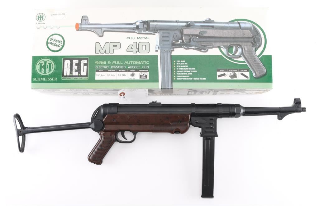 The Cybergun Schmeisser MP40 is a replica of the German Wehrmacht Schmeisser machine pistol that was regarded as one of the best submachine guns ever designed. This famous WWII German SMG ... the MP40 is made entirely from stamped sheet metal just like the real version. The folding metal stock is quite heavy, and is actuated by a large button at the rear of the receiver. Most of the internal hardware is constructed from metal, including the nozzle and cylinder - which is a departure from the plastic bellows-type cylinders found on other AEG's. Electric powered. Comes in factory box with manual, cleaning rod, charger. Like new condition.