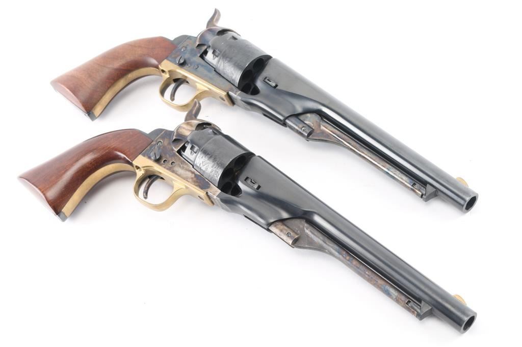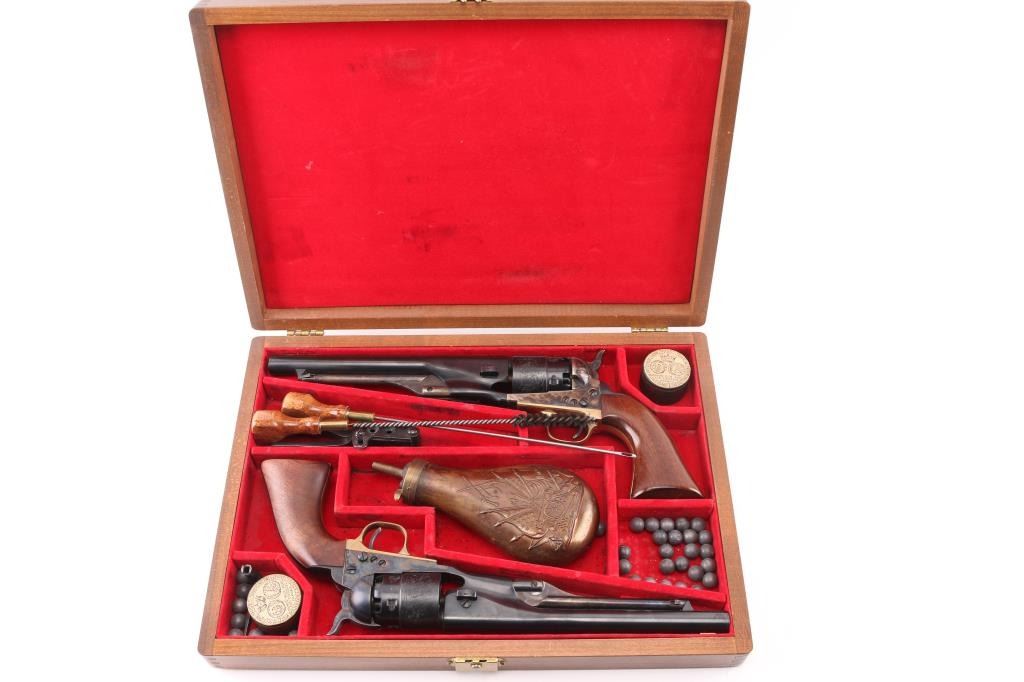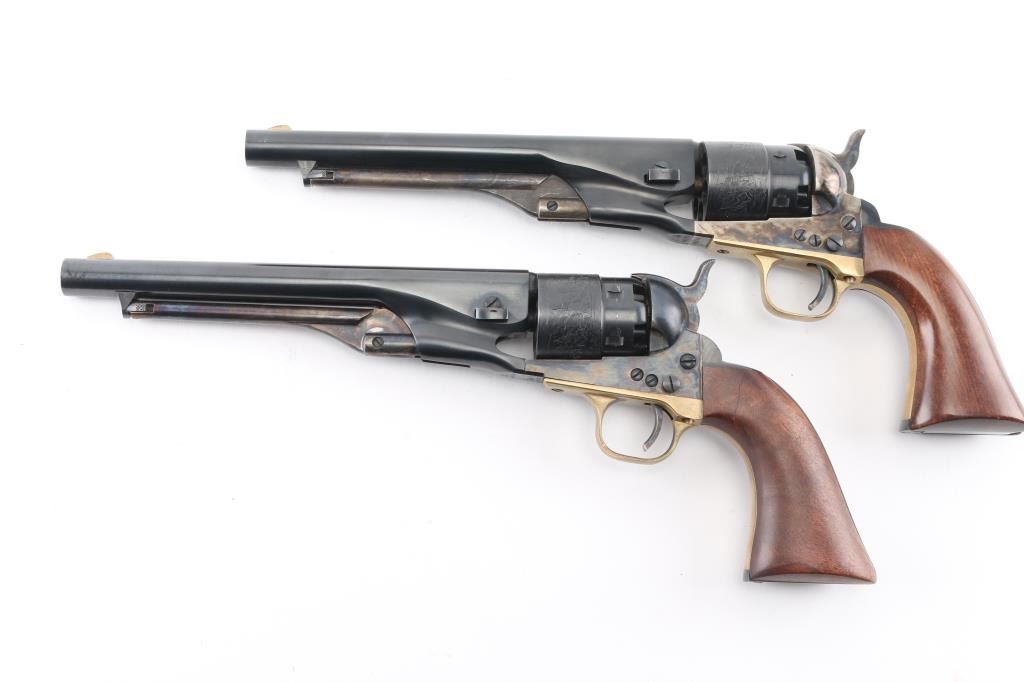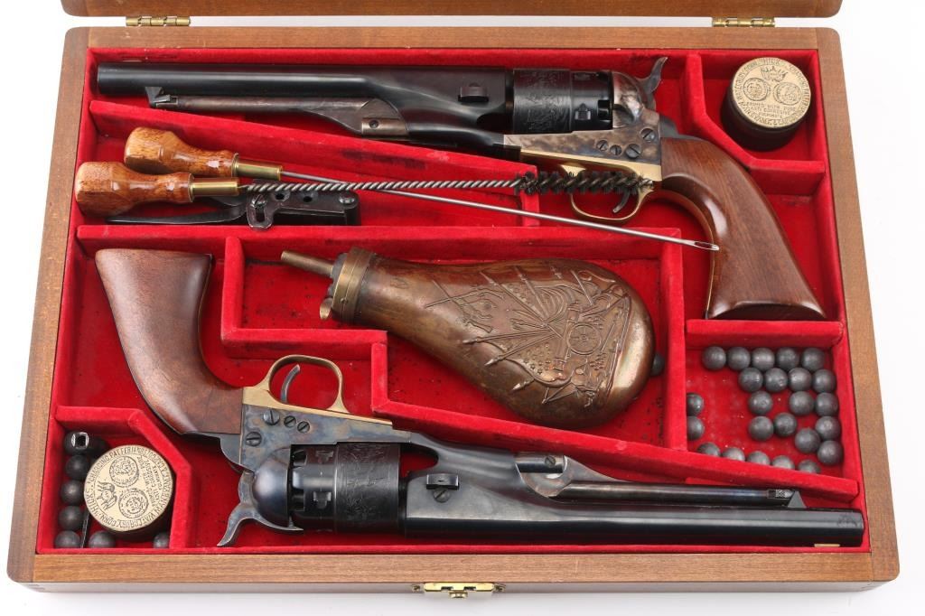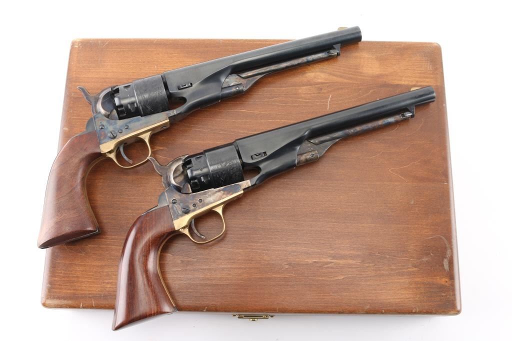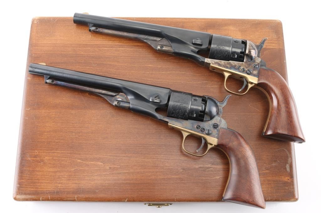 SN:B642290 Made in Italy by ASM. Cased set of two Model 1860 Army revolvers, manufactured 1986. Blued finish, brass triggerguard, case hardened frame, lever, and hammer. Both in very good condition, bores are very good, but dusty, actions work excellent, metal finish has some minor scratches, and tracking on the cylinders, grips are excellent. Naval engagement scene on cylinders. 8" barrels. They come in a fitted red velvet lined wood case with bullet mould, cleaning gear, powder flask, nipple wrench, bullets, and cap boxes. all in very good condition, case has some scuffs. A really nice set. NRA Condition-Very Good. Antique Firearms.