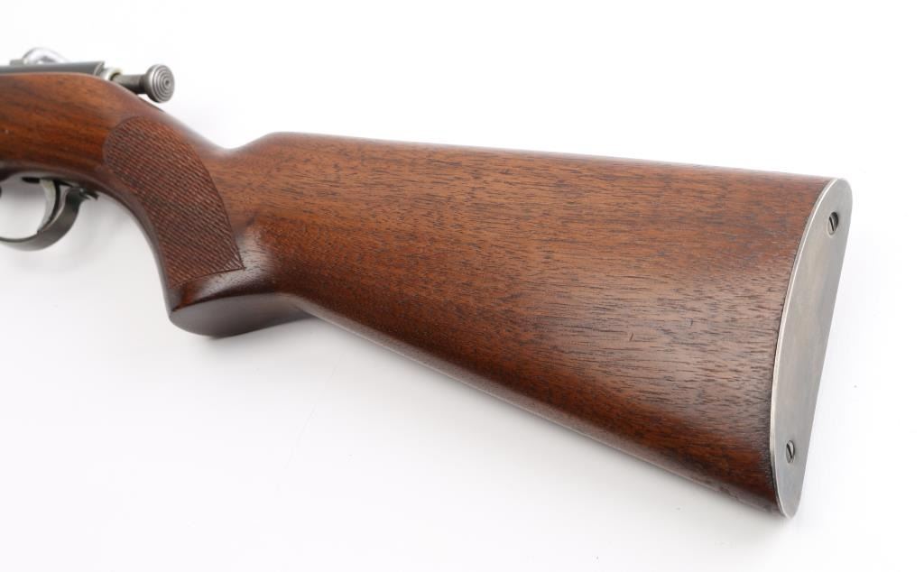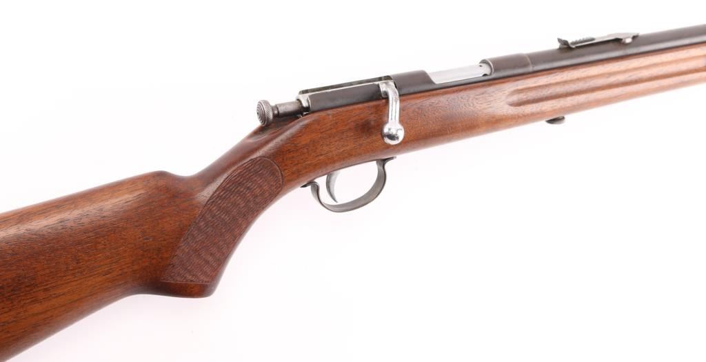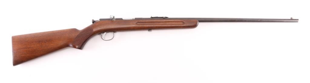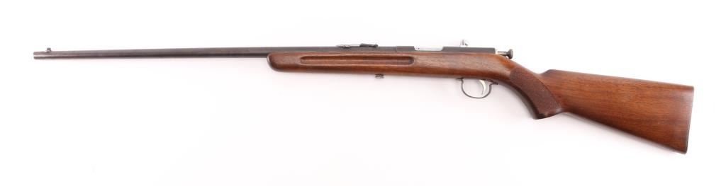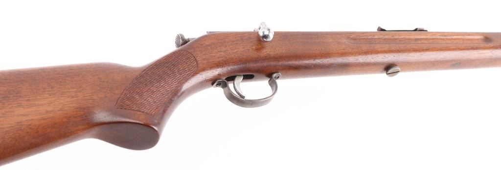 Single shot bolt-action sporting rifle chambered for .22 S/L/LR, produced between 1932 and 1936. It features a blued 24" barrel, dovetailed front blade sight, adjustable rear sporting sight, bent bolt handle, a one piece American walnut shoulder stock with grooved forend & metal buttplate, & checkered grip. Finish has worn to a mostly even brownish/grey patina. Bore looks very good, needs cleaning, wood is very good