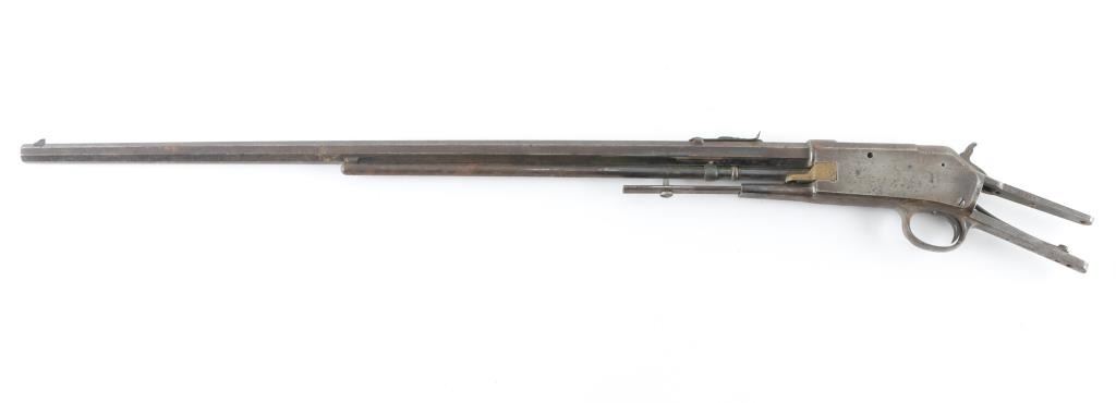 Relic Condition pump action rimfire rifle manufactured circa 1903. Features 24" octagon barrel, half length magazine tube, blade front & sporting rear sights. Missing wood, tang screws, maybe other smaller parts. Metal finish is brown color, thin rust and patina all over. Bore is poor, rusty throughout, with visible rifling. Action parts do move, although stiff with corrosion. ***FOR PARTS OR REPAIR OR DISPLAY ONLY*** Condition is NRA Poor *** C&R Firearm ***