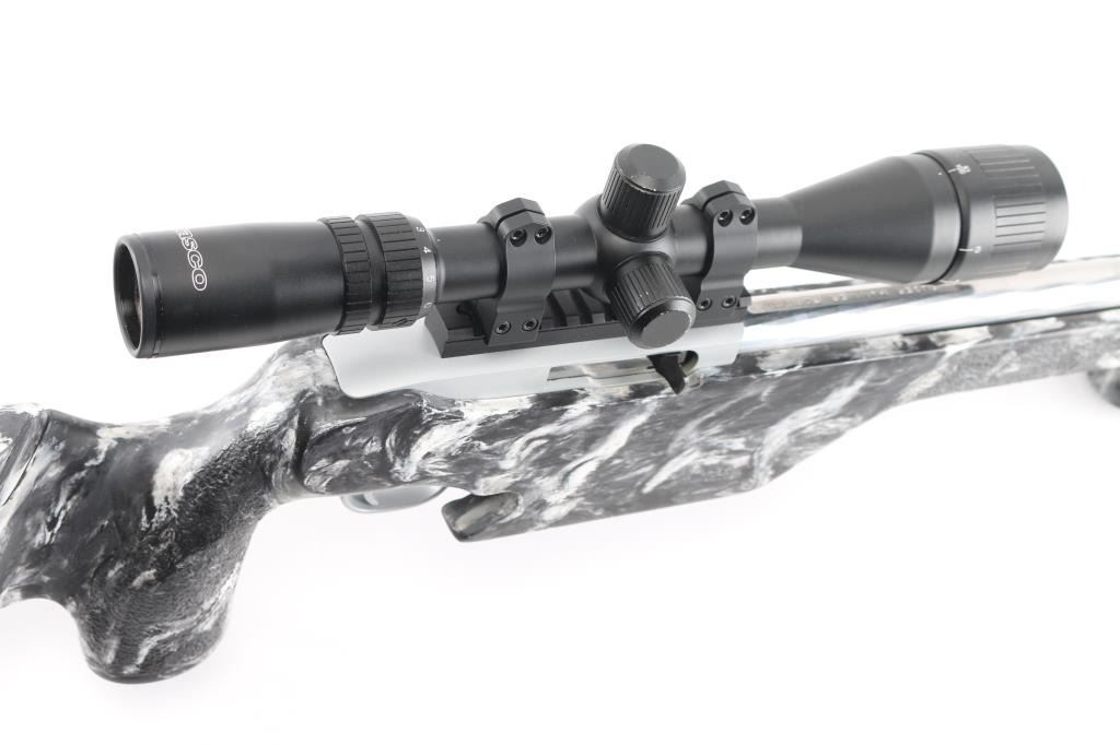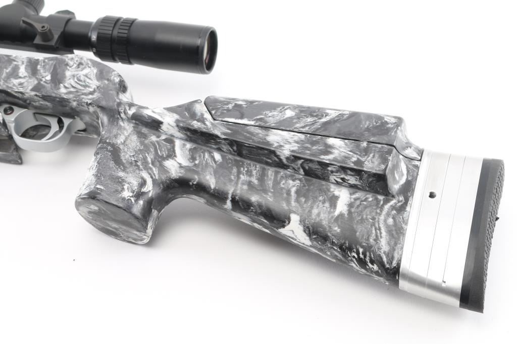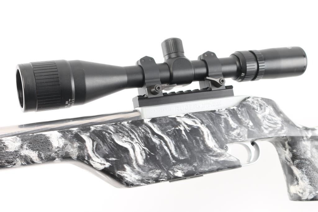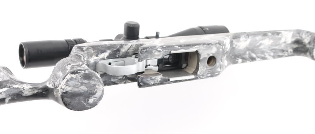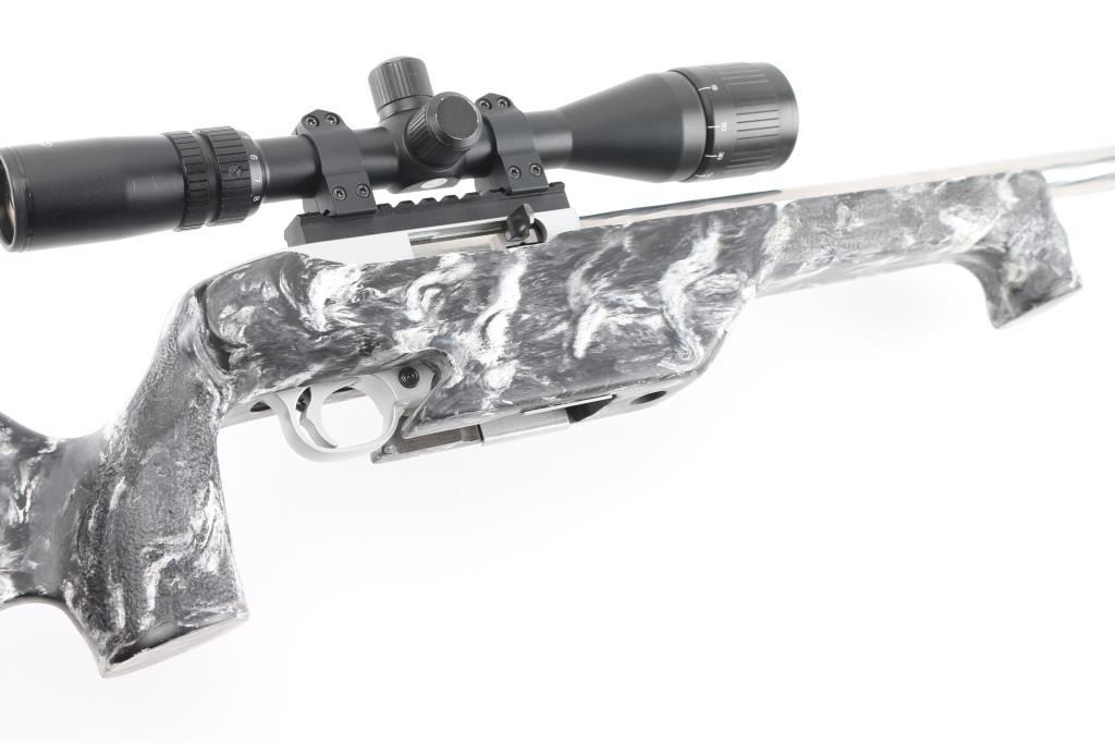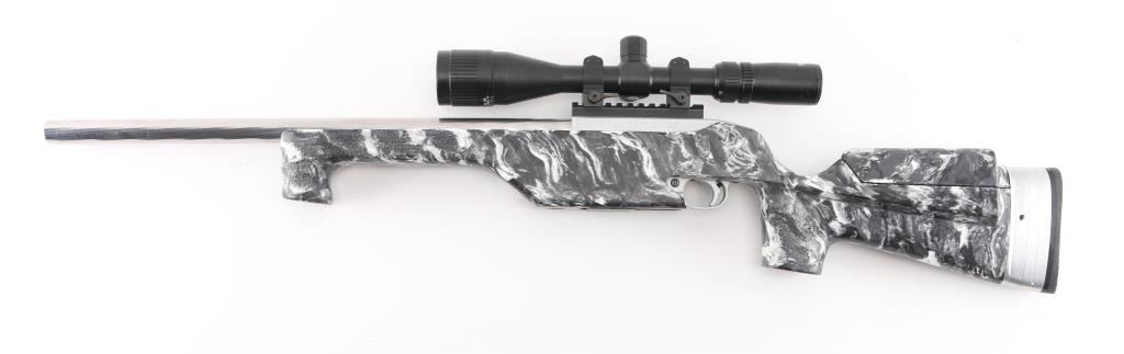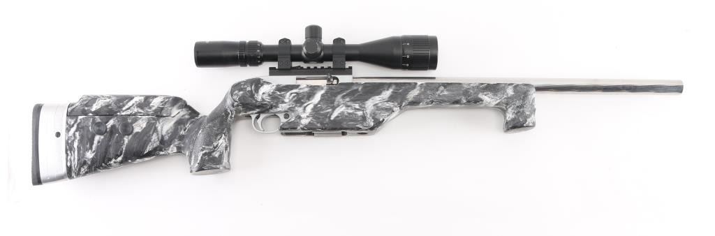 Customized semiautomatic target or competition rimfire rifle. Stainless steel construction, 20" hammer forged Ruger bull barrel, black Picatinny rail mounted to receiver, push button safety. Stock has McMillan marked rubber butt pad, appears to be a McMillan composite, with gray & white marbled color, textured panels at wrist & forend, short forward vertical grip or hand stop, vertical grip area, deep magazine well chute with aluminum reinforced inside walls, right hand cheek piece, adjustable comb, removable aluminum inserts for changing length of pull. Barrel channel bedding is tight bedded for about two inches under chamber area, remainder of barrel is free floated. Mounts a Tasco 3-12x scope with adjustable objective, duplex reticle, clear view. Rings are lever throw quick detach style. Bore is excellent. Overall like new condition with few handling marks. One 10 rd magazine. Condition is NRA Excellent - like new **** Modern Firearm ***