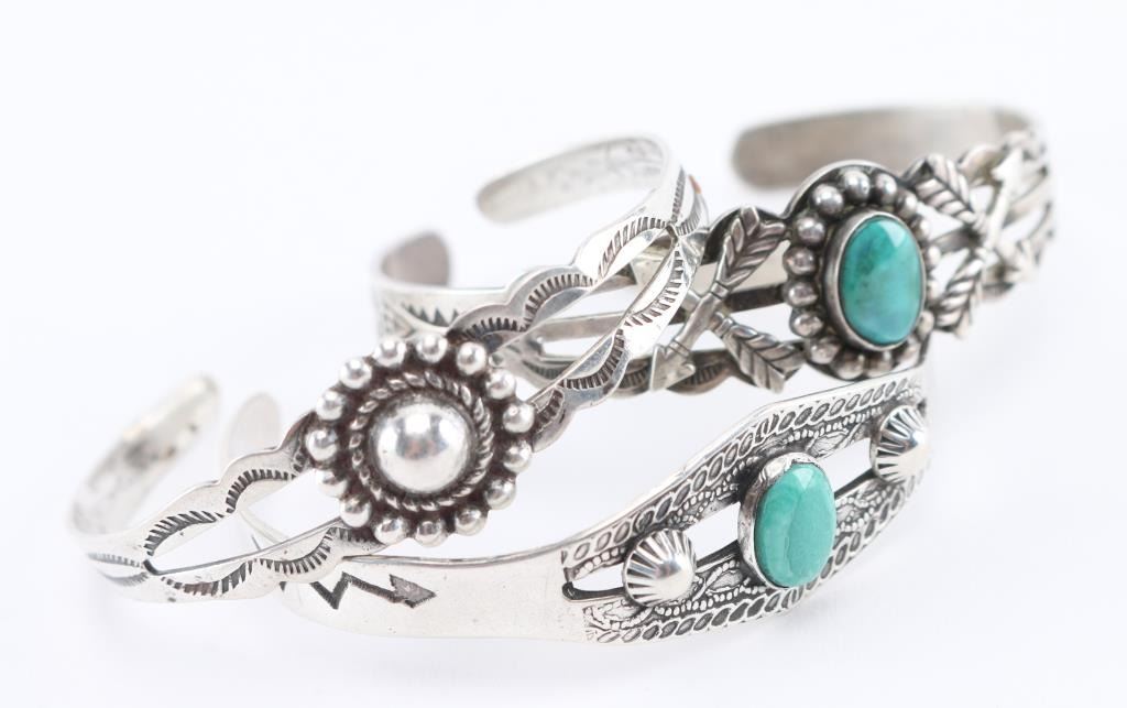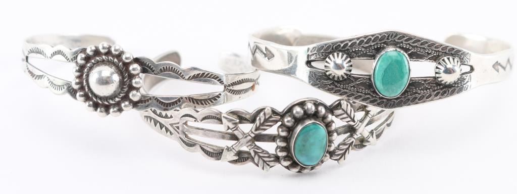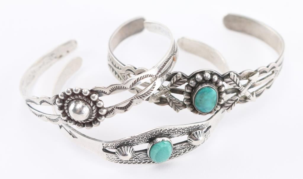 (1) Sterling Fred Harvey Cuff (1) Fred Harvey bracelet with center turquoise stone (1) Nickel Cuff with turquoise stone