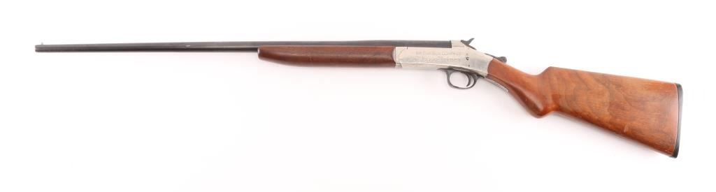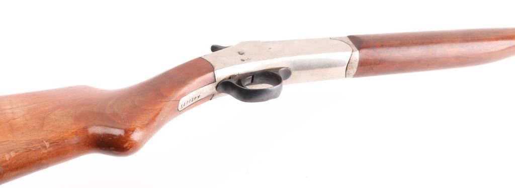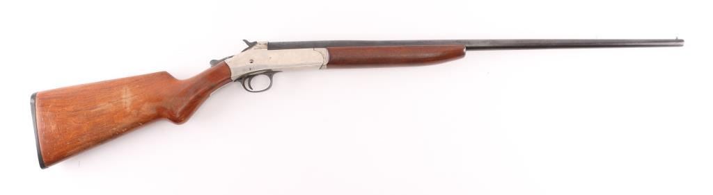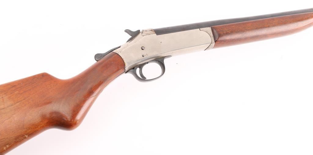 SN: A972973. Trade name (made by the Crescent Firearms Co 1892-1932) break-open single shot shotgun chambered for .410 gauge shells. Features a blued 26" barrel, auto-ejector, bead front sight, nickel plated receiver, smooth trigger, checkered top lever & hammer spur, smooth wood forend and pistol grip shoulder stock with serrated black plastic buttplate. Blued barrel is very good with minor scratches/rubs, receiver is flaking around the tang, with some scattered spots of surface rust. Action is strong, bore is very good/bright, and wood stocks are good/sound Condition NRA Good. C&R Firearm.