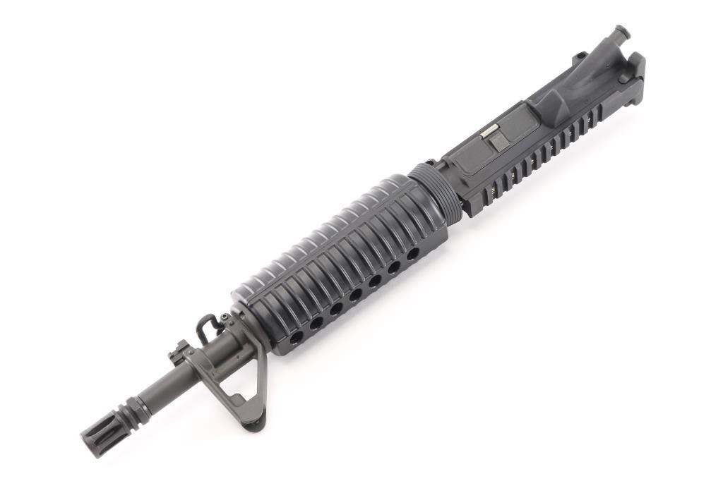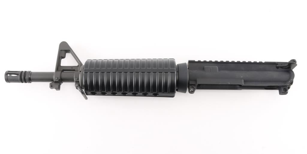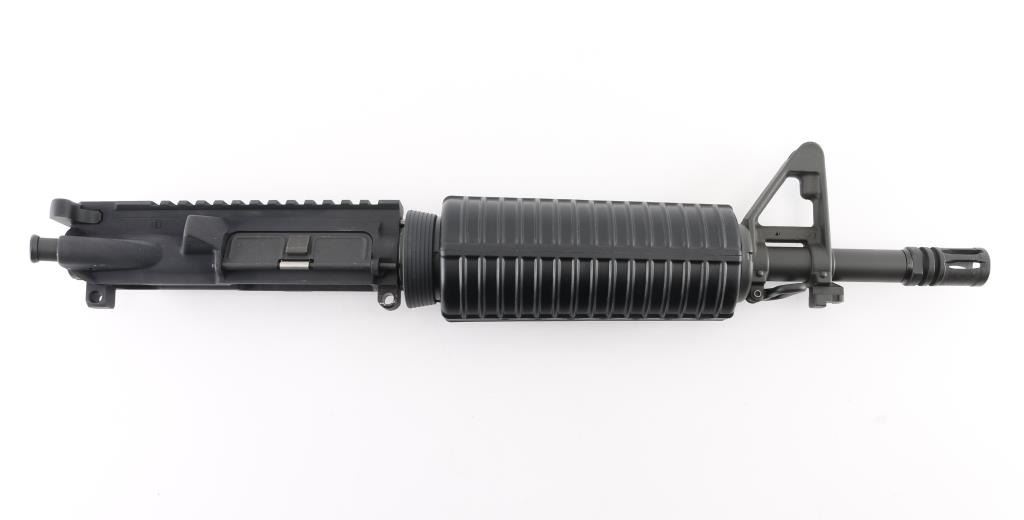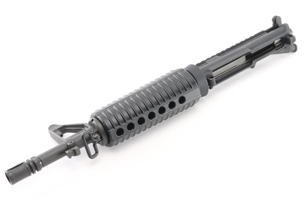 "T" marked flat-top upper with chrome-lined heavy 11.5" barrel w/ 1:9 twist, A2 flash hider, A2 front sight base with elevation adjustable post front sight, bayonet lug, forward assist, shell deflector, dust cover, mil-spec charging handle, M16 cut bolt carrier group and carbine length ventilated black polymer handguards. Upper exhibits no major signs of use or wear. Condition is Excellent.