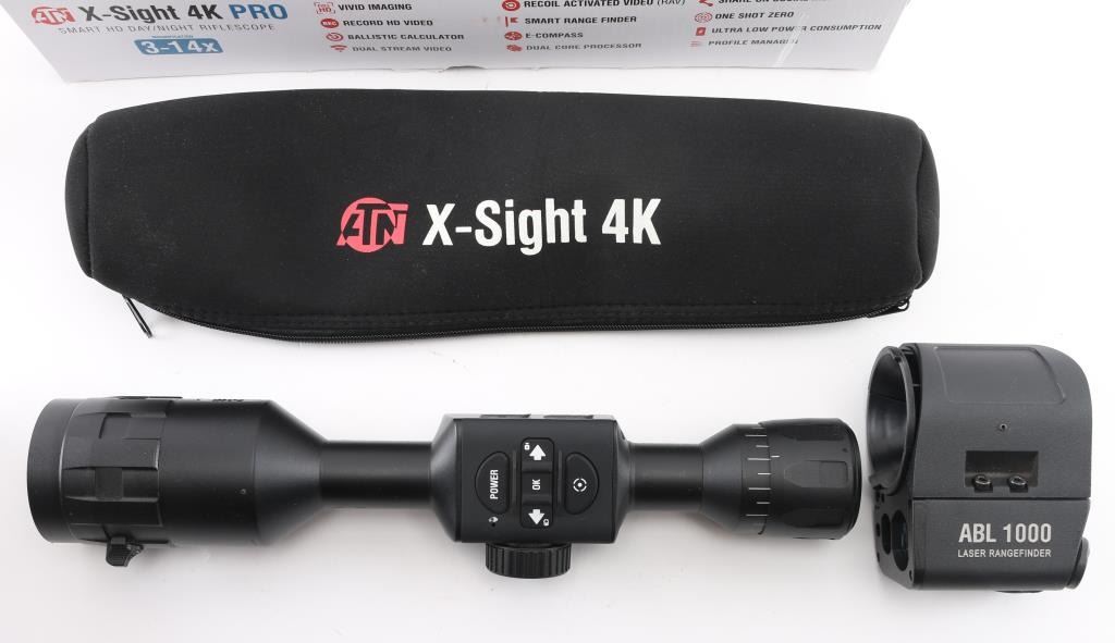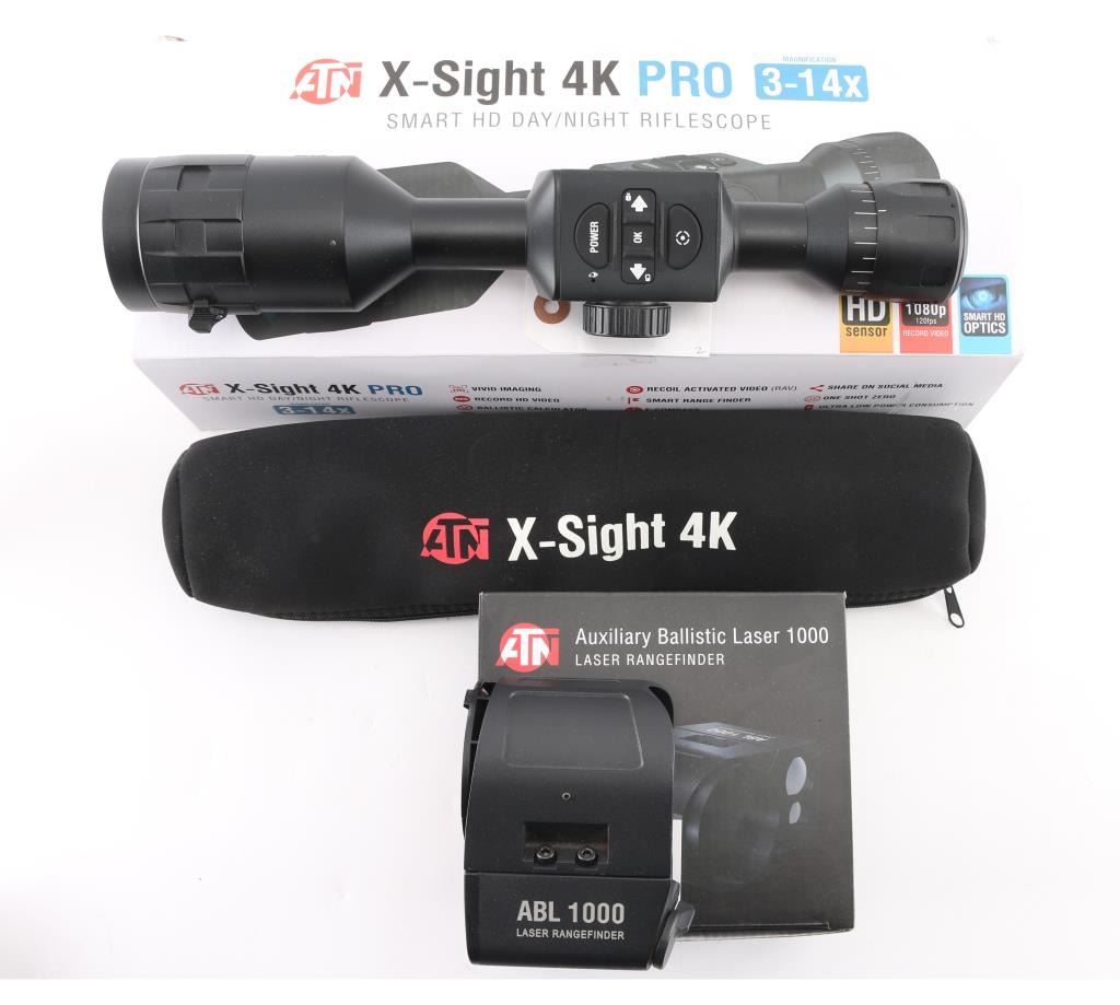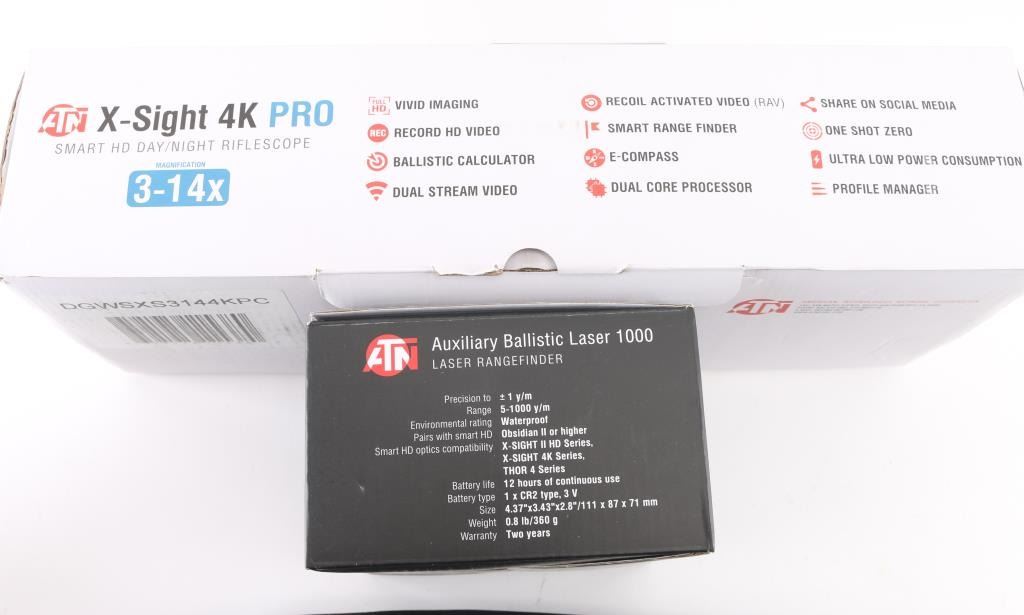 Both items like new in the original boxes, not tested for function (scope does turn on and show a clear image). ATN 3-14x HD Day & Night scope incorporates range finding, compass, recording functions. Auxiliary Ballistic Laser 1000 works with the scope, sending range data to allow the scope to make instant POI adjustments.