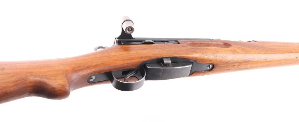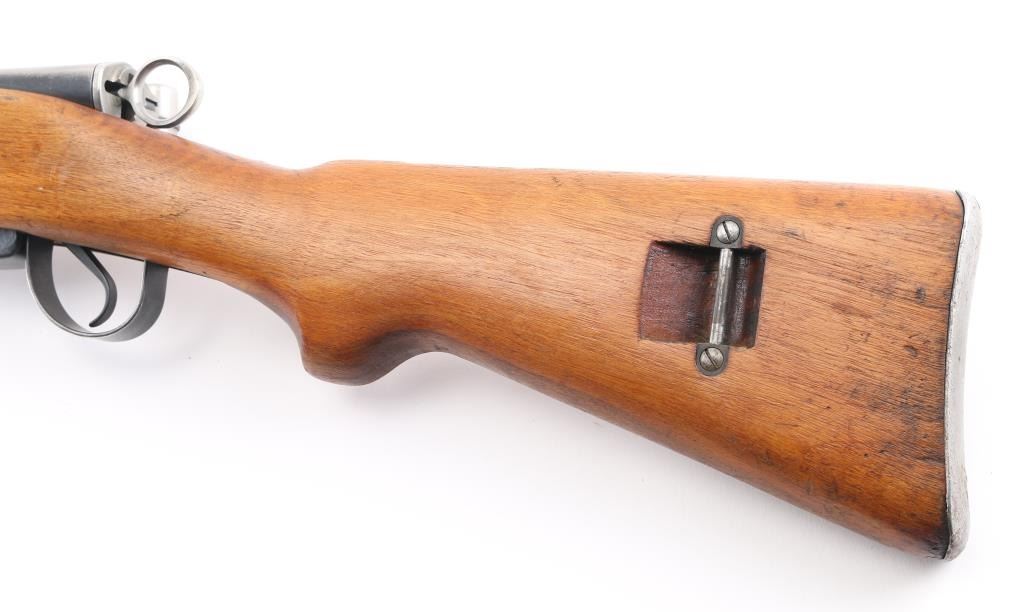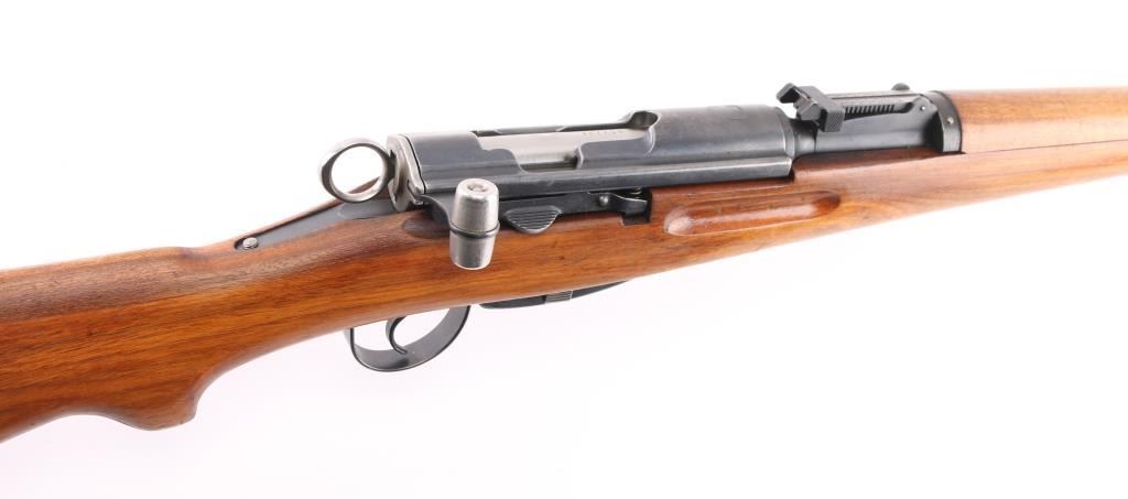SN: S-M657794 'Schmidt–Rubin' Swiss military straight pull bolt action rifle imported by CAI, Georgia VT. Features blued finish, wood semi pistol grip stock, 25" barrel, bayonet lug, stacking hook, blade front sight inside protective ears, tangent rear sight, sling swivels, detachable magazine, manual safety, "beer barrel" shaped aluminum bolt knob. Bore is very good condition. Retains 90% coverage of blued finish, showing edge losses & handling marks. Bolt assembly is mostly bright polished, some blued pieces, overall in very good condition. Stock is very good condition, with small dents and scratches, possibly lightly sanded, thin varnish finish, staining visible near buttplate. Bolt and barrel numbered to receiver, magazine and rear band mismatched. Importer marks under barrel, importer added "S-M" prefix to serial number. Condition is NRA Very Good *** C&R Firearm ***