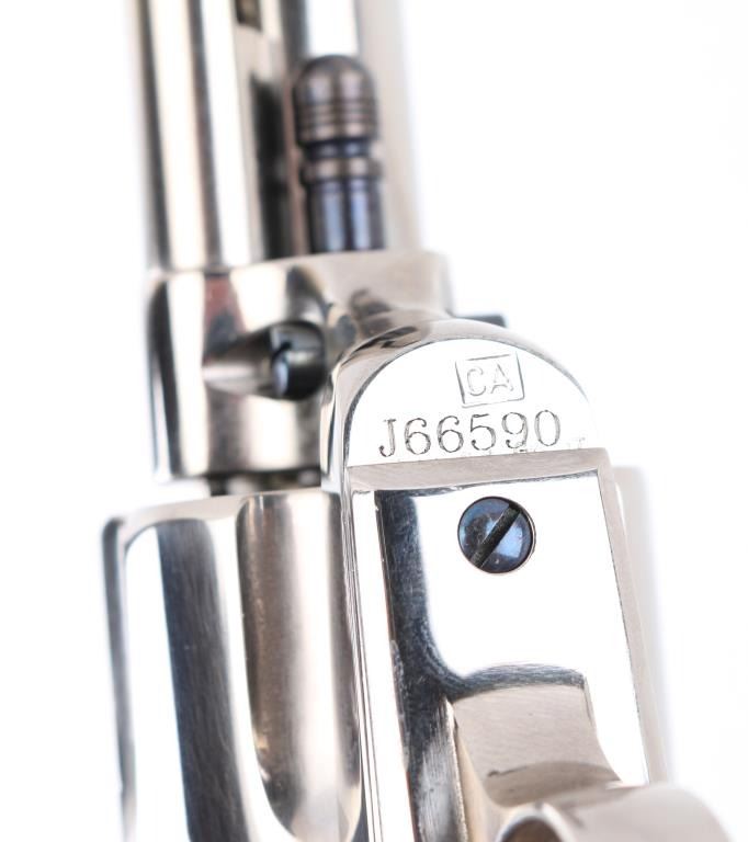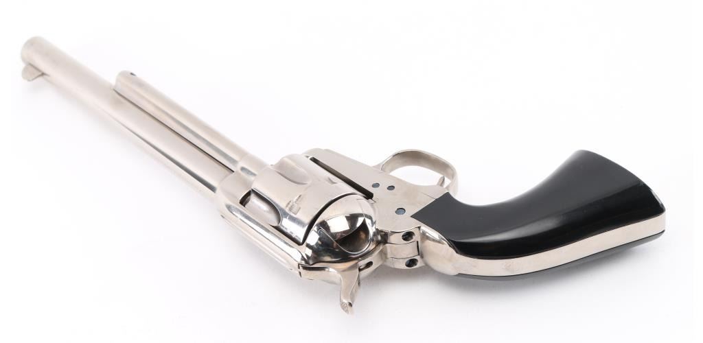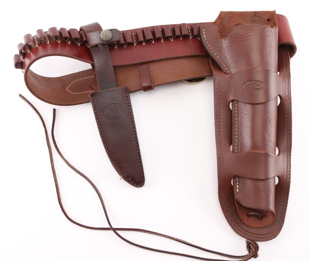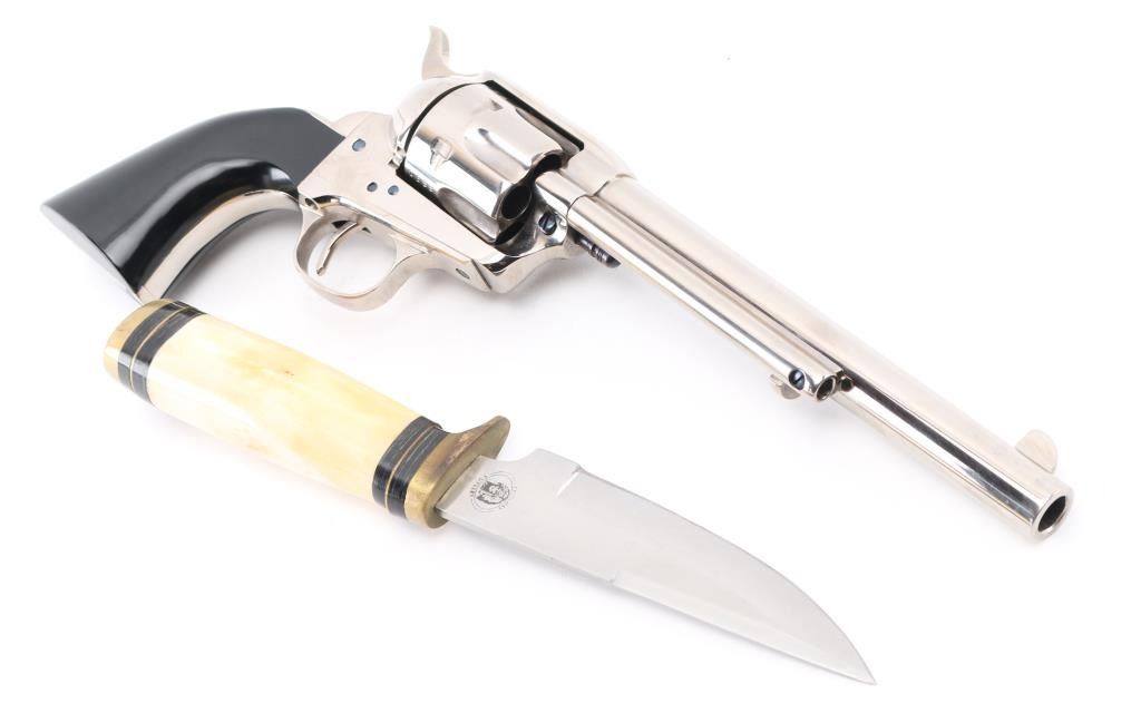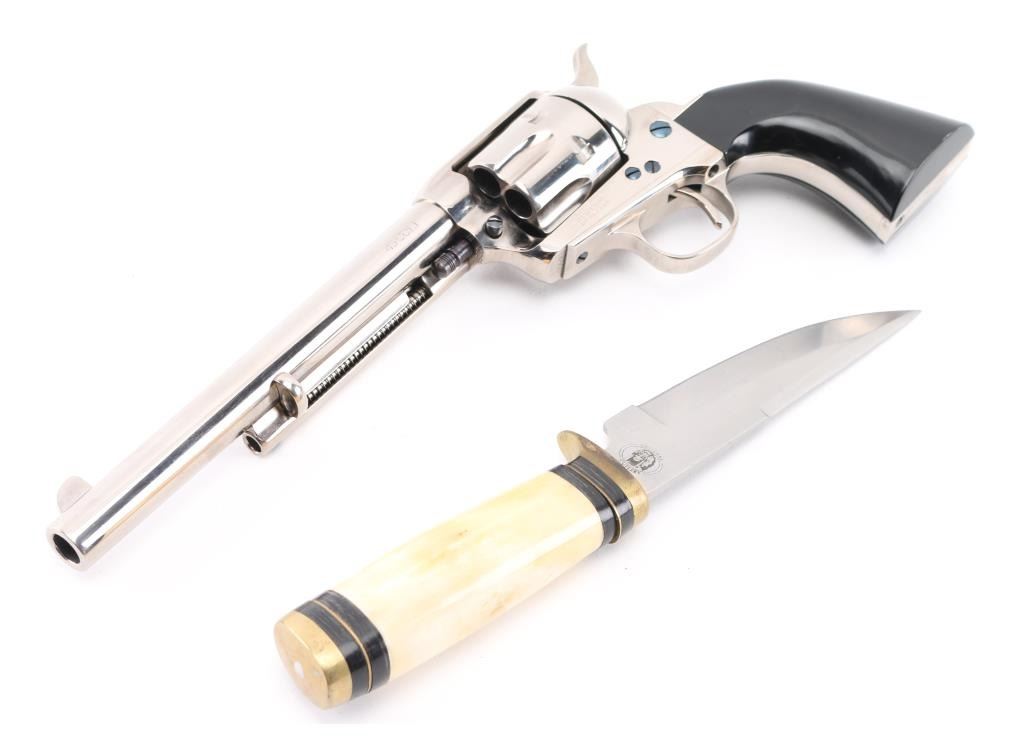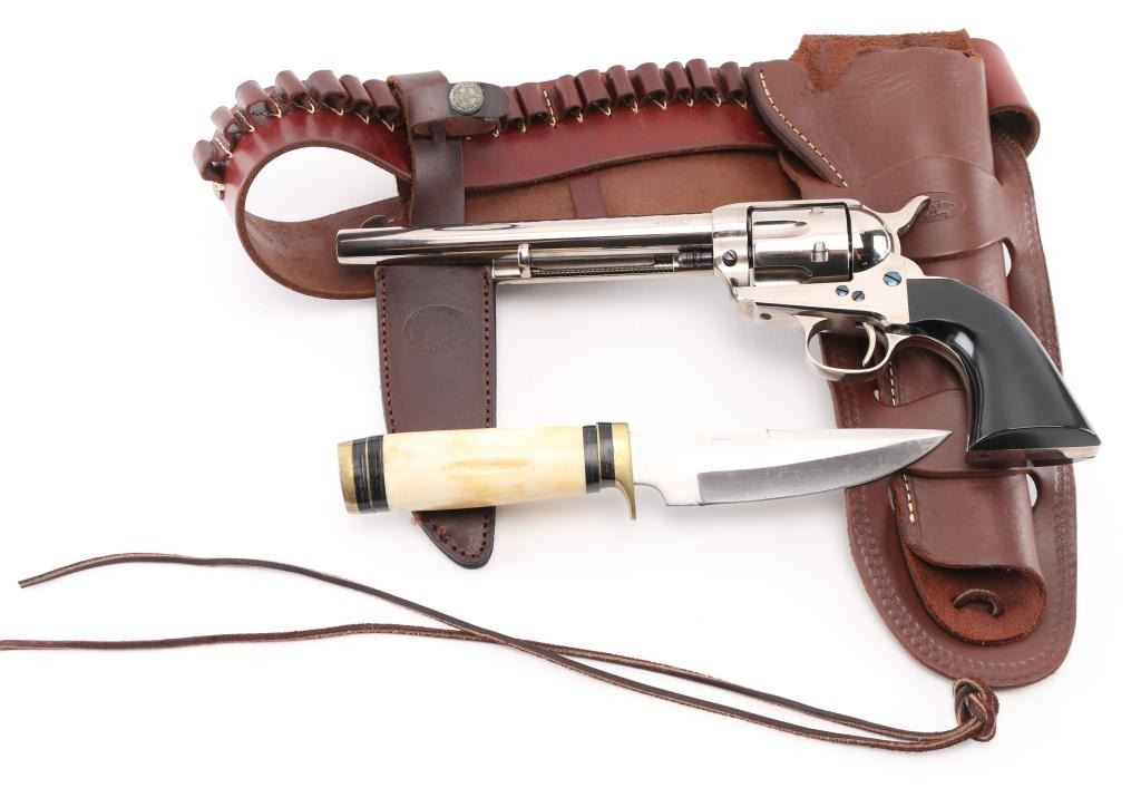 Single action revolver is in excellent overall condition with a 7 ½” barrel. The revolver retains approximately 99% of the polished nickel finish with light handling marks and bright niter blue screw heads. The smooth wood grips are in very good condition showing little if any use. The bore is very good, the action is crisp and the markings are sharp. Includes a excellent condition brown leather double loop holster & cartridge belt made by the Hunter Co. Westminster, CO. Also included with the belt is a bone handled Chipaway Co. knife, 5 1/4" blade with brown leather sheath. A nice set. NRA Condition-Excellent. Modern Firearm.