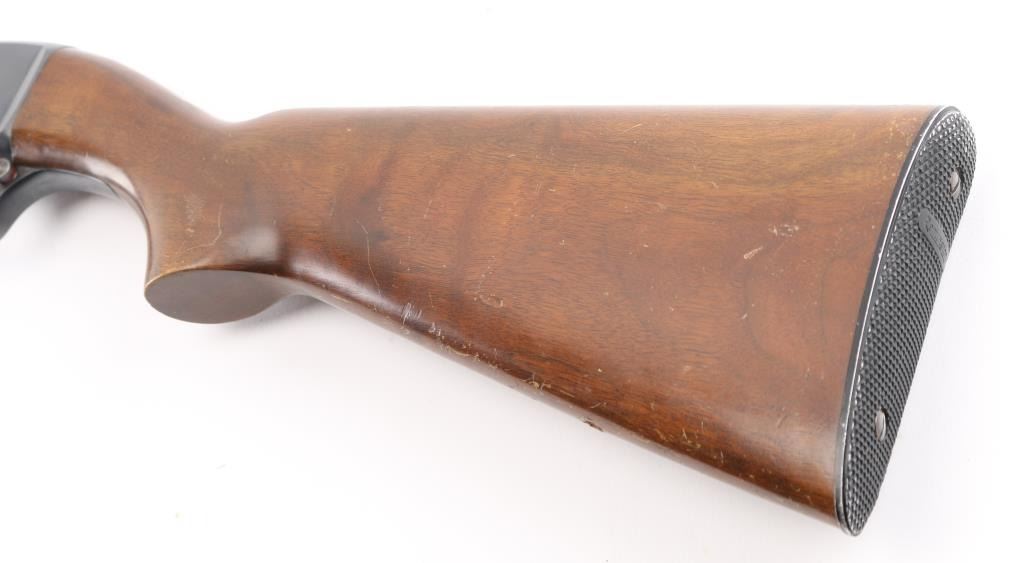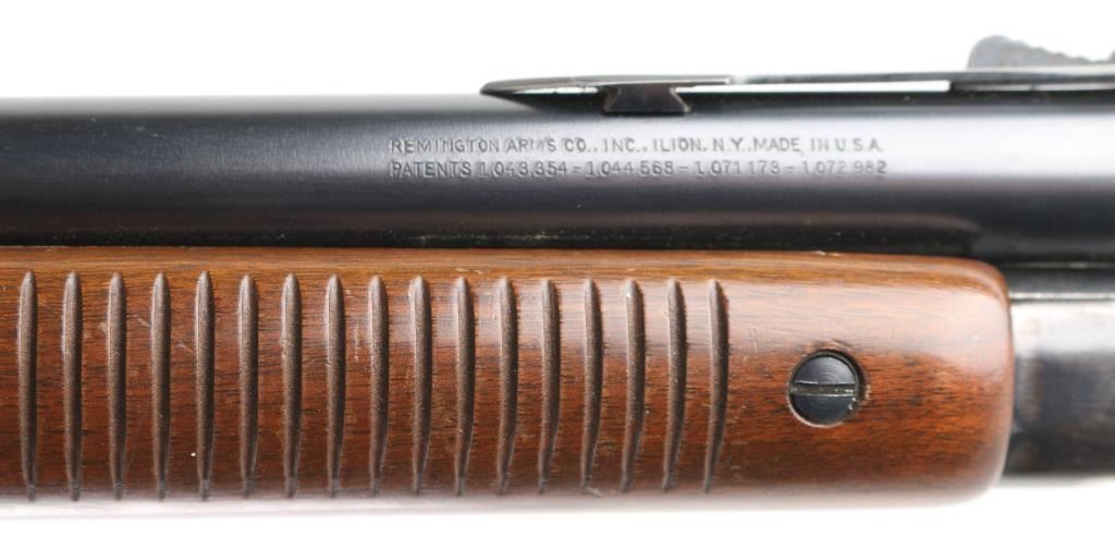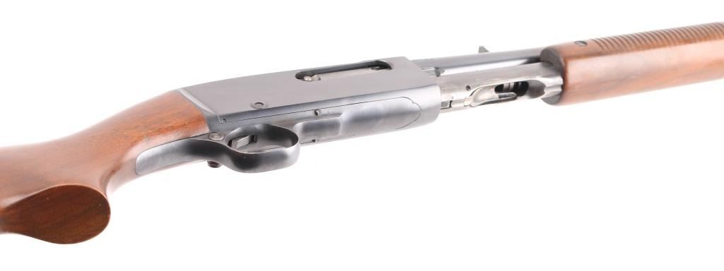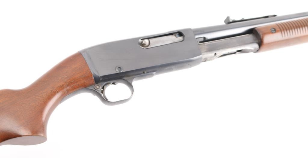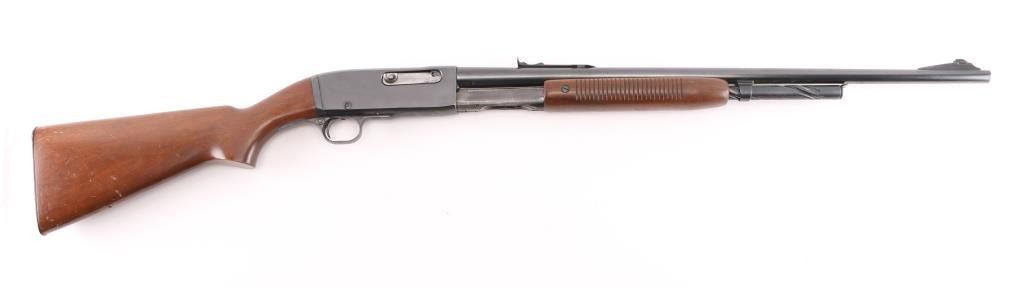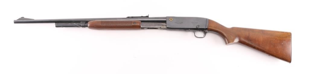The Gamemaster' take-down pump action rifle, manufactured circa 1947. Features blued finish, smooth semi-pistol grip stock, grooved wood pump handle, 24" barrel, post blade front & sporting rear sight, tube magazine, push button safety, bolt release in side of bolt, brass cartridge head medallion and take down screw on left side of receiver, knurled metal factory buttplate. Bore is very good condition. Retains 90% finish with rubbing wear on magazine tube. Wood is very good with minor scratches/dings, hole drilled for sling stud in butt stock. Condition is NRA Very Good. C&R Firearm.