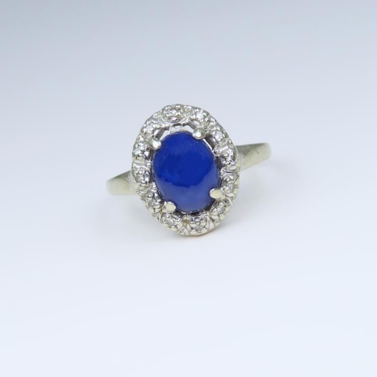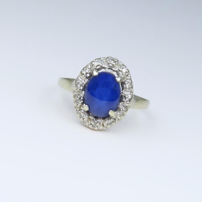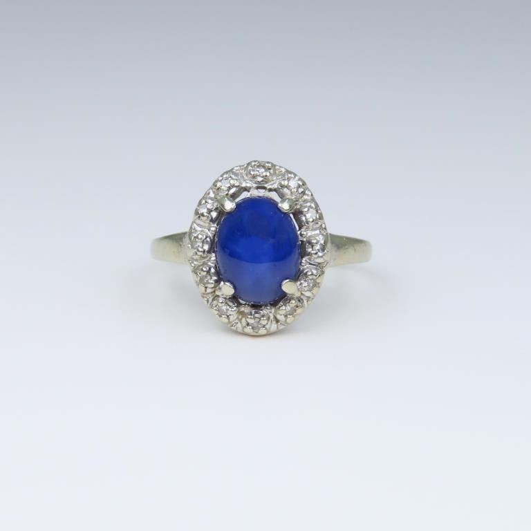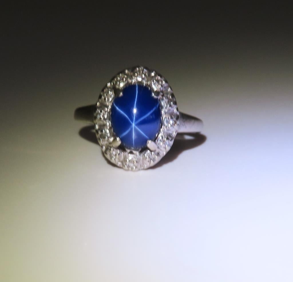 and Diamond Ring featuring an oval Sapphire with striking Star weighing approx. 2.00 carats encircled with 12 round cut Diamonds set in a 14 karat white gold classic setting. Size 6.