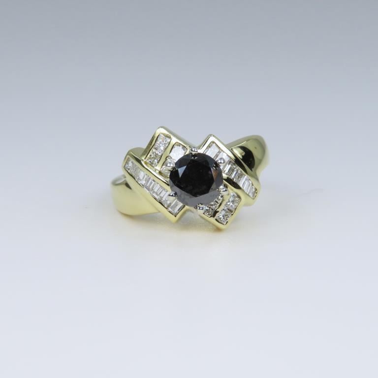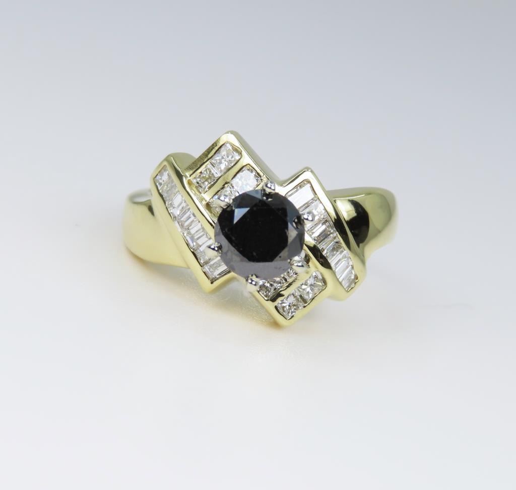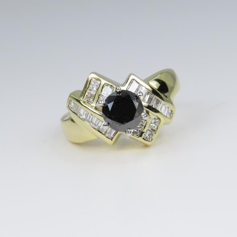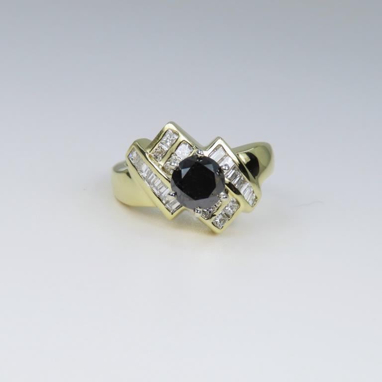 featuring an approx. 1.00 carat round Black Diamond surrounded with 22 channel set White Princess and baguette cut Diamonds weighing approx. 1.00 carats combined total White Diamonds with G-H colors and VS clarity set in 14 karat yellow gold setting. Size 7.