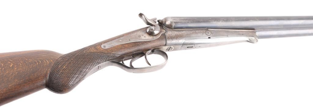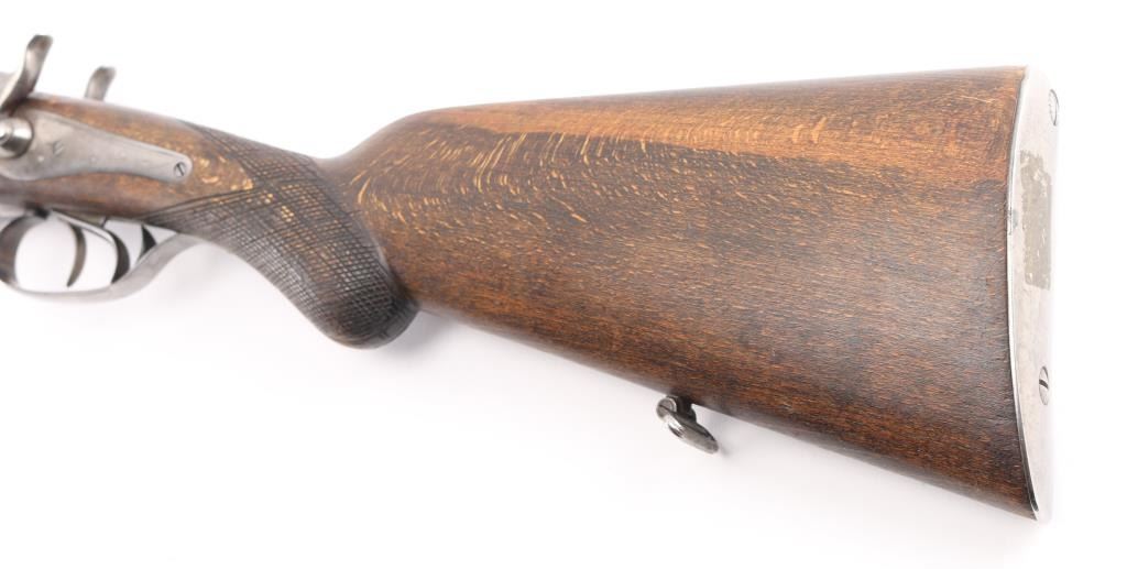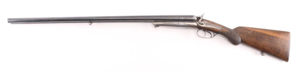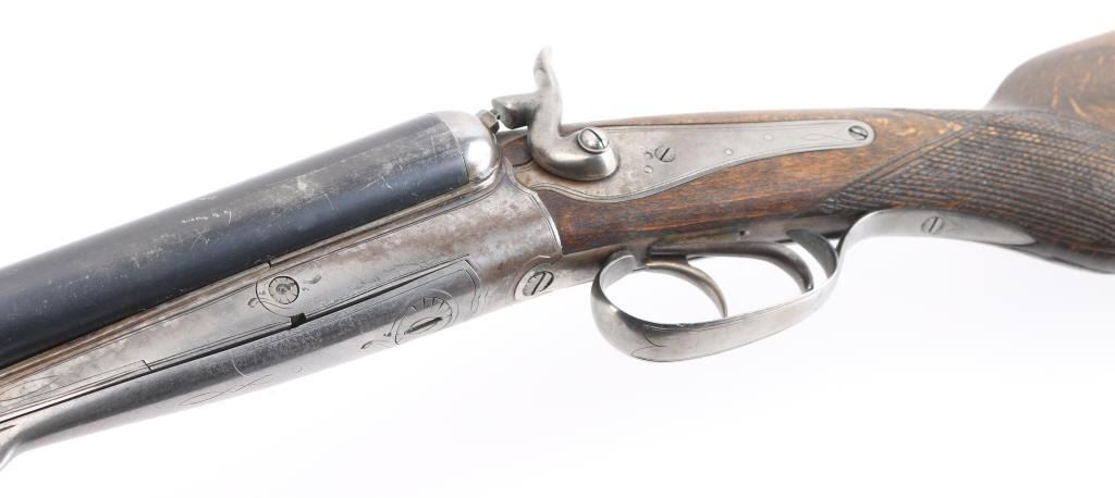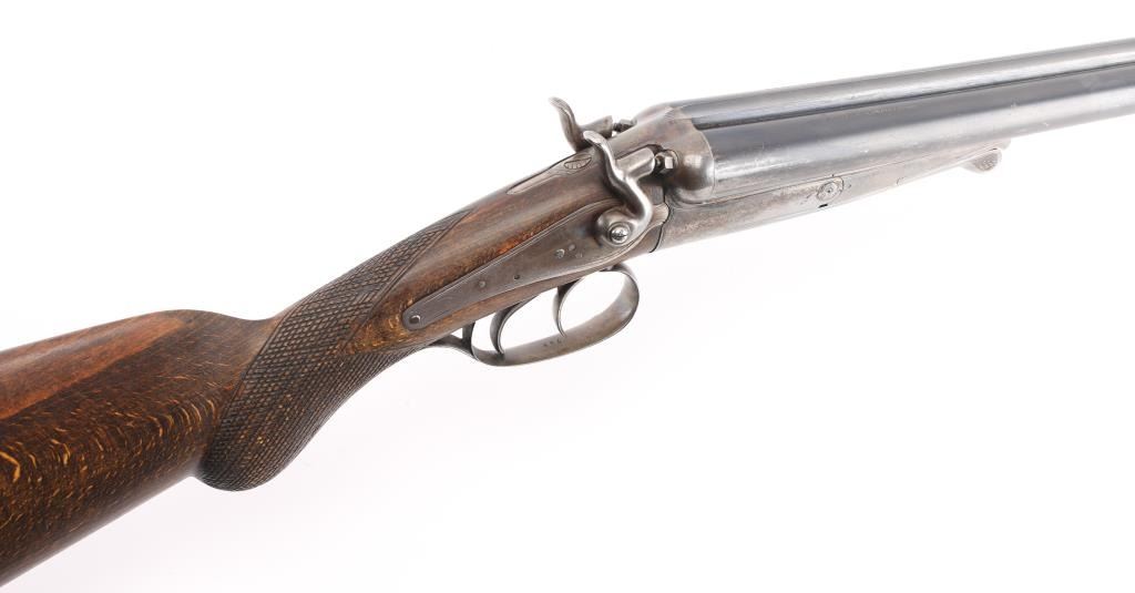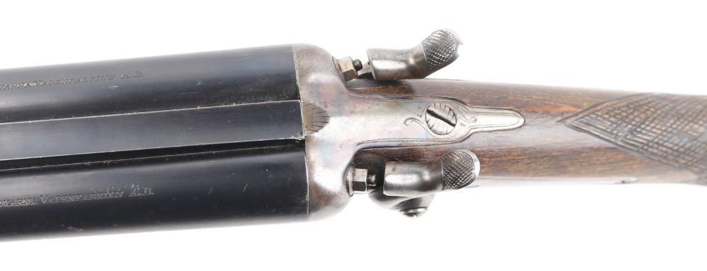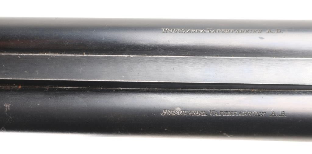 Swedish made SxS shotgun features exposed hammers, under lever, double triggers. 29 1/4" blued, ribbed barrels with brass bead, case colored receiver & lock plates, single extractor. Wood butt stock with checkered bag grip, steel butt plate, sling swivels. Bores are very good/bright. Action works well, barrels lock up tight, blue is about 70% with handling loss, scratches/rubs. Case color are mostly in the white with traces remaining, wood stock is very good, sound. NRA Condition-Good. C&R Firearm.