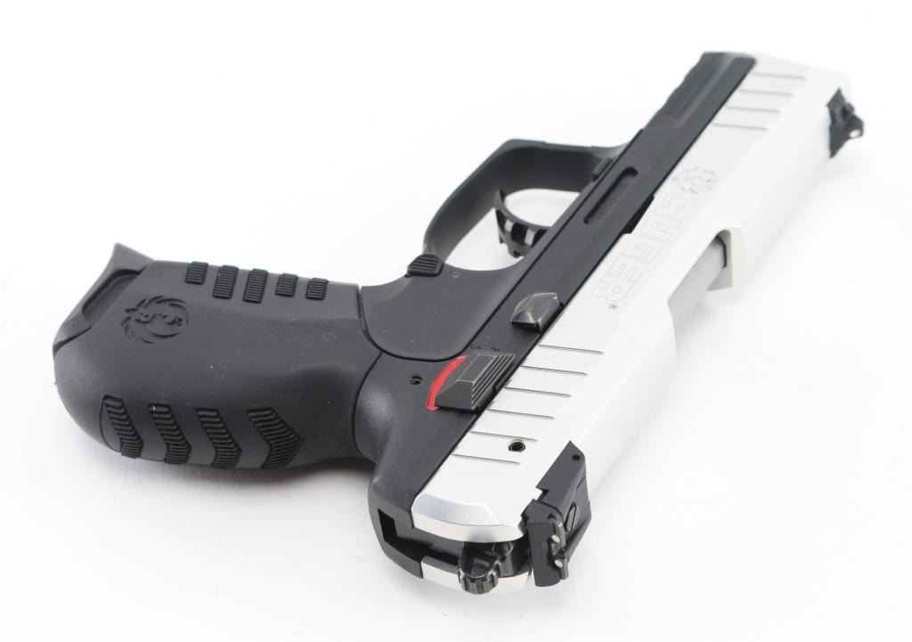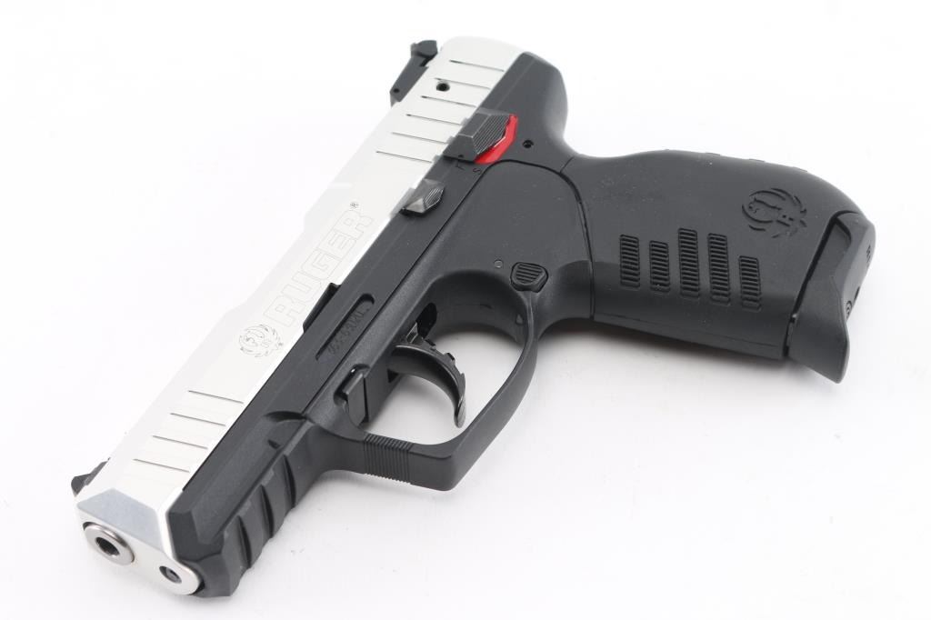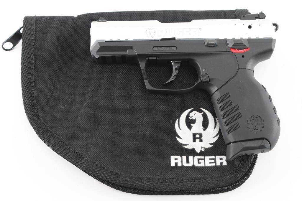 Semi-auto pistol chambered for .22 long rifle ammunition. It has an alloy slide, black poly frame with accessory rail, dovetailed, three dot rear adjustable sights, smooth trigger, serrated hammer spur, and ambidextrous safety. Comes with one magazine and Ruger soft case. Metal finish looks great. Frame looks great. Bore looks new. Condition is near NRA Perfect. *Modern Firearm*