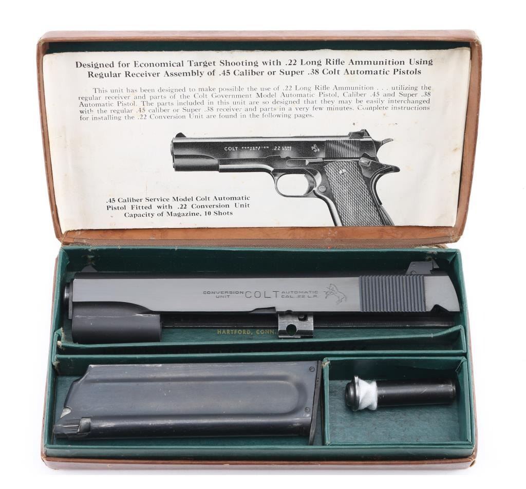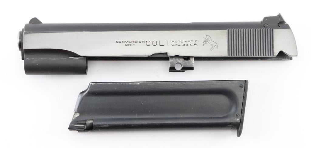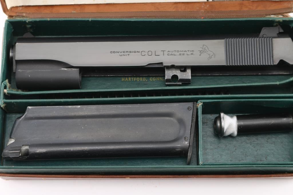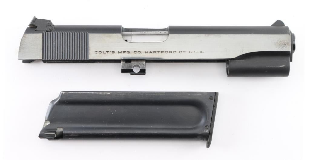 with Floating Chamber. "ACE" type. American made unit for converting Colt Government Model Automatic Pistols in either .45 or Super .38 caliber. Includes the original box with instructions, approximately 7" slide, approximately 5" barrel bushing, recoil spring plug, recoil spring guide and 10-round magazine. Finish is excellent. The ejector, slide stop and recoil spring are missing..