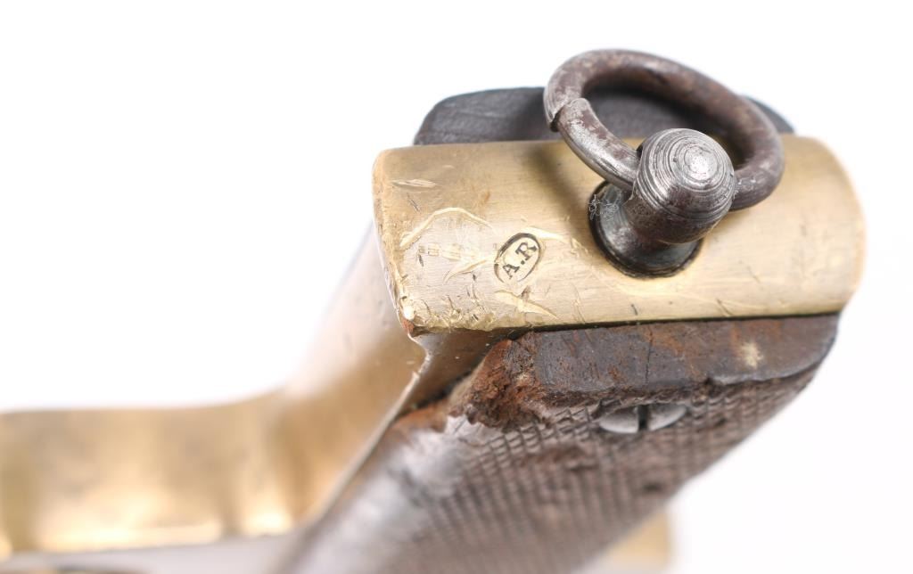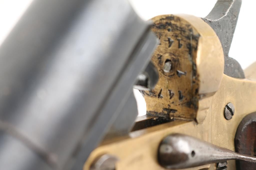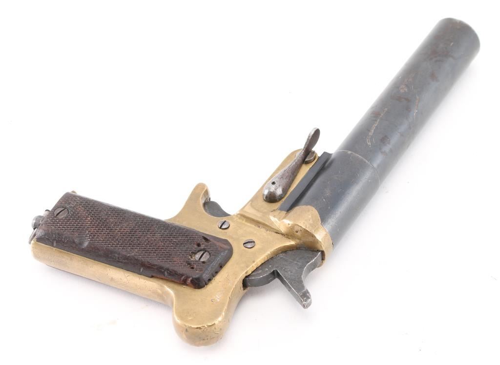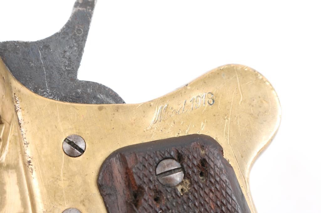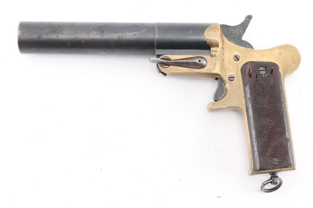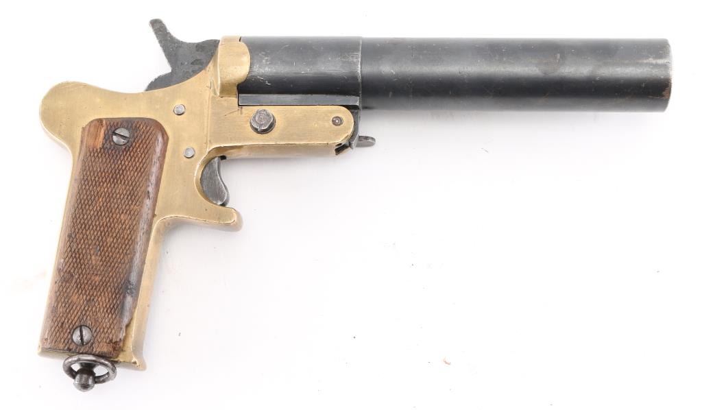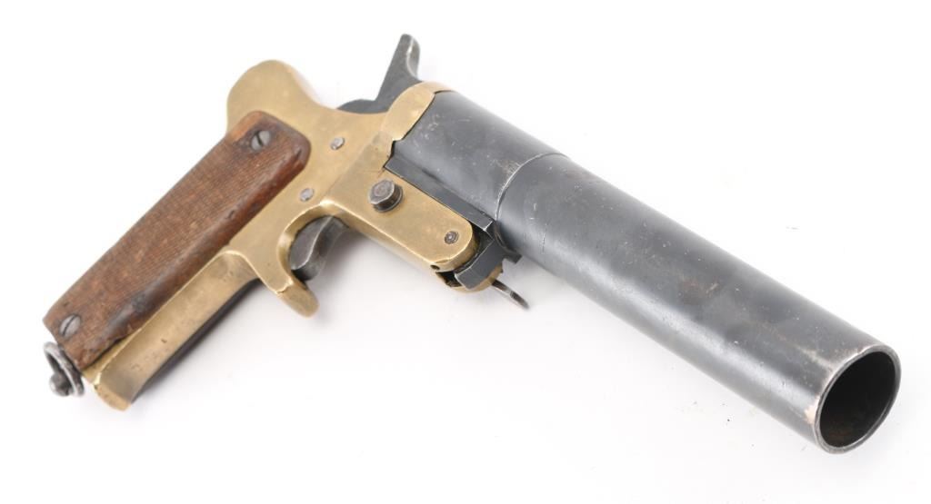 #147 French WWI flare launching signal pistol features approx 7" barrel, side latch, single action trigger, lanyard ring at butt. Bore is good condition with minimal roughness. Barrel retains 75% even grayish color bluing with thinning and some bare metal. Brass frame is good condition with casting marks evident. Good condition wood grips are checkered, show signs of heavy use. Marked "Mecanicarm", "Modele 1918", matching numbers on barrel and frame. Overall condition is Very Good.