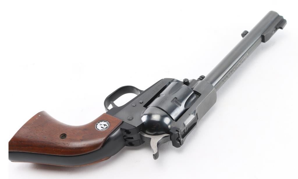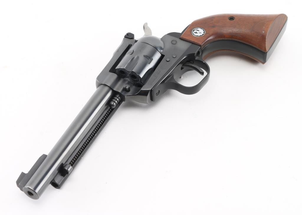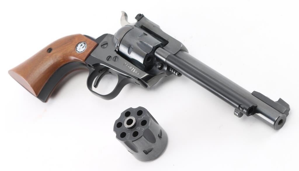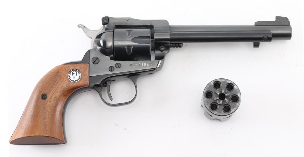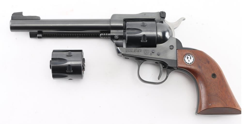 Single action rimfire revolver manufactured circa 1972, with 22 Long Rifle cylinder installed, convertible to 22 Magnum with the included additional cylinder. 'Three Screw' old model. Features blued finish, smooth wood grips with Ruger medallions, 5.5" barrel, Partridge front & adjustable rear sights, fluted 6 shot cylinder (Magnum cylinder also fluted). Bore is very good condition. Retains 90% blue with edge losses, scratches on cylinder. Spare cylinder shows closer to 95% finish, few minor losses. Wood grips are very good with few dents & scratches. Action is smooth with tight lock-up. Condition is NRA Very Good++ *** C&R Firearm ***
