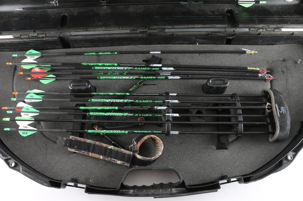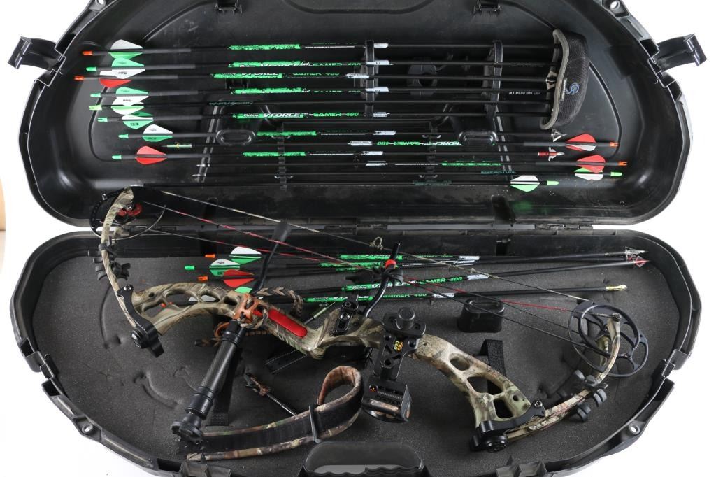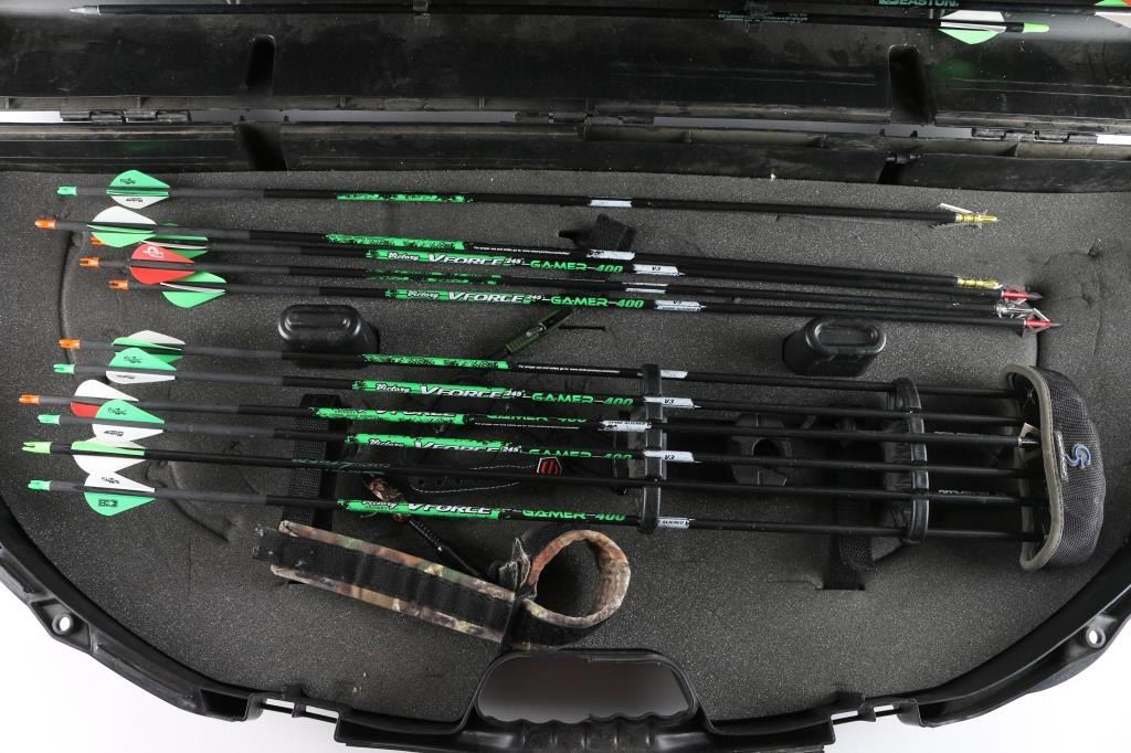 Camo print , with G Force big game arrows, plano carrying case.