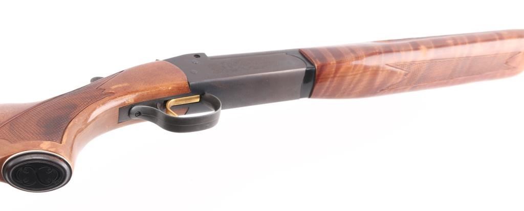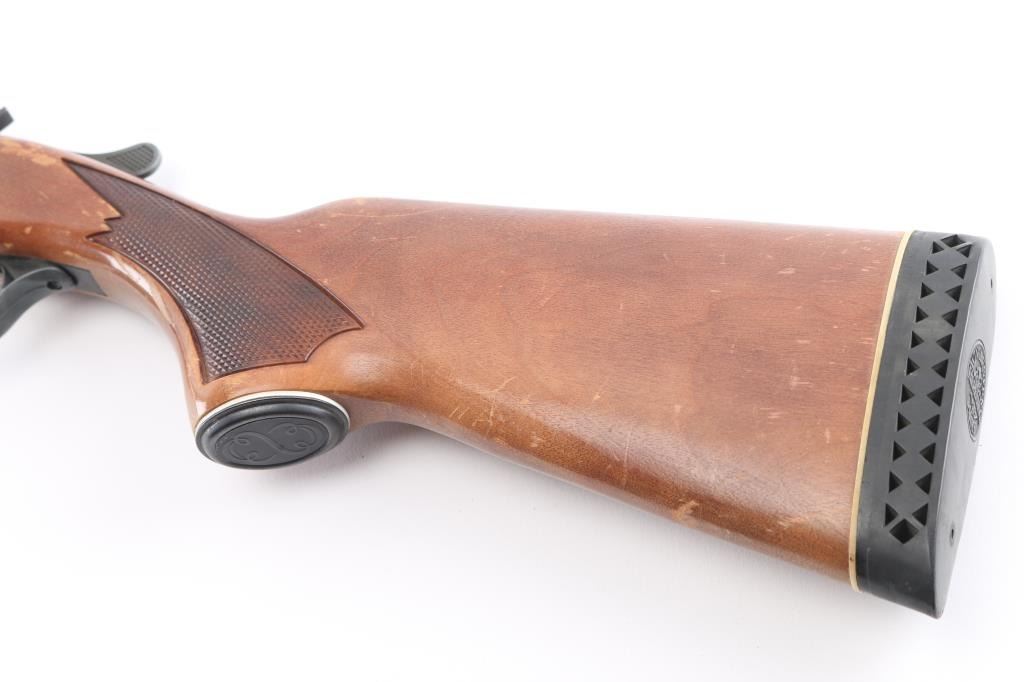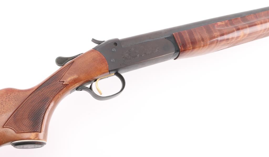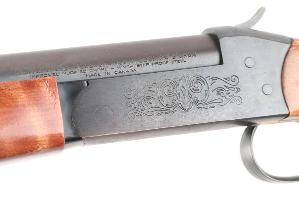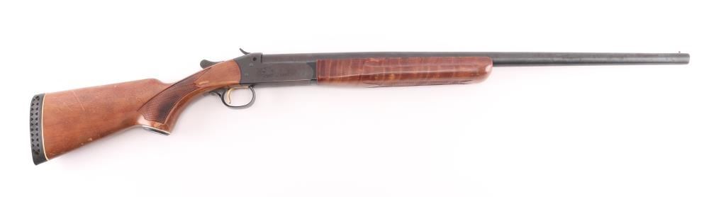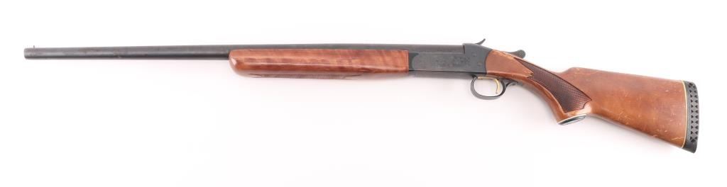 Canadian made single barrel break-open 'Youth' shotgun chambered for 2 3/4" or 3" .20 gauge shells, produced circa 1973-1980. Features a blued finish, 26" Full choked barrel, automatic ejector, brass bead front sight, smooth gold toned trigger, serrated hammer spur, knurled top lever, steel receiver with roll stamped embellishment, press checkered wood beavertail forend, and pistol grip shoulder stock with factory recoil pad. LOP is 12.5". Shotgun exhibits approximately 80% of it's original finish showing scratches, brown spots, and scattered pin-prick pitting. Action is sound, bore is very good/bright, and the wood stocks are good with minor scattered dings & scrapes. NRA Condition- Good. Modern Firearm