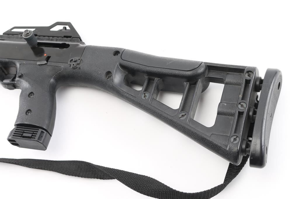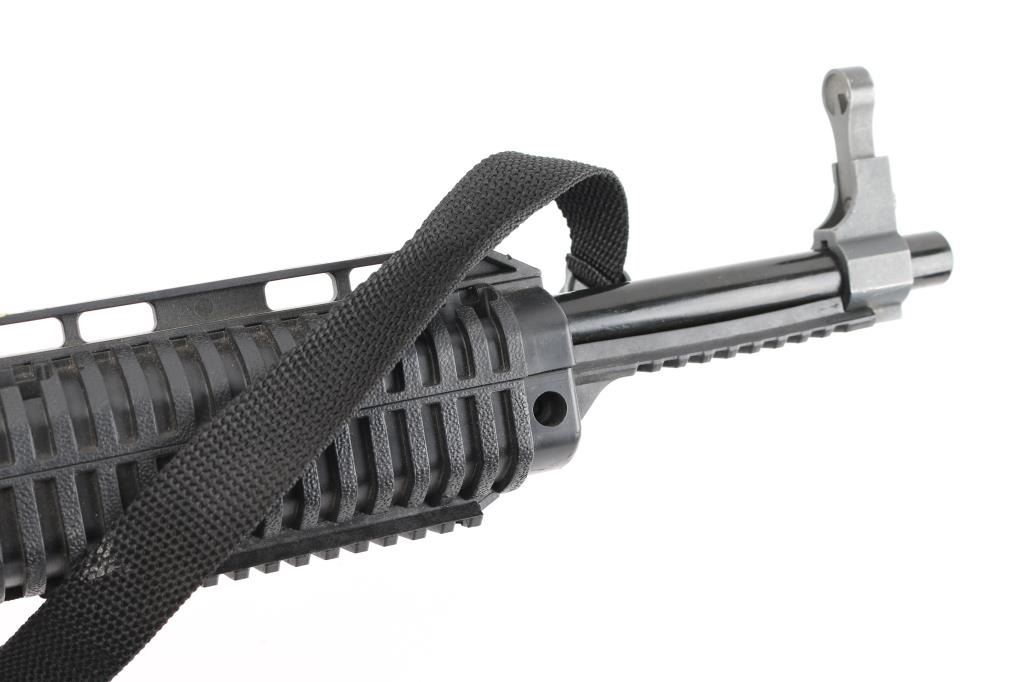 American made semi-automatic rifle chambered in .45 Automatic. Features a 17.5" blued barrel, hooded post front sight, shrouded adjustable rear aperture sight, push button magazine release, 9 round magazine, manual safety, sling, skeletonized black polymer shoulder stock, two integral weaver style rails, textured pistol grip & internal recoil buffer buttplate. Rifle exhibits quite a bit of wear. Action is smooth, bore is excellent. Front of top rail appears to have been repaired. Condition Poor **Modern Firearm**