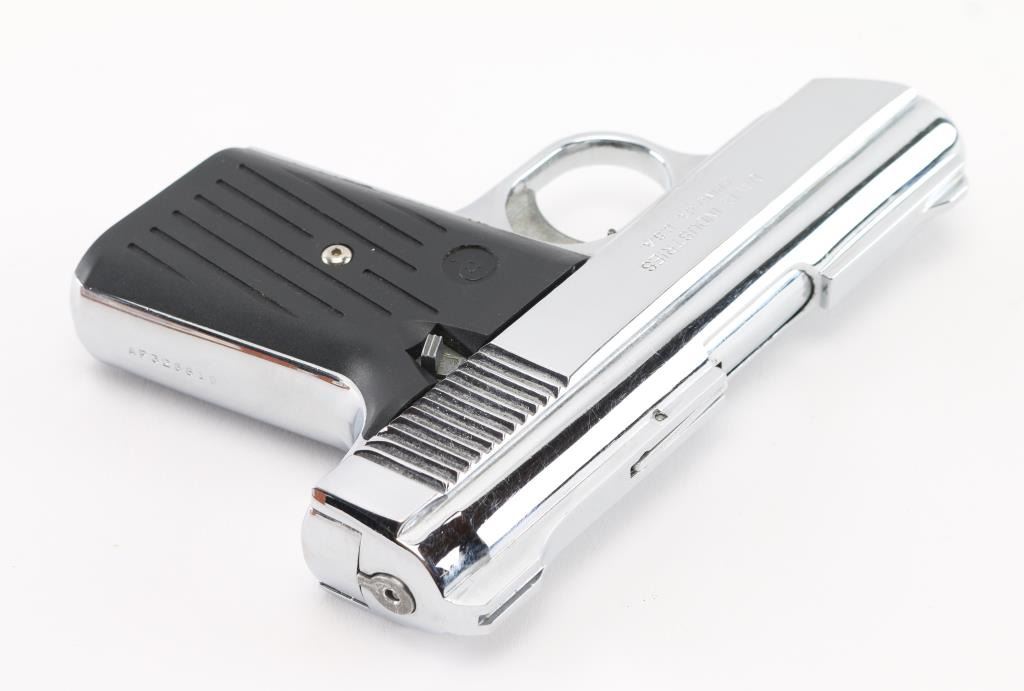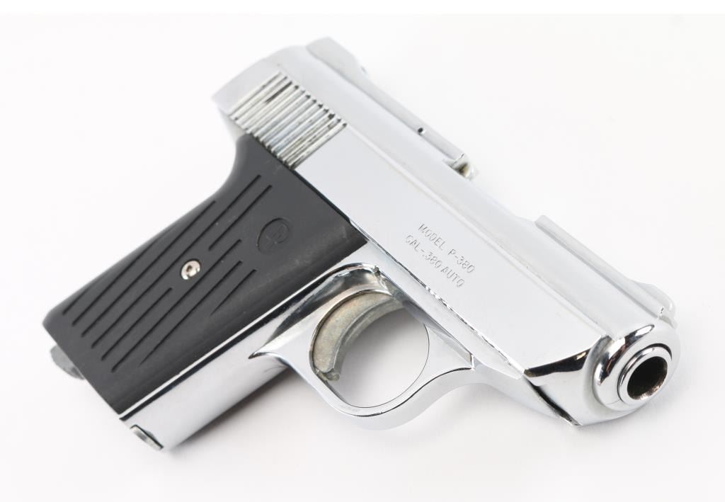 Semiautomatic pistol features approx 2.75" barrel, fixed sights, single action, manual safety, fixed sights, heel mag release, factory 5 round magazine, black plastic grips. Bore is very good, needs cleaning. Nickel retains 95% finish with scratches handling marks. Includes factory box with paperwork. Condition is near NRA Excellent. Modern Firearm.