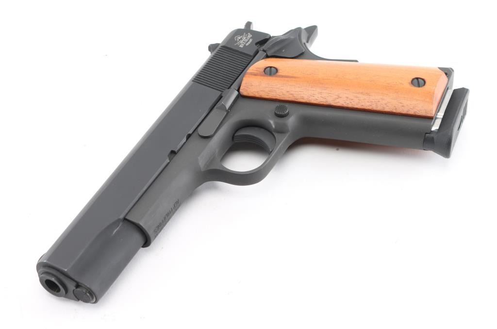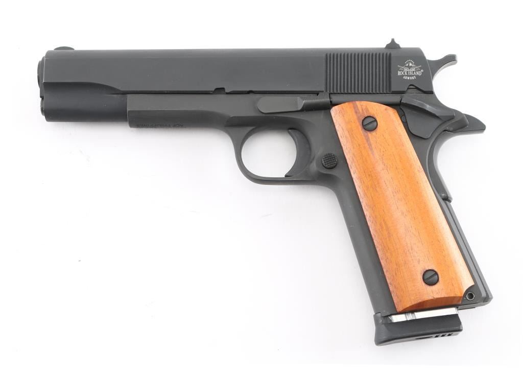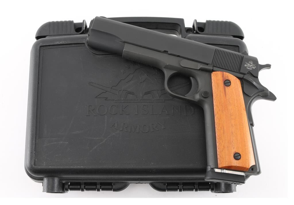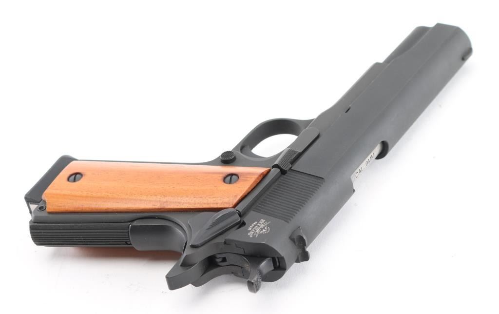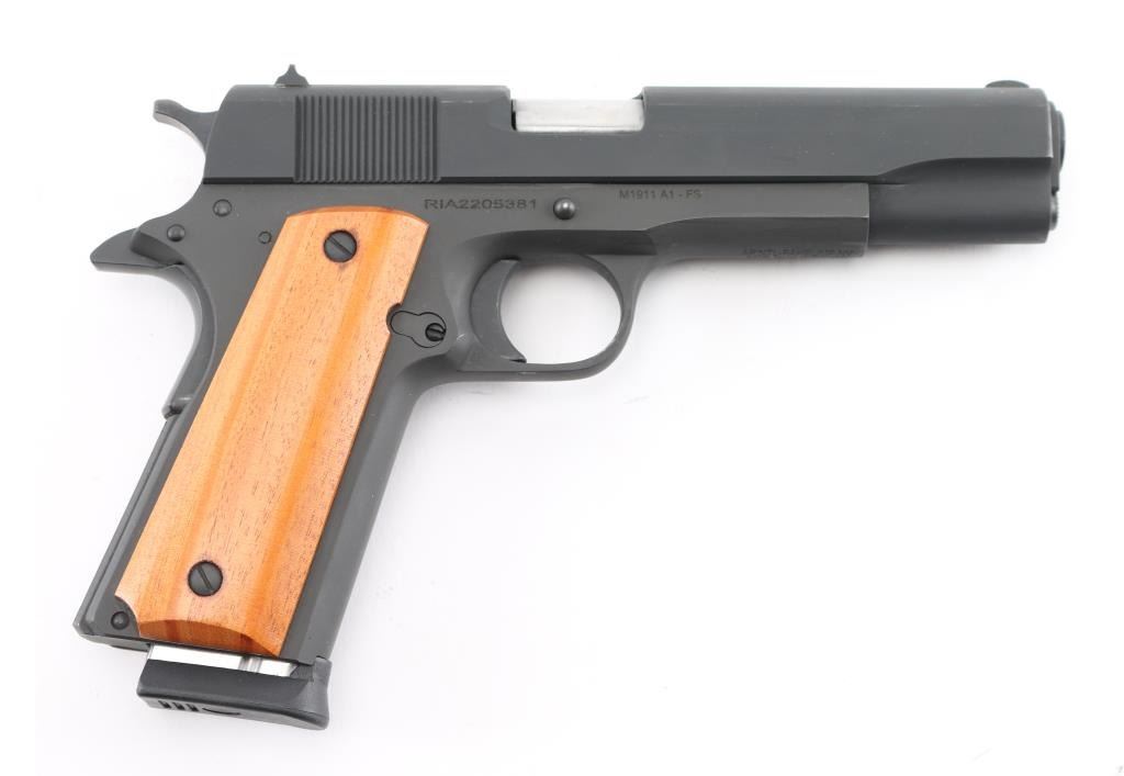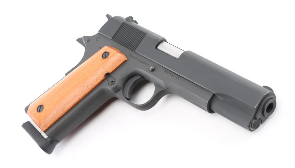 SN: RIA2205381 1911-A1 style singe action semi-automatic pistol chambered in 9MM. Manufactured in the Philippines by Armscor and imported by Armscor Precision International of Pahrump, NV with import marks on the underside of the frame. Features a parkerized finish, 5" barrel, full-length guide rod, low-profile round blade front sight, dovetailed rear window sight, serrated trigger, standard hammer, thumb safety, grip safety, push button magazine release, 10 round magazine steel frame, serrated flat mainspring housing, and two-piece smooth wood grips. Includes the original factory black plastic hard case with documents, lock and spent shell cases. Pistol is new. Condition is NRA Excellent. ***Modern Firearm***