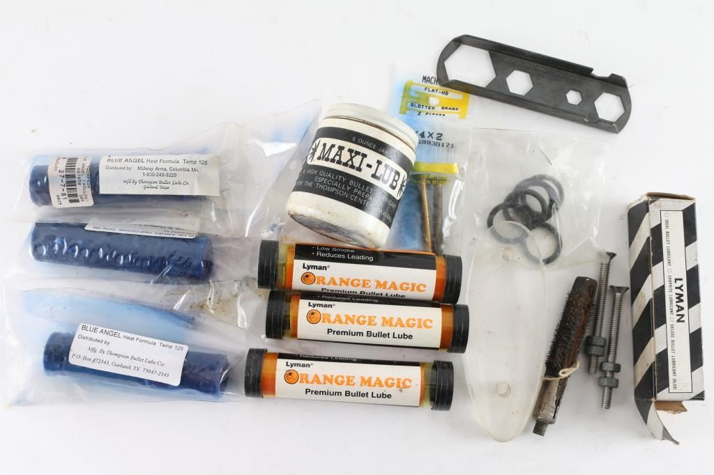 Maxi-Lub bullet lubricant prepared for Thompson Center Maxi-Ball. Three tubes of Orange Magic premium bullet lube. Three tubes of Blue Angel Heat Formula bullet lubricant, 125 degrees. One partial stick of Lyman Deluxe Bullet Lubricant (ALOX). Six 1" O-rings.