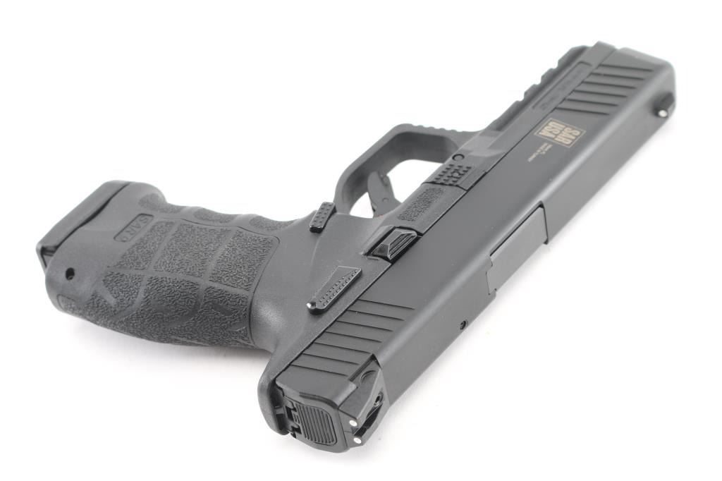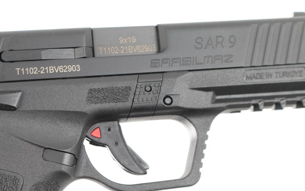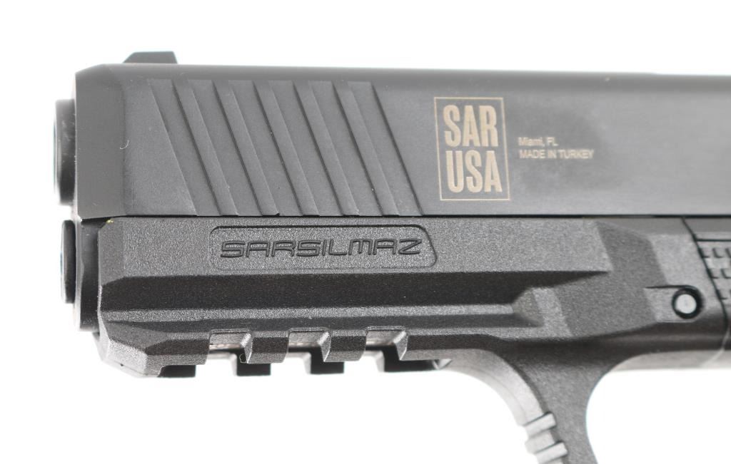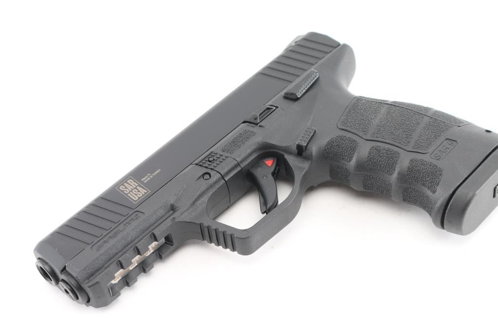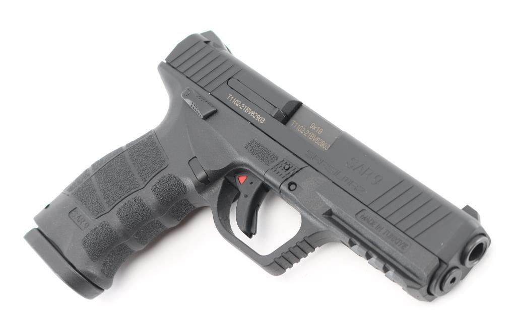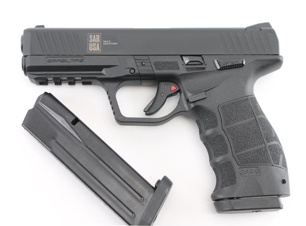 Turkish made striker fired semi-automatic full-size pistol chambered in 9x19mm. Imported by SAR USA Miami, FL. Features matte black finish, 4.4" barrel, 3 dot white sights, polymer frame with accessory rail & replaceable backstraps, polymer trigger with integral safety, frame mounted ambidextrous safety Includes the original factory hard case with manual, cleaning tools, two additional backstraps with side plates, (2 total) 17 rd magazines. Gun is new. NRA Condition is Excellent Modern Firearm.