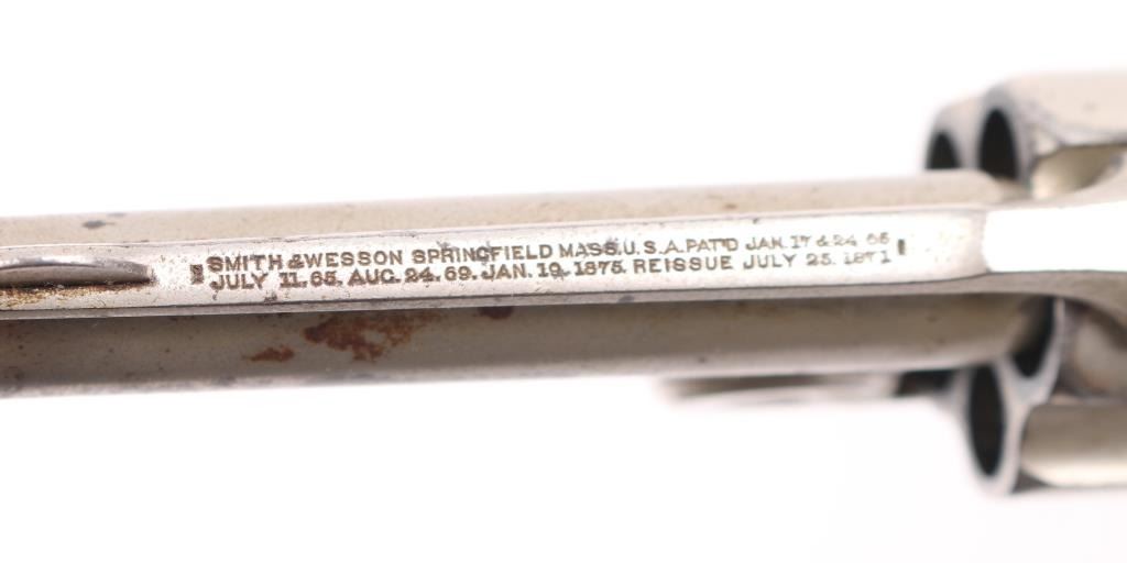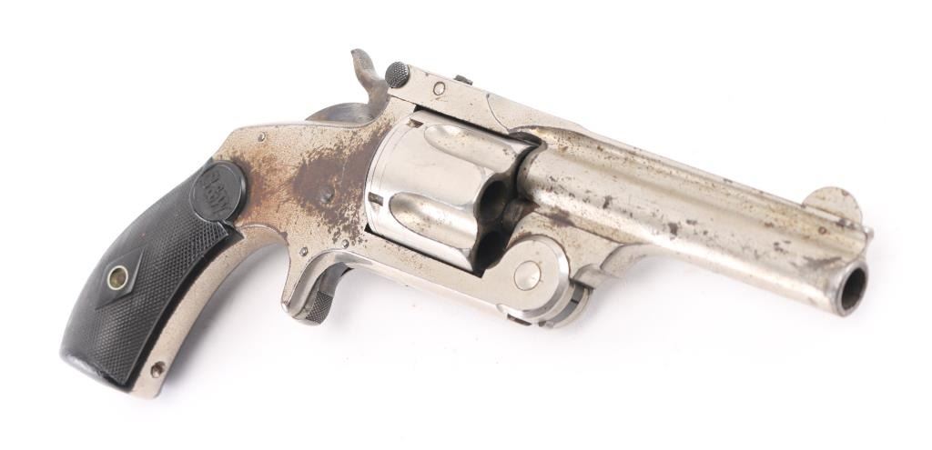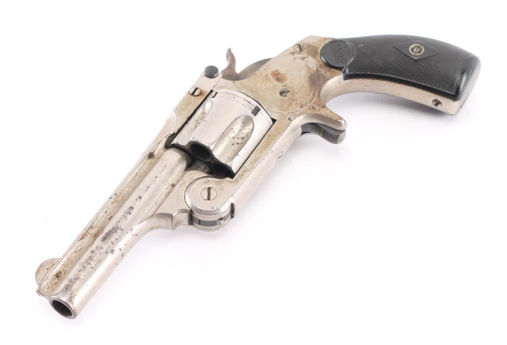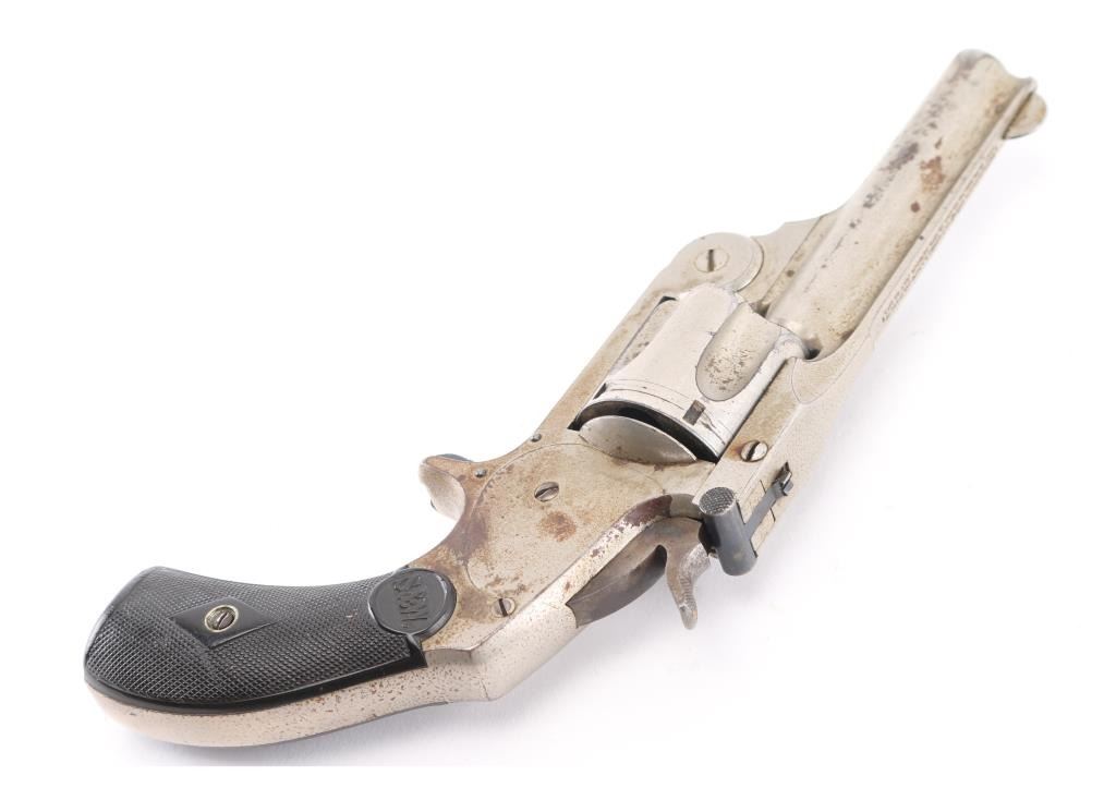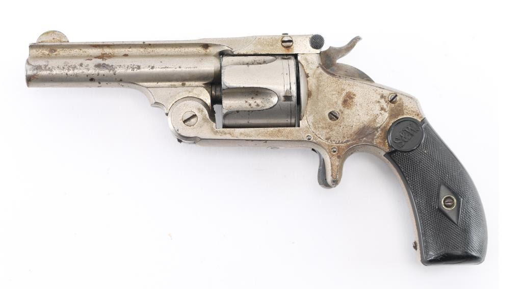 SN: NVSN 'Second Model .38 Single Action' Antique top-break spur trigger single action revolver chambered in .38 Smith & Wesson, circa 1876-1877. Features a nickel plated finish, 3.25" ribbed barrel, pinned round blade front sight, v-notch rear sight, fluted five-shot cylinder, knurled trigger, knurled hammer spur, and two-piece black diamond checkered hard rubber grips with S&W monograms. Revolver's finish is heavily pitted with large rust spots on the frame and bottom of grip. Action is smooth with tight lock-up. Condition is near NRA Good. ***Antique Firearm***