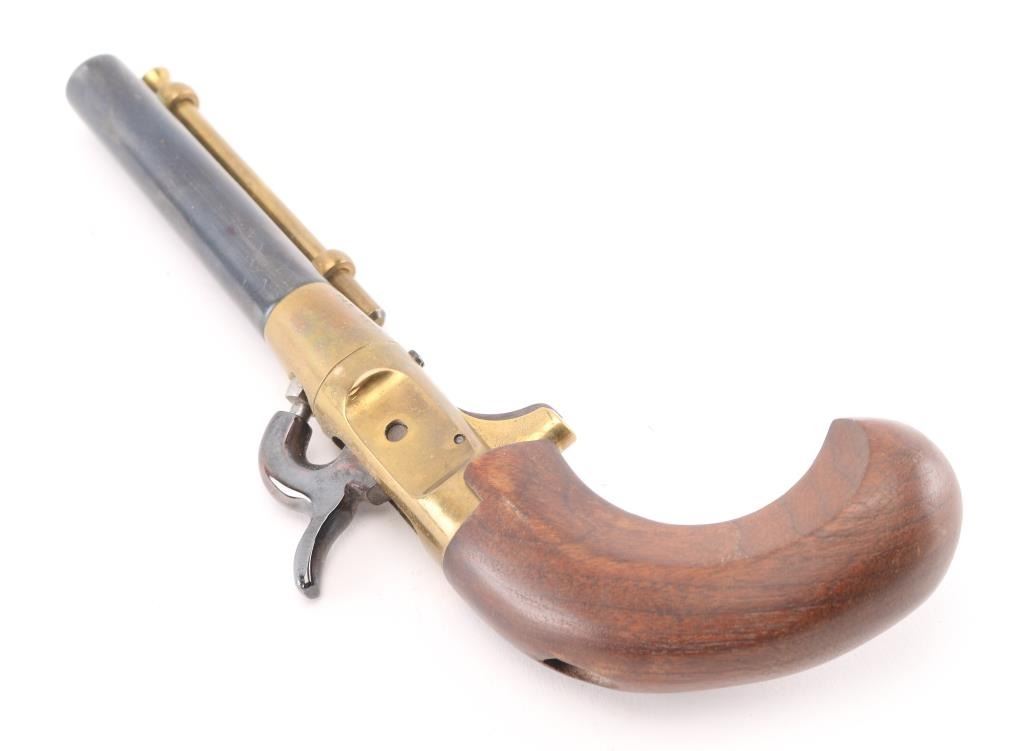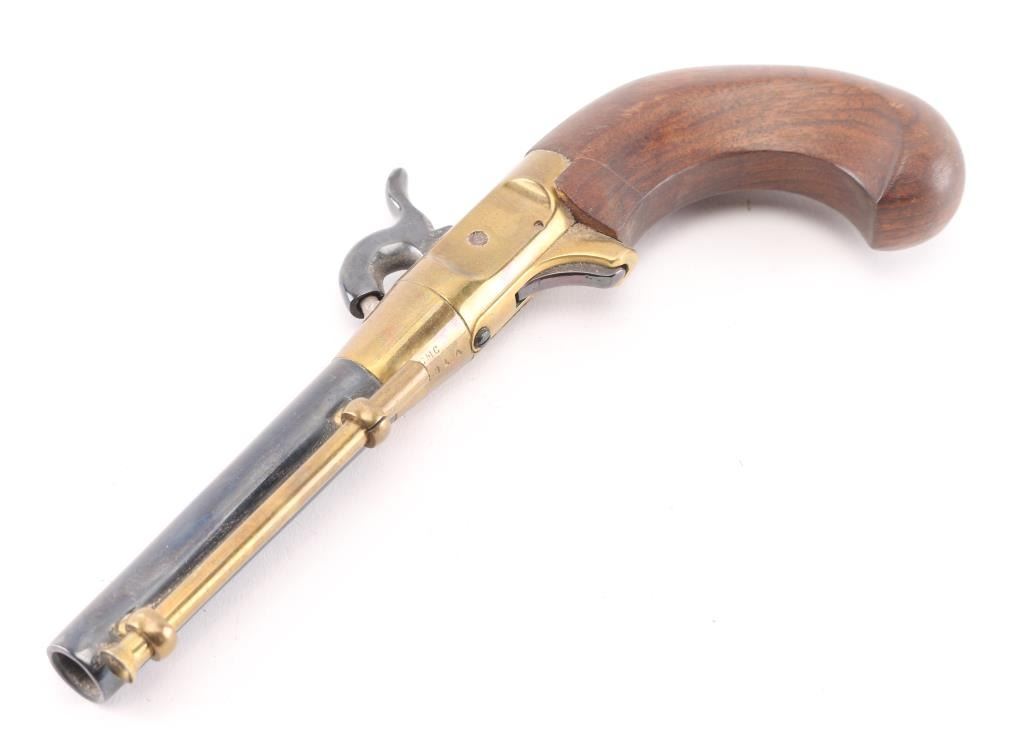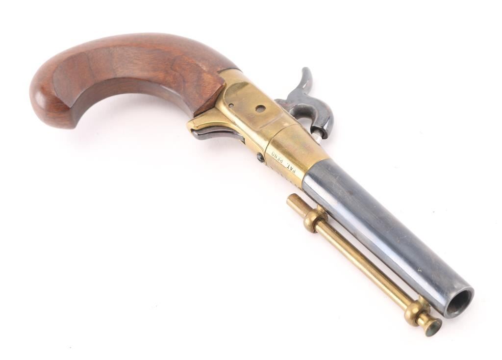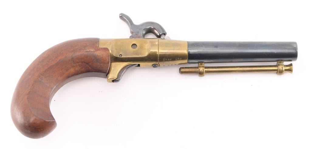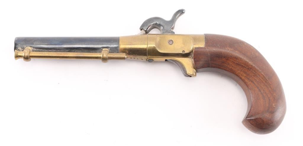 Single shot black powder pistol with approximately 3 1/2" steel barrel with black finish, overall length is approximately 9", brass frame, push rod and push rod holder, one-piece wood grip, finish is very good, brass has started to discolor. **NRA Very Good** Antique Firearm