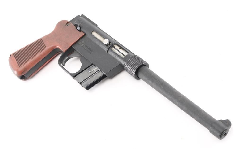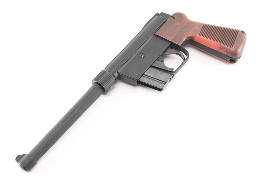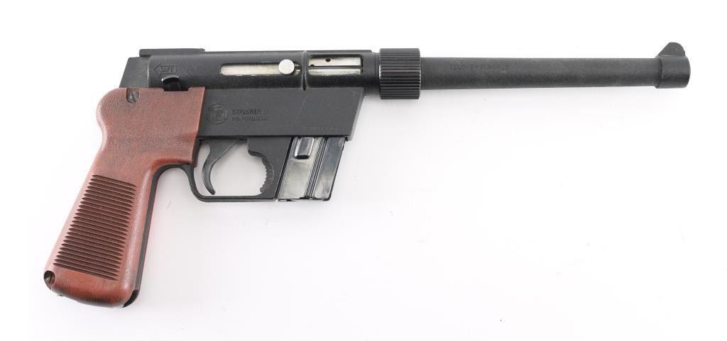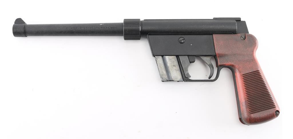 Take-down semi-automatic survival pistol chambered in .22 Long Rifle. Features a matte black finish, 8" detachable barrel with blade front sight, missing rear sight, polymer receiver, serrated trigger, detachable magazine, and serrated faux wood plastic grips with magazine compartment. Action works well, bore appears to be good, but dirty, grips are very good. Comes with (2) 8 round magazines. NRA condition is Excellent. Modern Firearm.