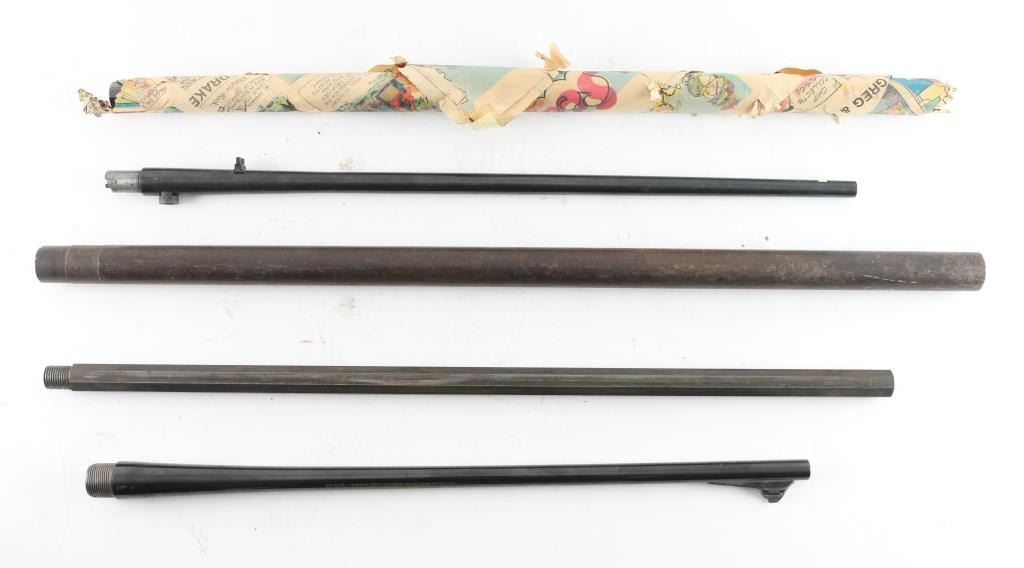 Remington .243 Win, 22", with front sight, blued steel, finish is scratched; Interarms .22LR, 24", with rear sight and dovetail for front sight, blued steel, finish is dull with a few wear marks; unlabelled threaded octagon bull barrel, 26 1/8", unfinished, has possibly been rechambered, hand marked "1-10 to 1-11"; unlabelled and unthreaded octagon bull barrel, 26", unfinished; unlabelled and demilled round bull barrel, 29 1/2", rusted. All lengths are approximate. Sig Sauer black nylon rifle bag, 36". Hooded post rifle sight.