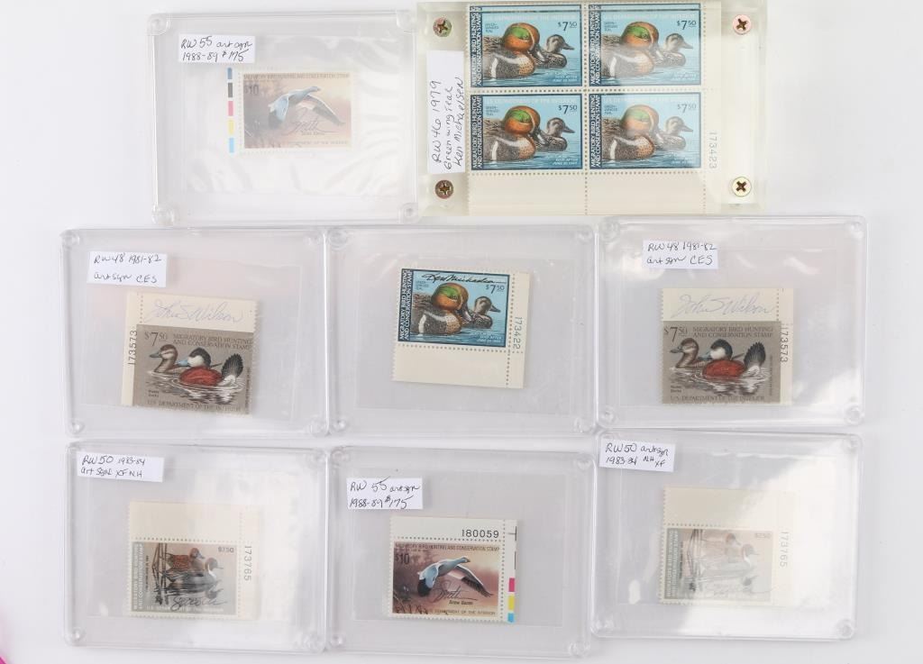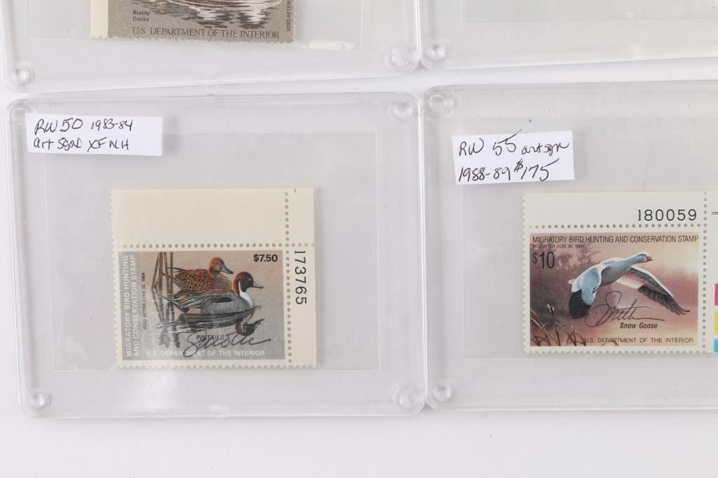 (2) 1984 7.50 Pintails Stamp signed by "SMITH" the artist (2) 1988-89 $10 SNOW GOOSE Stamp signed by "SMITH" the artist (2) 1981-82 $7.50 Ruddy Ducks signed by John S Wilson the artist (5)1979 7.50 Green Wing Teal Stamps