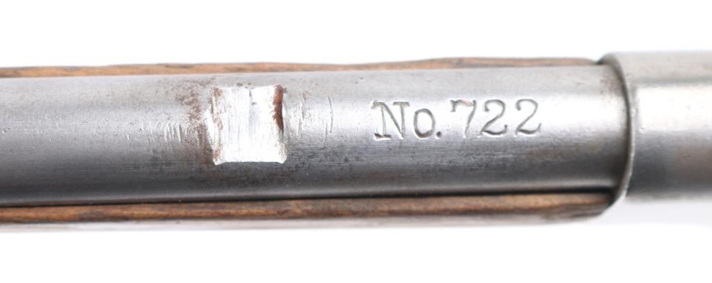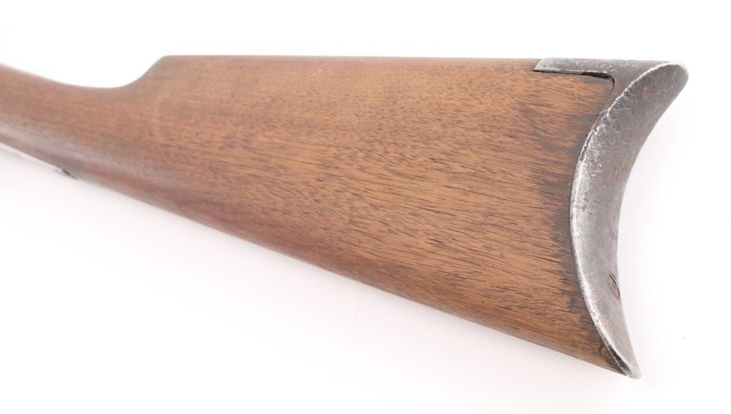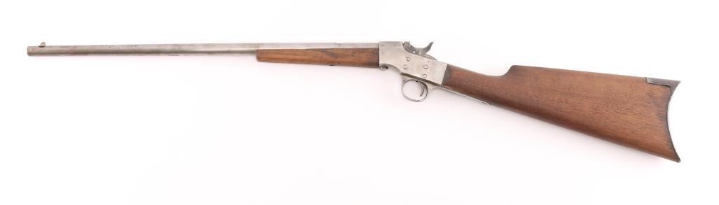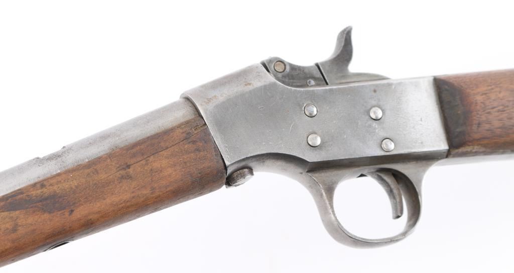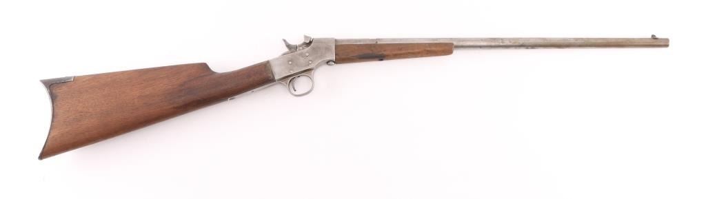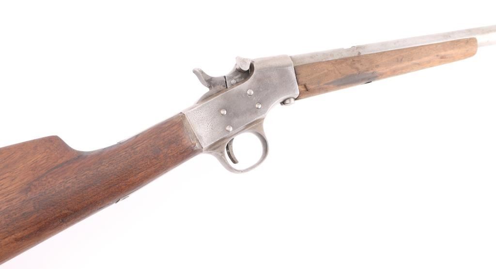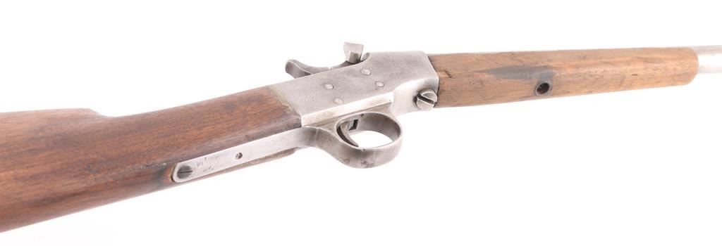 Vintage "Boy's Rifle", manufactured 1903-1915. Single-shot, rolling block action. 19.5" barrel, blade front sight, missing rear sight, crescent steel buttplate. Bore is poor, pitted, metal finish is in the white with scattered light areas of pitting, wood is sound, has been sanded. NRA Condition-Fair. C&R Firearm.