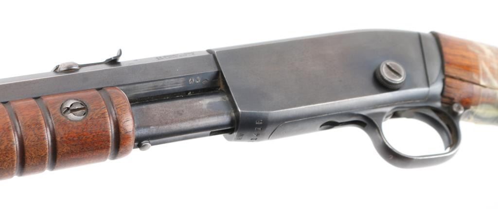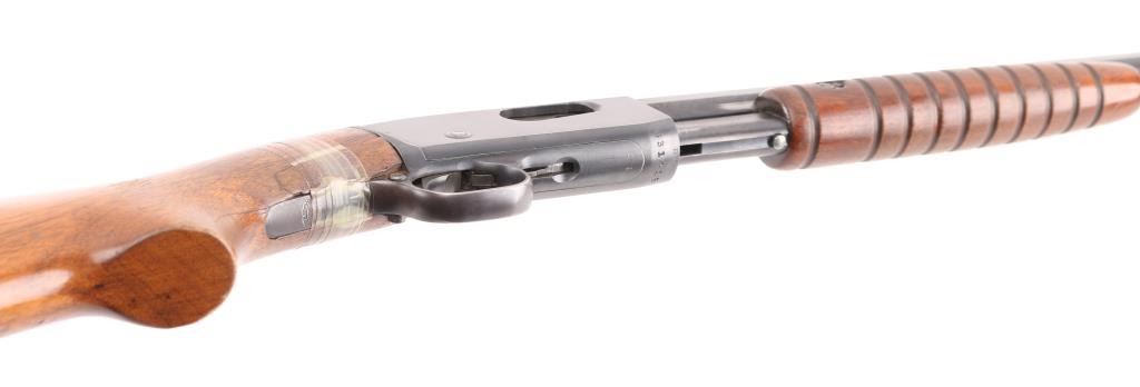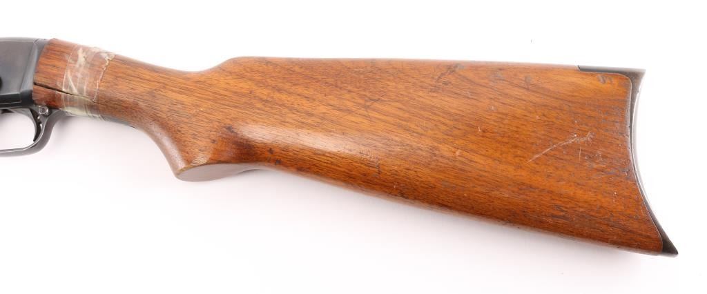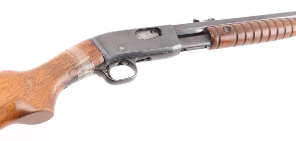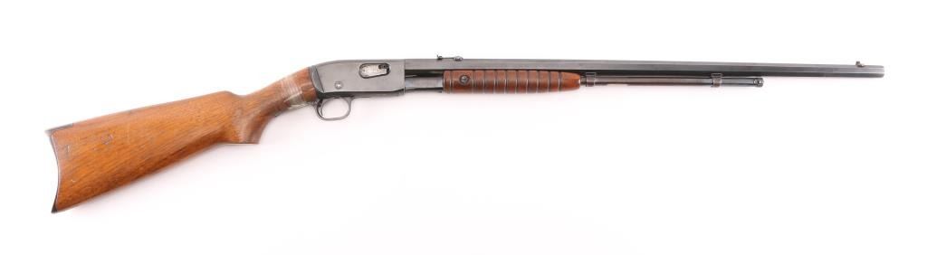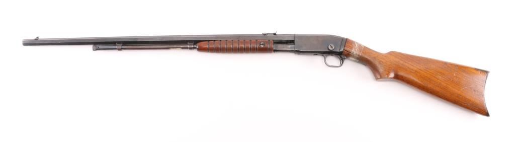 Vintage take-down slide action repeating rifle chambered for .22 Short. Long & Long Rifle, manufactured circa 1924. Features a blued finish, 24" octagonal barrel, dovetailed bead front sight, adjustable rear sporting sight, 2/3 length tube magazine, smooth trigger, concealed hammer, push button safety, take-down steel receiver with drilled & tapped rear portion, grooved walnut slide handle and smooth straight grip shoulder stock with factory crescent steel buttplate. Rifle exhibits approximately 85% of it's original blued finish showing thinning (predominantly on the barrel), scattered handling marks, slide wear on the magazine tube/slide arm. Action is smooth, the bore is excellent/bright and the wood stock has 1.5" cracks on both sides of the wrist with scotch tape around it. Pump handle is very good. Would be very good if stock wasn't cracked. Condition is NRA Fair. C&R Firearm.