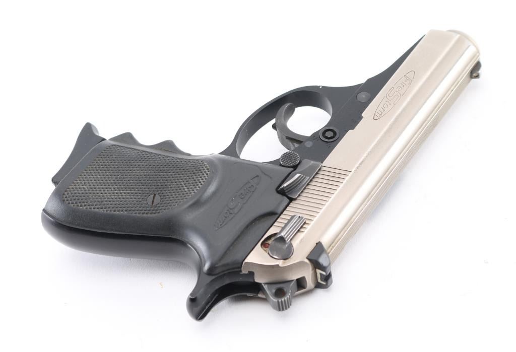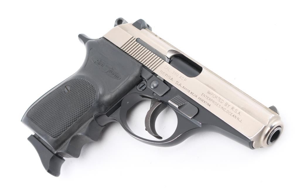 Made in Argentina. Double action semi-automatic compact pistol chambered in .380 Auto. Imported by R.S.A. Enterprises Inc. of Ocean, N.J. with import stamp on right side of the slide. Features a matte nickel finished slide with knurled sighting rib, 3.6" barrel, fixed white dot front sight, dovetailed square notched rear sight with white outline, smooth trigger, serrated round hammer spur, manual safety/decocker on the left side of the slide, magazine disconnect safety, push button magazine release, factory 7 round magazine with finger rest floorplate, matte black finished alloy frame and two-piece checkered black rubber grips. Pistol retains 98% of its original finish showing minor wear along the trigger guard. Action is smooth, the bore is excellent and the rubber grips are fine. Includes (2) 7 round magazines and leather paddle holster. Condition is NRA Excellent. Modern Firearm.