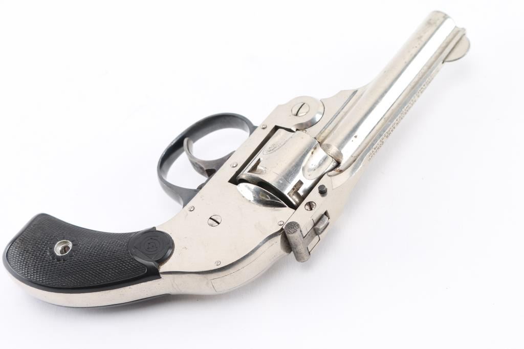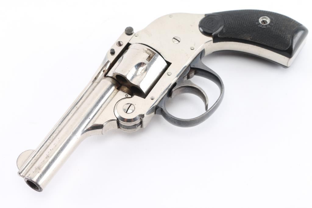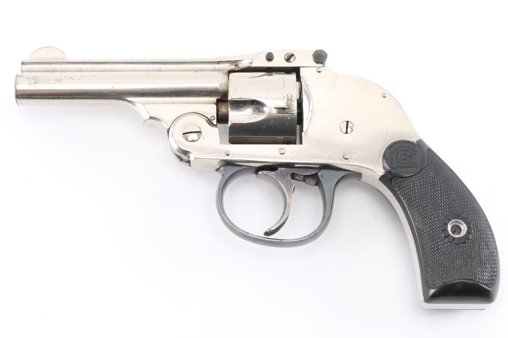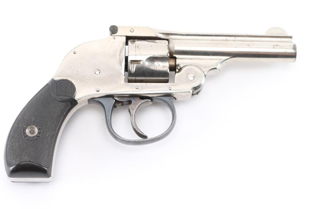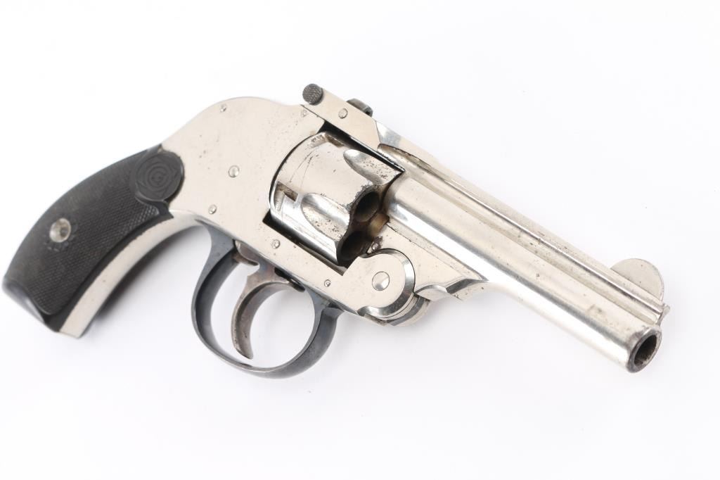 SN: 6629 Double action top break 5 shot revolver with internal hammer chambered in .32 Cal. 3" barrel with half moon front sight and v-notched rear, Nickel finish with black finish trigger guard and black hard rubber checkered grips. Bore and chambers are very good but dirty, retains 98% of its finish with minimal wear on corners and grips are very good. Action is smooth and lock-up is tight. Condition is NRA Very Good Modern Firearm. C&R Eligible