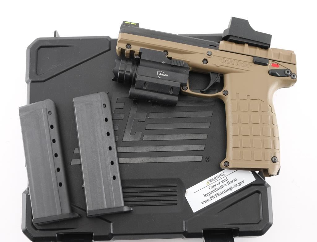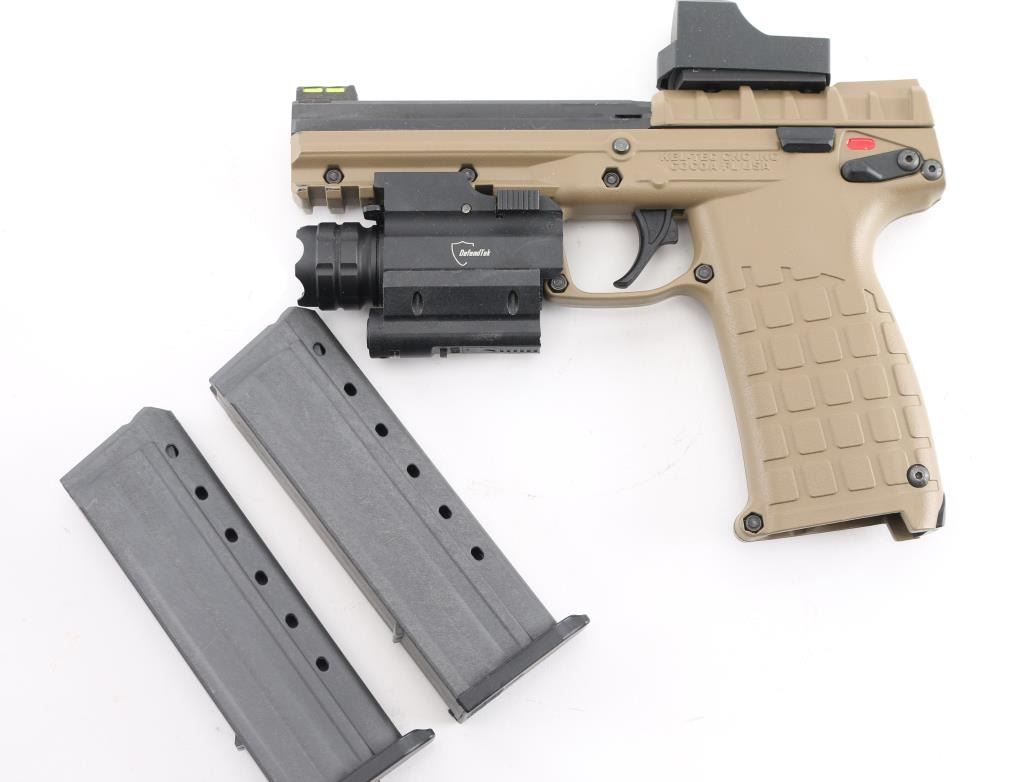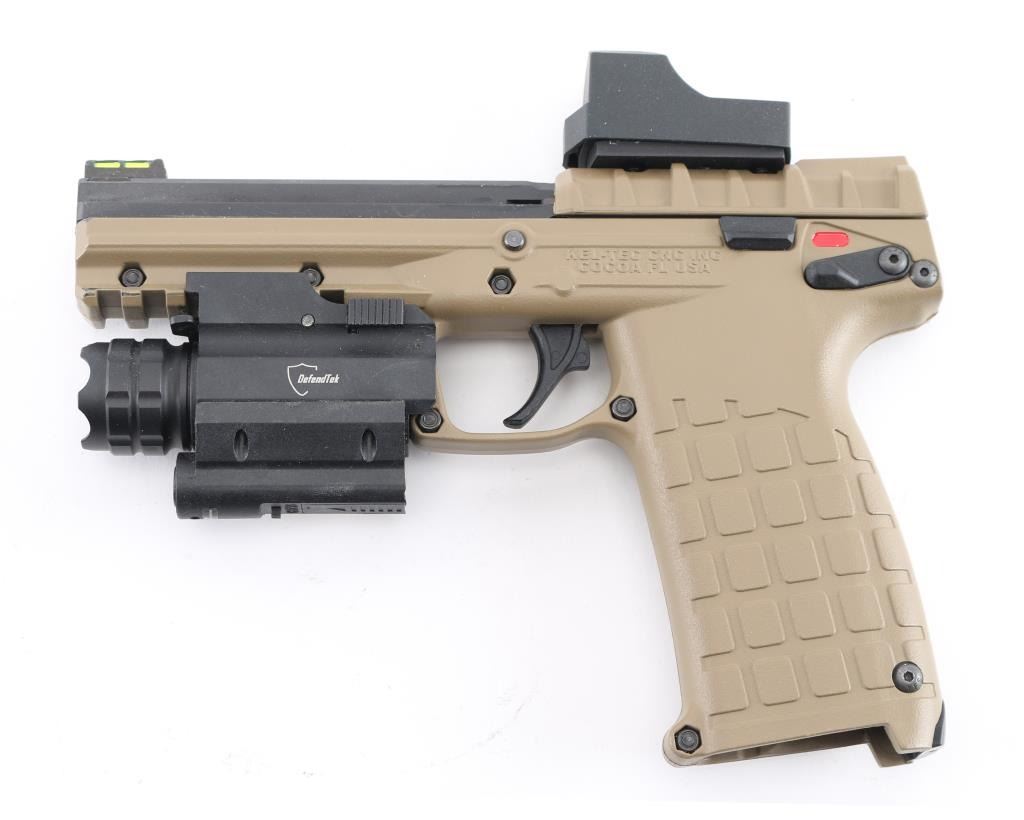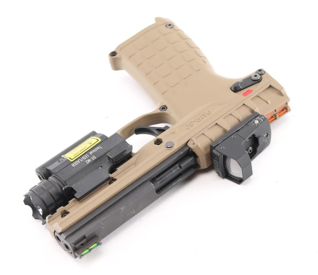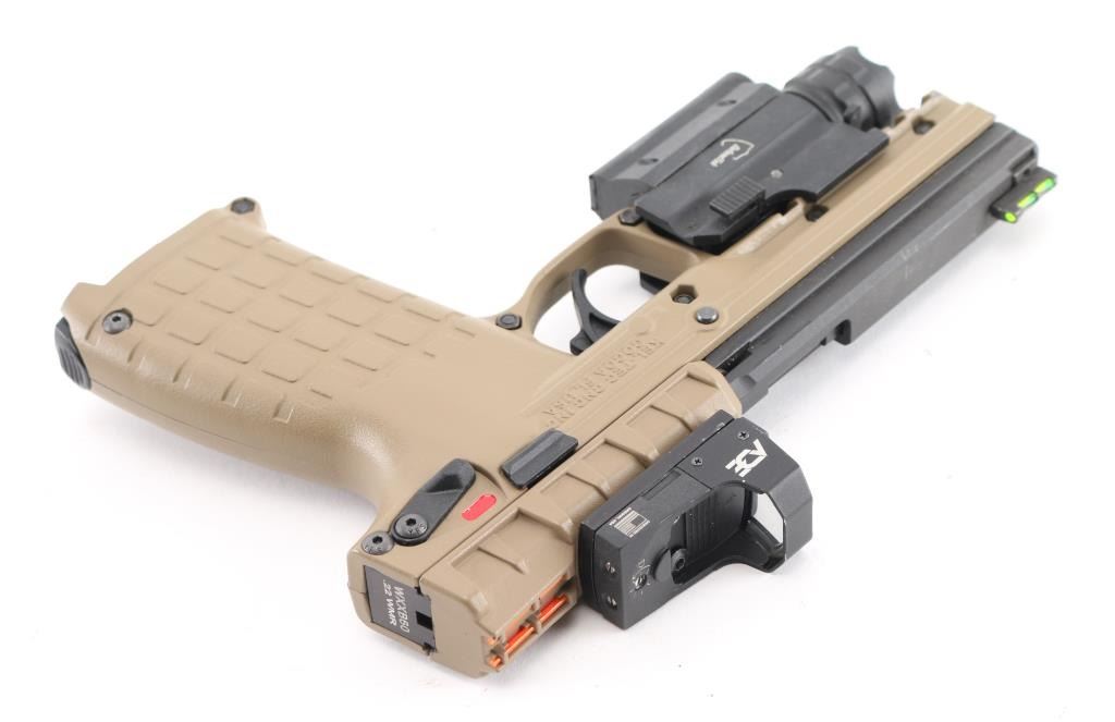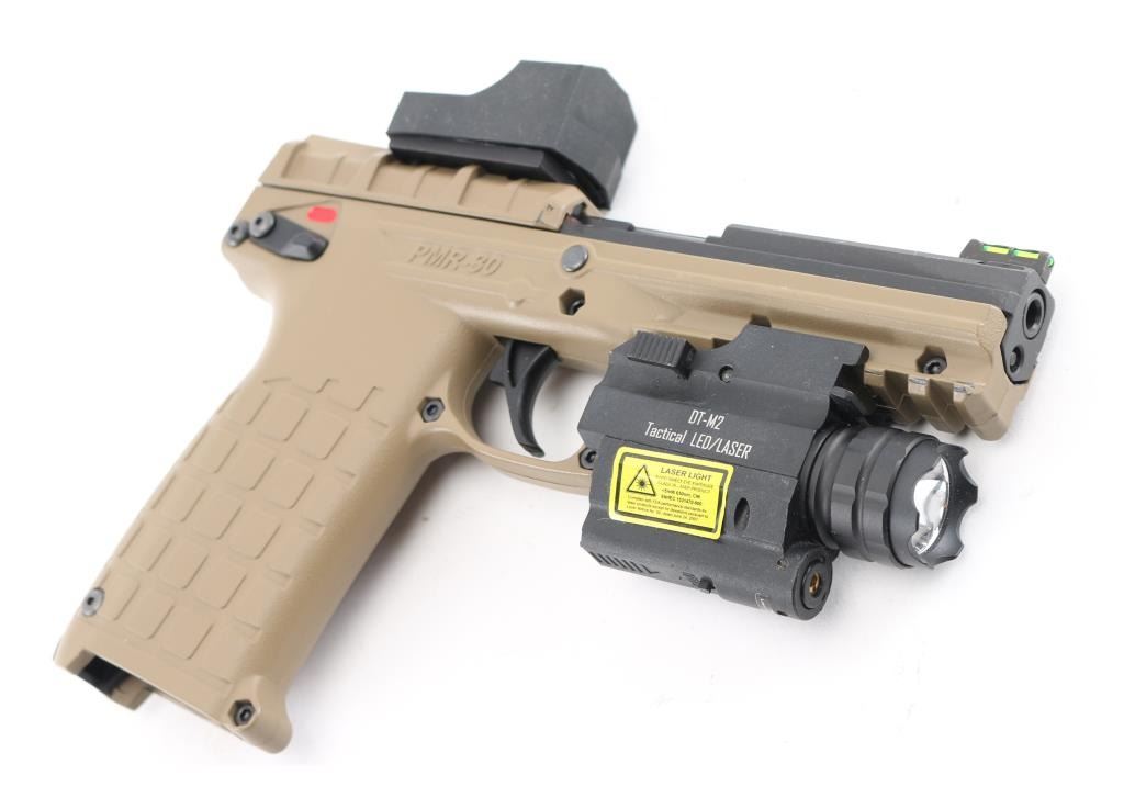 High capacity single action semi-automatic pistol chambered in .22 Magnum. Features a blued 4140 steel slide, 4.3" barrel, fiber optic three-dot sights w/ drift adjustable front sight, smooth trigger, concealed hammer, ambidextrous thumb safety, heel magazine release, factory 30 round magazine and desert brown polymer frame with integral accessory rail & textured grip. Includes green dot optical sight w/plate, tools for green dot and Hi Viz sights, white tactical light w/red laser, the original factory hard case with manual, trigger lock and spare magazine. Pistol is in new condition. Condition is NRA Excellent . Modern Firearm