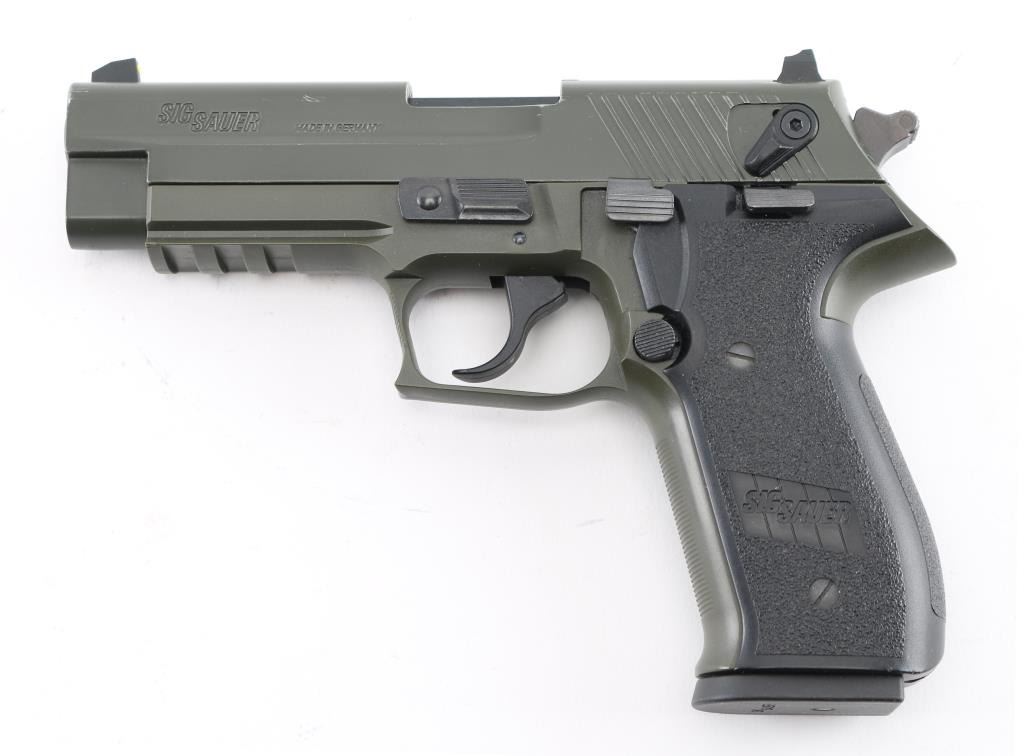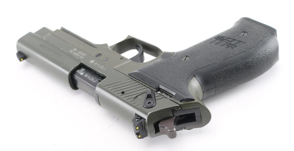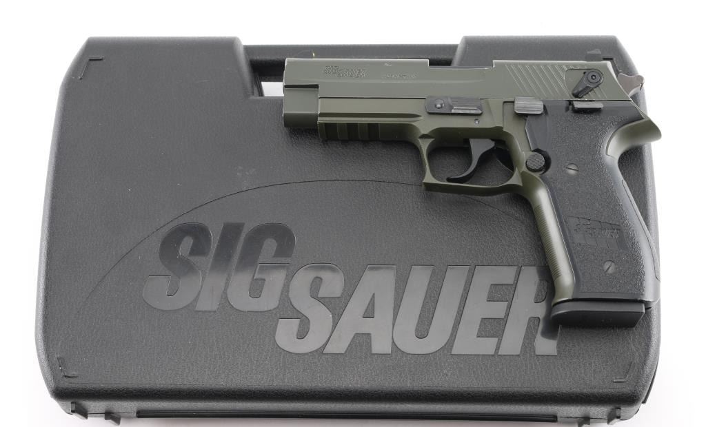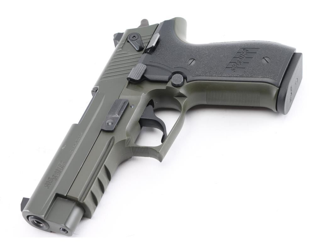 German made double action semi-automatic pistol chambered in .22 Long Rifle. Features a matte off-black finish, 3.9" barrel, three-dot high contrast sights with drift adjustable rear, ambidextrous thumb safety, smooth trigger, serrated round hammer spur, thumb decocker, push button magazine release, 10 round magazine, polymer frame with integral accessory rail and Sig two-piece textured black synthetic wrap-around grips. Includes the original factory hard case with (1) 10 round magazine, manual and lock. Pistol exhibits approximately 98% of it's original finish showing a couple scuffs to the matte finished slide with no other wear observed. Action is smooth, bore is excellent and polymer is fine. Condition is NRA Very Good. ***Modern Firearm***