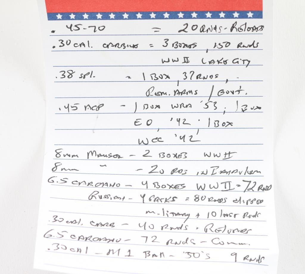 25 rounds 45-70. 150 rounds of 30 cal, 35 rounds of 38 special, 2 boxes of 8mm Mauser. 4 box of 6.5 Carcano and others.