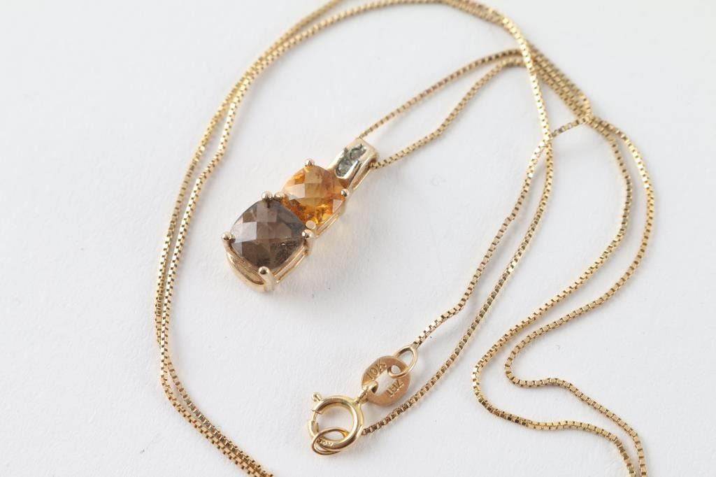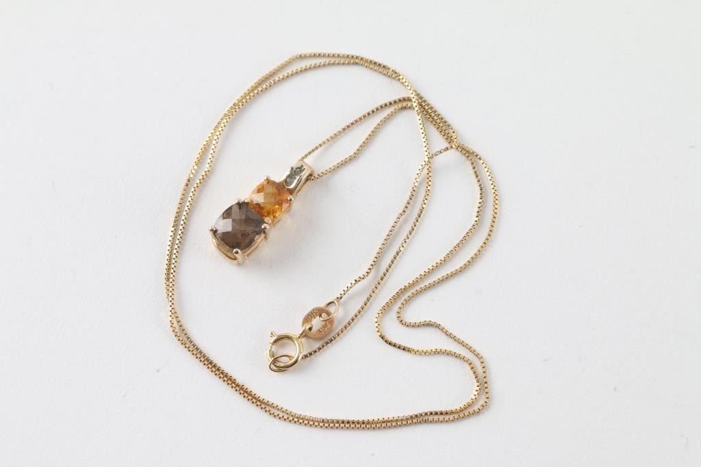 Featuring checkerboard cut smoky Topaz and citrine set in 10K yellow gold. Total weight of 2.20 grams.