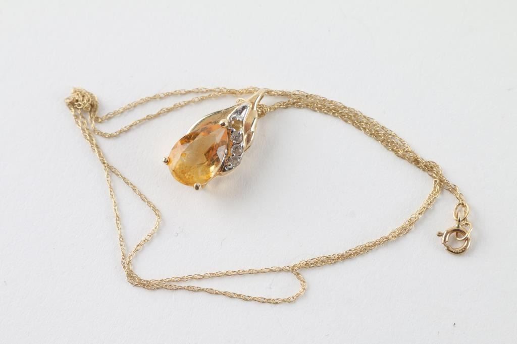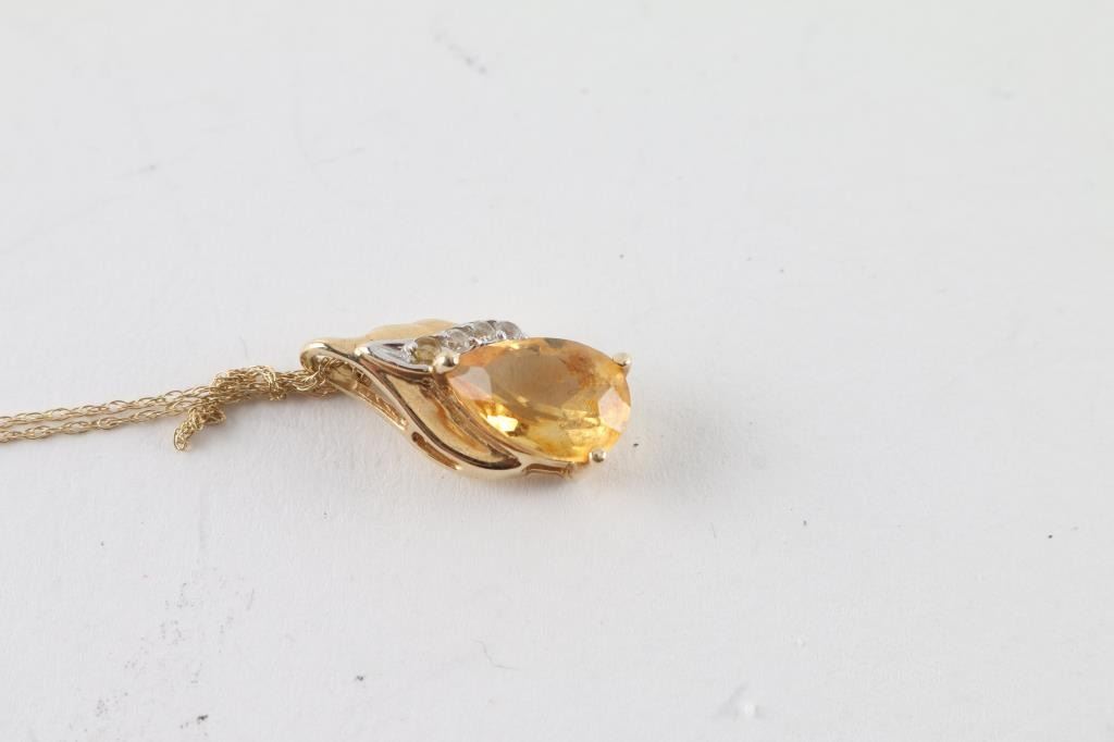 Set in 14k Yellow Gold, with 3 diamonds surrounding the pendant on chain.