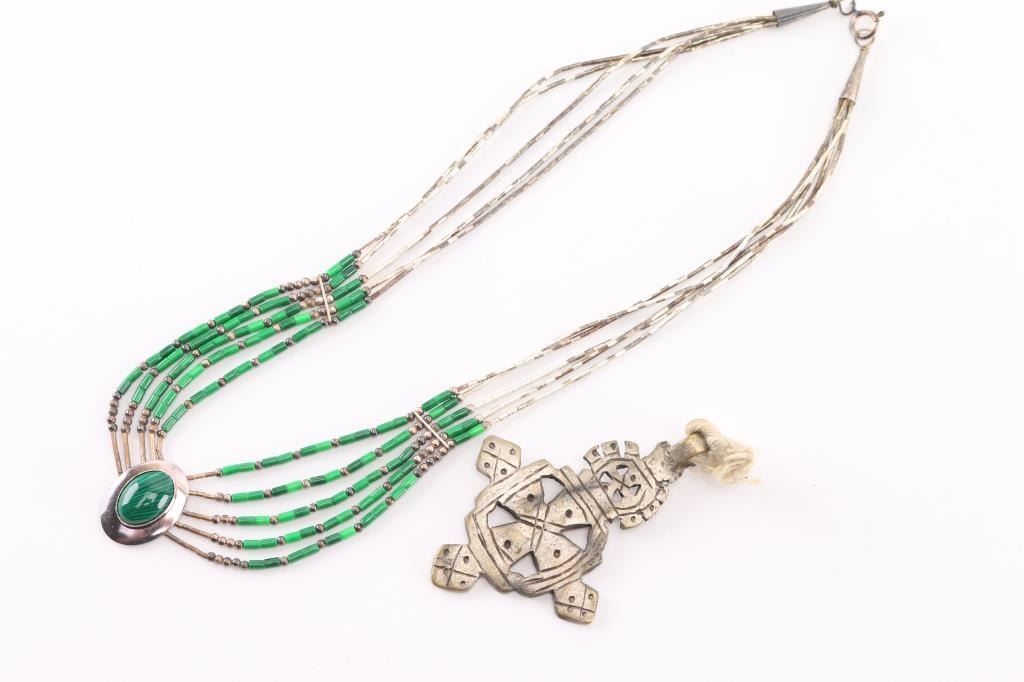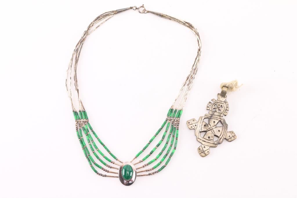 (1) Silver trade Cross Pendant (1) Strand Shimmering waters sterling and Malachite necklace with pendant.