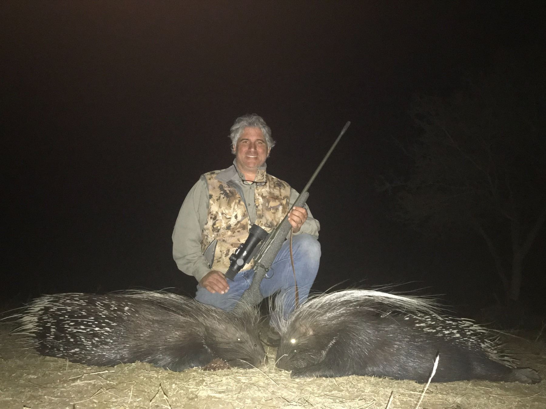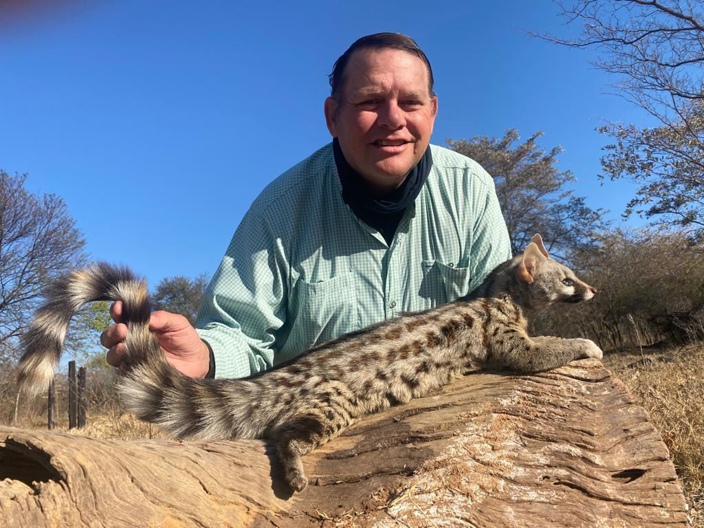 Description: Leon & Ilse Joubert invites you on an exciting night hunt in the Limpopo Province of South Africa. This hunt includes : 1 x Civet Cat+ 1 x Bushpig + 1 x Genet Cat + 1 x Jackal + 1 x Porcupine for 1 hunter. Recommended method of take is rifle or shotgun. Also included are accommodations in our thatched roofed en-suite chalets, all meals, non-alcoholic beverages, daily laundry, hunting vehicles, services of our professional hunters, skinners, trackers, field preparation of your trophies and free WIFI. We are fully solar operated, no loadshedding in our hunting camp. Not included: flights, taxidermy/dip & pack, and gratuities. Additional hunting days can be added at $400 per day. This hunt may be upgraded to include additional species from our price list.
