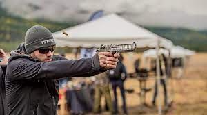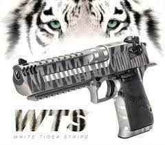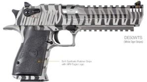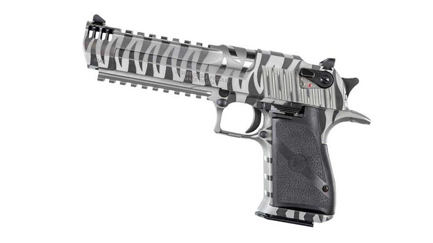 The White Tiger Stripe Desert Eagle pistol is from Magnum Research. Its White Tiger finish is created by alternating a pattern of matte and high polish stripes.