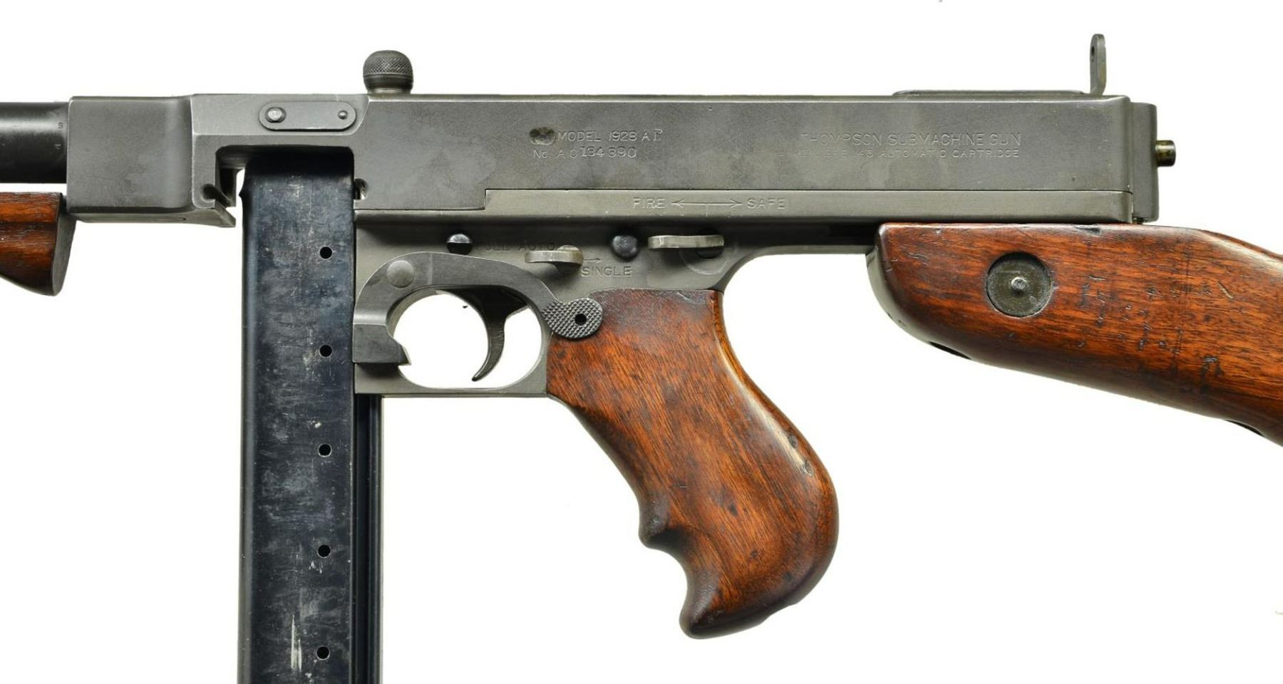 SMG. Cal. 45 ACP. S# AO134390. Bbl.10.5". Auto Ordnance Corporation manufactured Model 1928A1 Thompson with smooth replacement barrel. Barrel terminated with Auto-Ordnance marked Cutts compensator with bullet logo on left side and blade front sight. Lyman marked fixed peep sight. This is an "A.O." (Auto Ordnance) prefix serial number with matching lower assembly serial number. Vertical foregrip. Left side of receiver left factory originally marked "U.S. MODEL 1928A1" above serial number. The "U.S." has been removed, and a "C" over-stamped on the "1" so that it is now marked "MODEL 1928AC", which is typical for Thompsons that were sold by the U.S. Government to police agencies after World War II. Other left hand receiver markings include, "THOMPSON SUBMACHINE GUN / CALIBRE .45 AUTOMATIC CARTRIDGE". Right hand receiver markings include "AUTO-ORDNANCE CORPORATION" with Bridgeport address. Barrel, in front of receiver marked with an "S" on the left side, and with an "O" on the right side next to the index mark. NFA registry indicates Auto Ordnance as the manufacturer. MAGS: 1 Seymour blued 30 rd. CONDITION: matte blued finish is complete, w/ a darker finish on upper receiver and more of a gray tone on lower receiver. Some thinning on high spots and in areas of mechanical intervention. Bluing on barrel uneven. Buttplate has a smooth lustrous finish, thinning on top and at bottom. Wood furniture is matching dark brown with typical impressions, heaviest on right side of pistol grip and left side of stock. Bright bore with strong rifling. Select fire mechanism has been disabled to fire only fully automatic due to Connecticut state restrictions. Fire control mechanism appears to function correctly when cycled by hand. NATIONAL FIREARMS ACT MG REQUIRING BATF TRANSFER BEFORE TAKING POSSESSION. FULLY TRANSFERABLE. (03-1610/JZ). CURIO. $30,000-40,000.