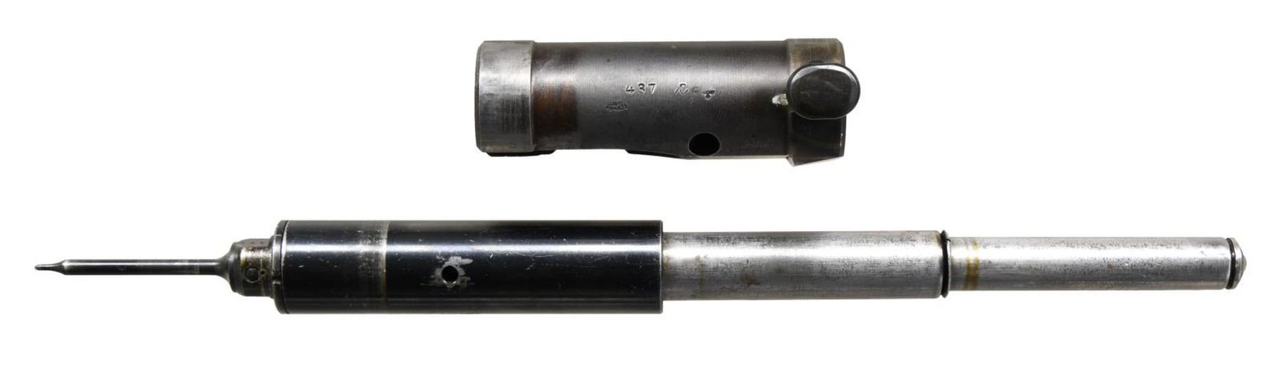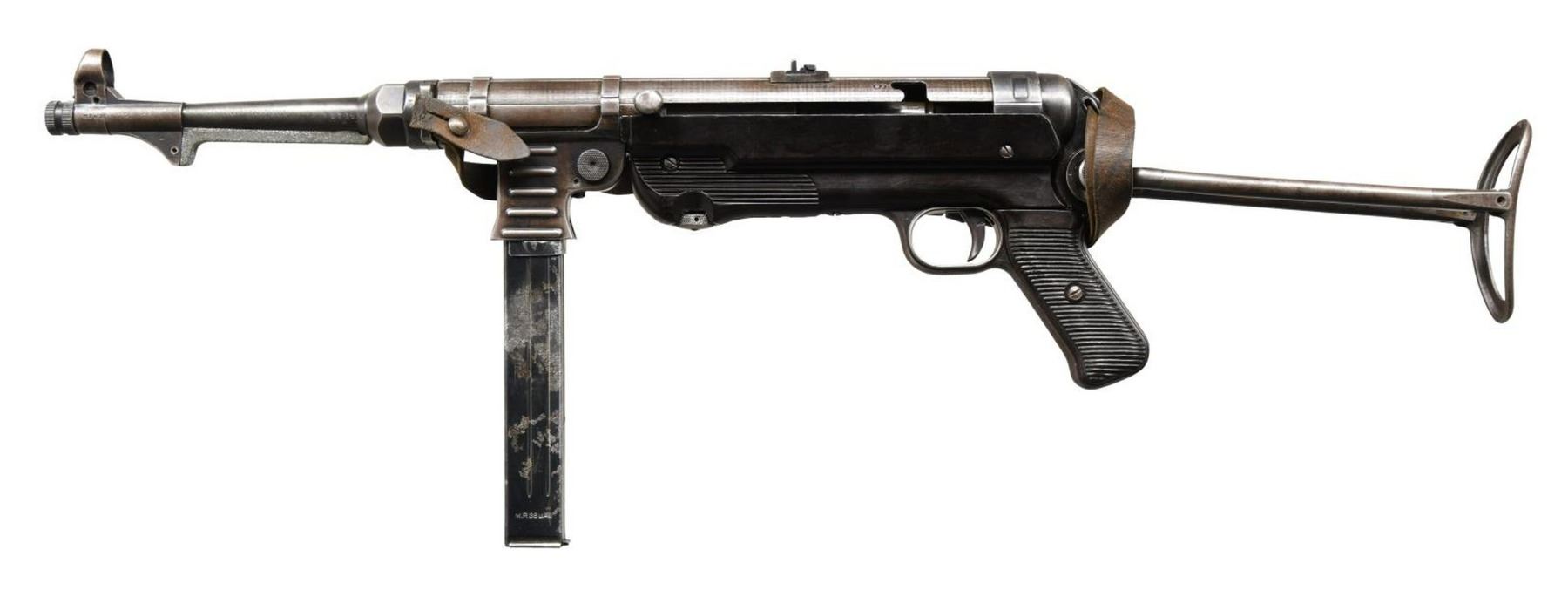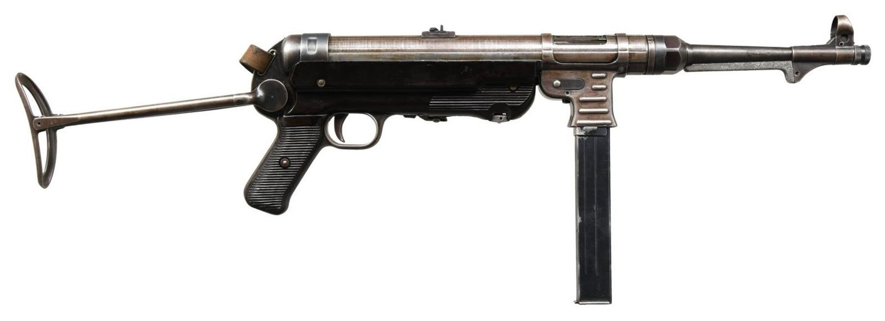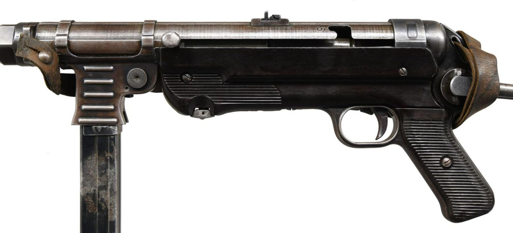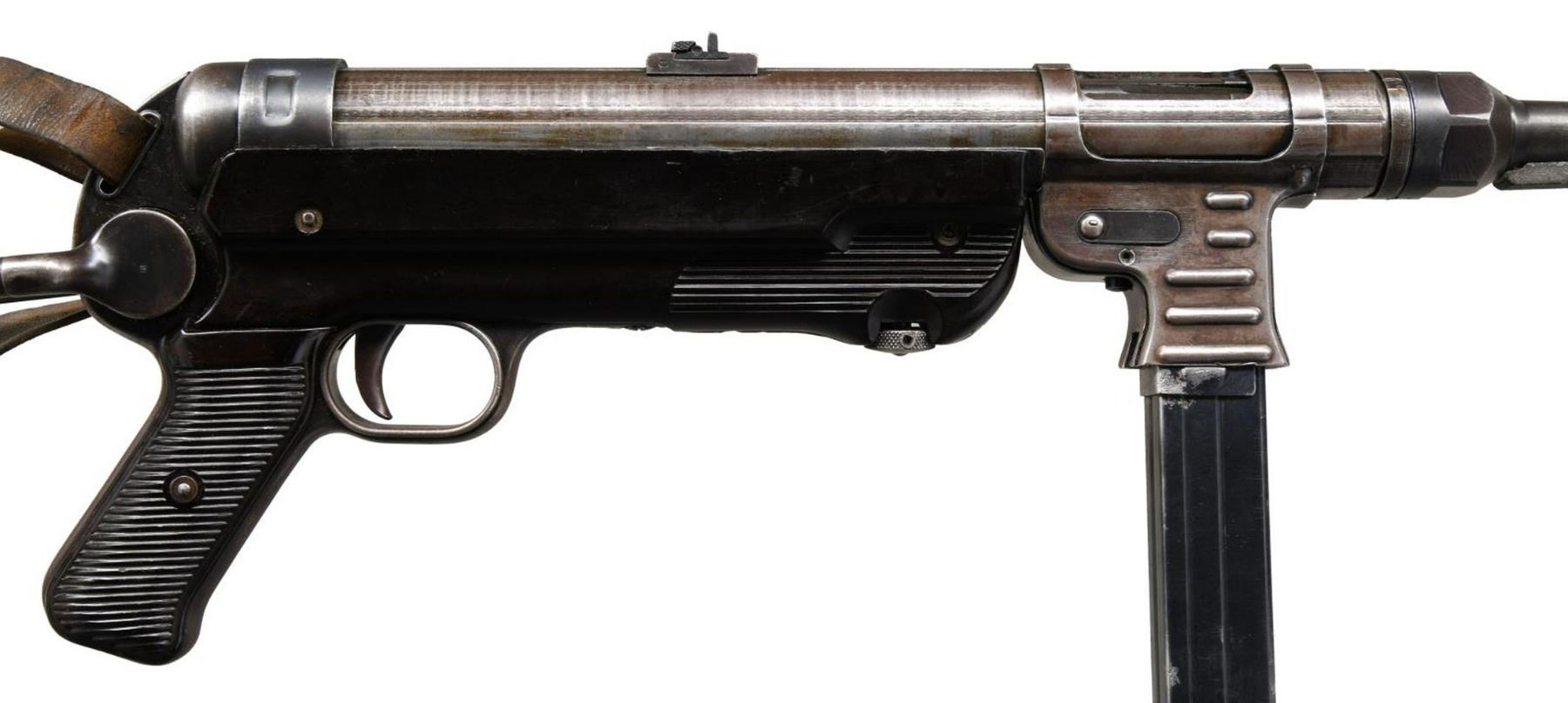 WILSON REGISTERED TUBE. Cal. 9mm. S# MP-126. Bbl. 9 9/10”. Hooded fixed blade front sight, rear sight is windage drift adj. 2 Piece folding leaf. Of all the German WWII era SMGs, the MP40 may be the most iconic of them all. Its slow cyclic rate combined w/ decent sights & pleasant ergonomics make it as fun to operate as it is interesting to look at. It utilizes a very simplistic, yet incredibly smooth open bolt firing mechanism. The recoil system is typical of German over engineering consisting of a 3 piece telescoping rod w/ a captured spring that doubles as the connection point for the firing pin which slides inside of the bolt. The safety mechanism is an extremely simple design which shares commonalties w/ other WWII era SMGs. It consists of a rearward notch that interfaces w/ the cocking handle holding the bolt to the rear. Manufactured in 1941 by Steyr-Daimler-Puch AG as designated by receiver code “bnz.41”. This MP40 utilizes a 3d generation mag. housing which includes the ribs for strength & square notch facing the shooter. Waffenamts appear on multiple parts as well as makers codes. Under folding stock, dark brown Bakelite grips & lower receiver cover. Aluminum resting bar. Original in appearance, extruded w/ ribs, receiver tube has Wilson Arms stamp under trigger group. Period correct thin brown leather sling. MAGAZINES: 1 steel 32 rd. UNATTACHED ACCESSORIES: FBP fixed firing pin bolt & recoil assembly. CONDITION: Original finish has browned & thinned into natural hues as typical w/ examples from this period. Most numbered parts not matching. Bakelite trigger group in nice condition w/ no visible blemishing aside from a few light scratches & impressions. Aluminum resting bar heavily oxidized. Good bore w/ strong rifling. Stock locks correctly in both folded & extended positions. Fire control mechanism appears to function correctly when cycled by hand. THIS IS A NATIONAL FIREARMS ACT FIREARM REQUIRING BATF TRANSFER BEFORE TAKING POSSESSION. FULLY TRANSFERABLE. (03-1641/JZ). CLASS III. $18,000-27,000.
