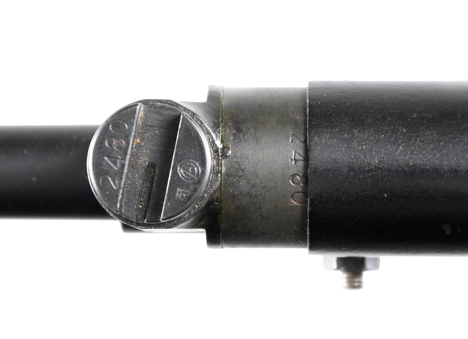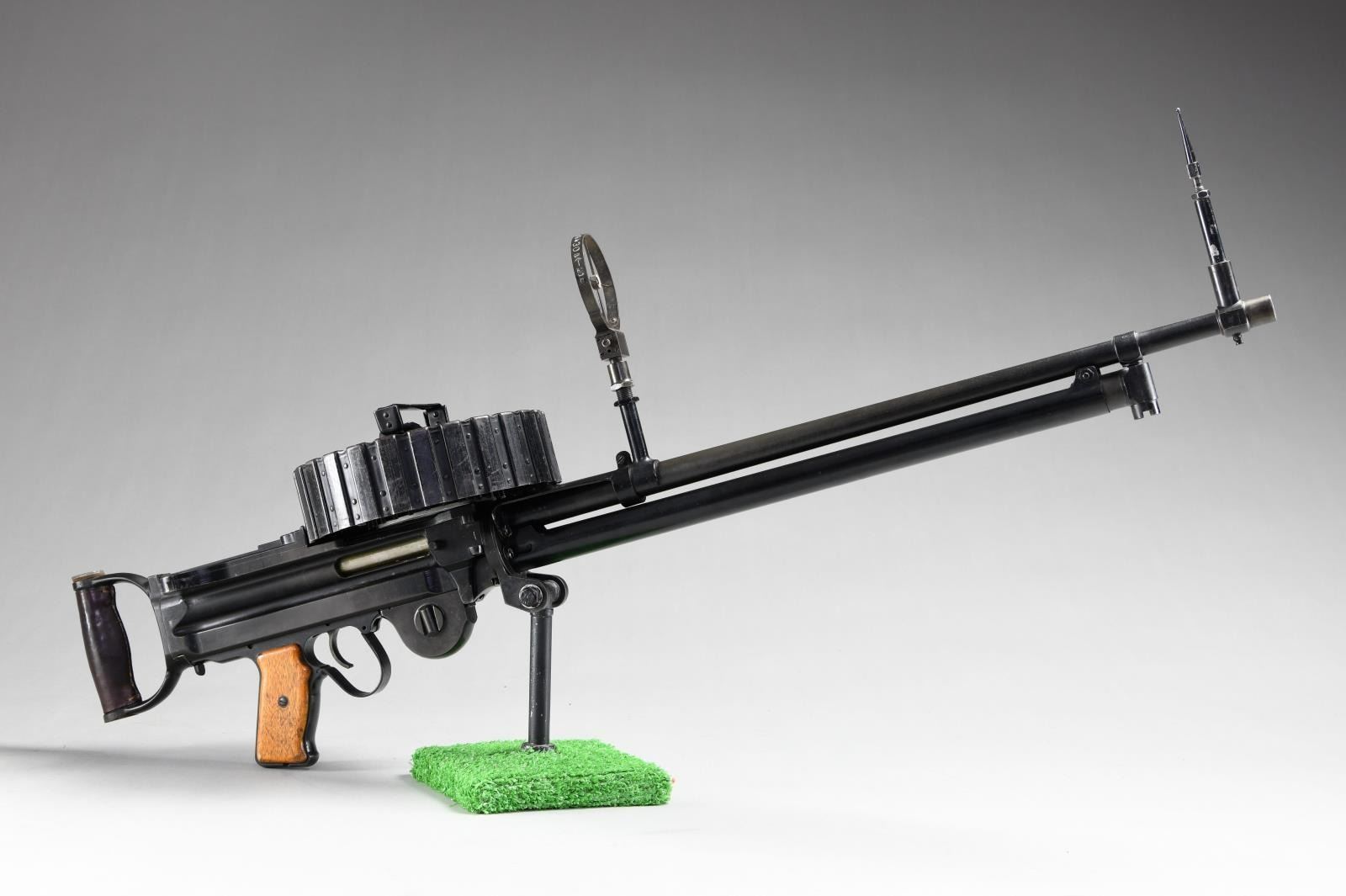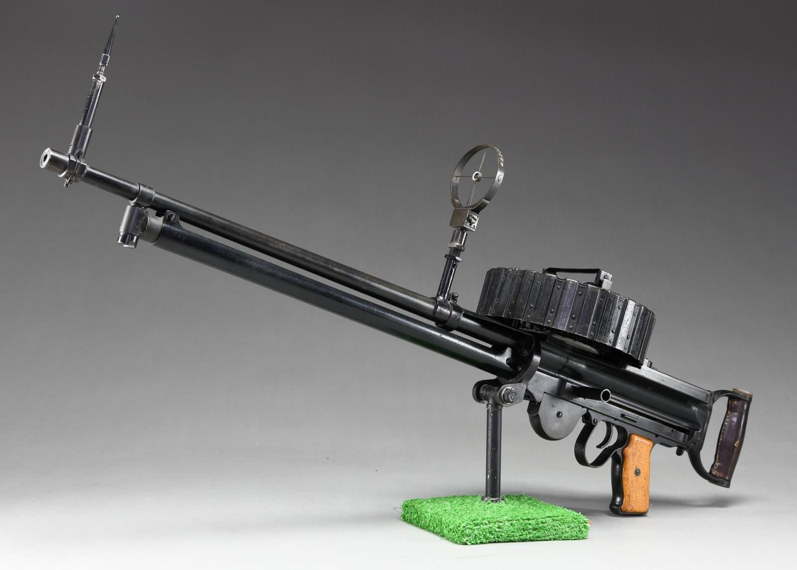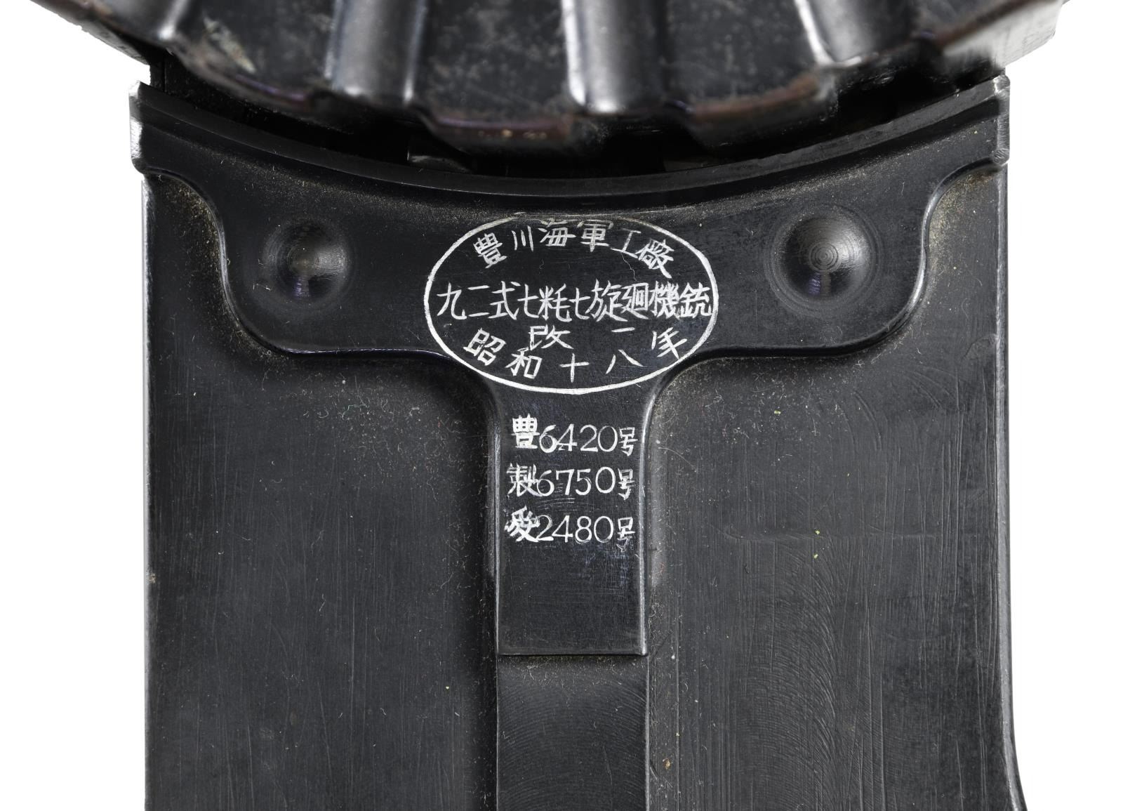 Cal. 7.7mm Rimmed. S# 2480. Bbl. 26". Mfg. 1943. Open bolt, gas operated machine gun, fed from a 97 round pan magazine. First adopted by the Japanese in 1932 & utilized in both the Army & Navy. Originally introduced as the Type 91 Navy Aircraft Machine Gun. When production began in 1932, there was a high percentage of parts that were actually interchangeable w/ the British Lewis Gun. The most obvious difference between the Japanese & the British Lewis is the left side position of the charging handle on the Japanese gun, where it was positioned on the right by the British. It utilizes a leather wrapped single spade grip positioned at the rear of the receiver, which doubles as an oil reserve, hosting a long brush beneath the threaded steel cover. The trigger mechanism is located forward of a single pistol grip located below the action inside an elongated trigger guard. The sights are unique to the aircraft guns, consisting of a rear mounted circle, measuring 3" in diameter w/ a smaller circle in the center & wires running through the center, much like a traditional crosshair. The front sight is a tall post. Unlike many traditional Lewis guns, there is no large, round barrel jacket, or radiator on the Aircraft variant, but just an exposed barrel & gas tube, much like a typical Japanese machine gun. The finish on all exposed metal parts is a dark black mixed w/ traditional bluing. Several Japanese markings on barrel shroud & receiver, highlighted in white and easy to read, not so easy to translate. Some receiver markings, below top mounted drum translated to; "AIKAWA NAVY ENGINEERING EDITION / TYPE92 7.7 / SWOWA YEAR 18". Other markings include an anchor below serial number. MAGS: 1 steel 97 rd. pan. UNATTACHED ACCESSORIED: Small pedestal mounted on 6"x6" board for display. CONDITION: Finish is complete & consistent. w/ remarkable coverage. Markings are all clear, most highlighted white, and easy to read. Pan magazine appears equally clean. Barrel is slugged w/ steel rod, though dewat process appears to have been done meticulously so as not to affect other internals. Fire control mechanism appears to function smoothly & correctly when cycled by hand. NATIONAL FIREARMS ACT DEWAT MG REQUIRING BATF TRANSFER BEFORE TAKING POSSESSION. FULLY TRANSFERABLE.(03-1631/JZ). CURIO CLASS III. $8,000-12,000.